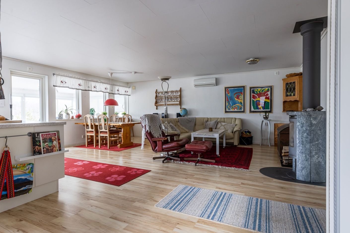 Redan i hallen möts du av en praktisk entré med goda avhängningsmöjligheter. Vidare in i bostaden öppnar det ljusa allrummet upp sig, där stora fönsterpartier släpper in rikligt med dagsljus och bjuder på en fin kontakt med omgivningen. Här finns gott om plats för både matgrupp och soffhörna vilket skapar en naturlig samlingspunkt för hela familjen. En värmande eldstad bidrar till den där eftertraktade fjällkänslan och gör kvällarna extra mysiga.