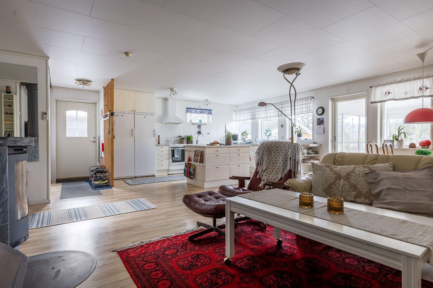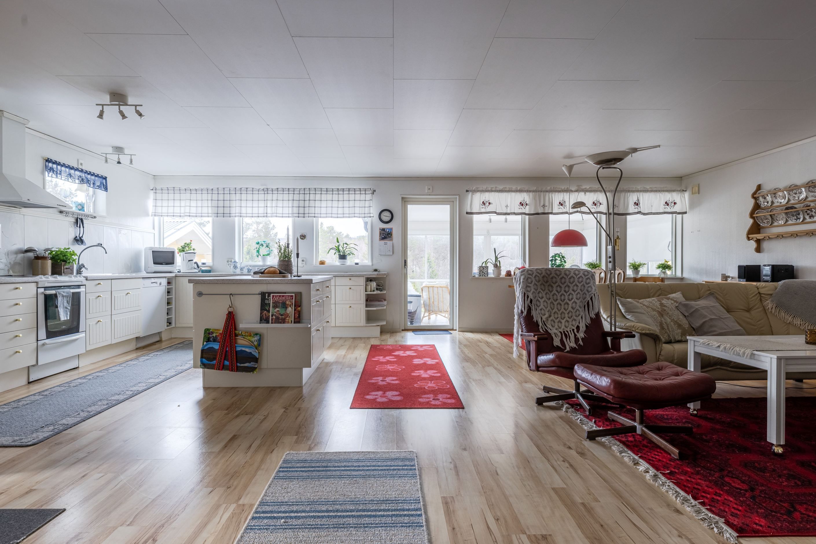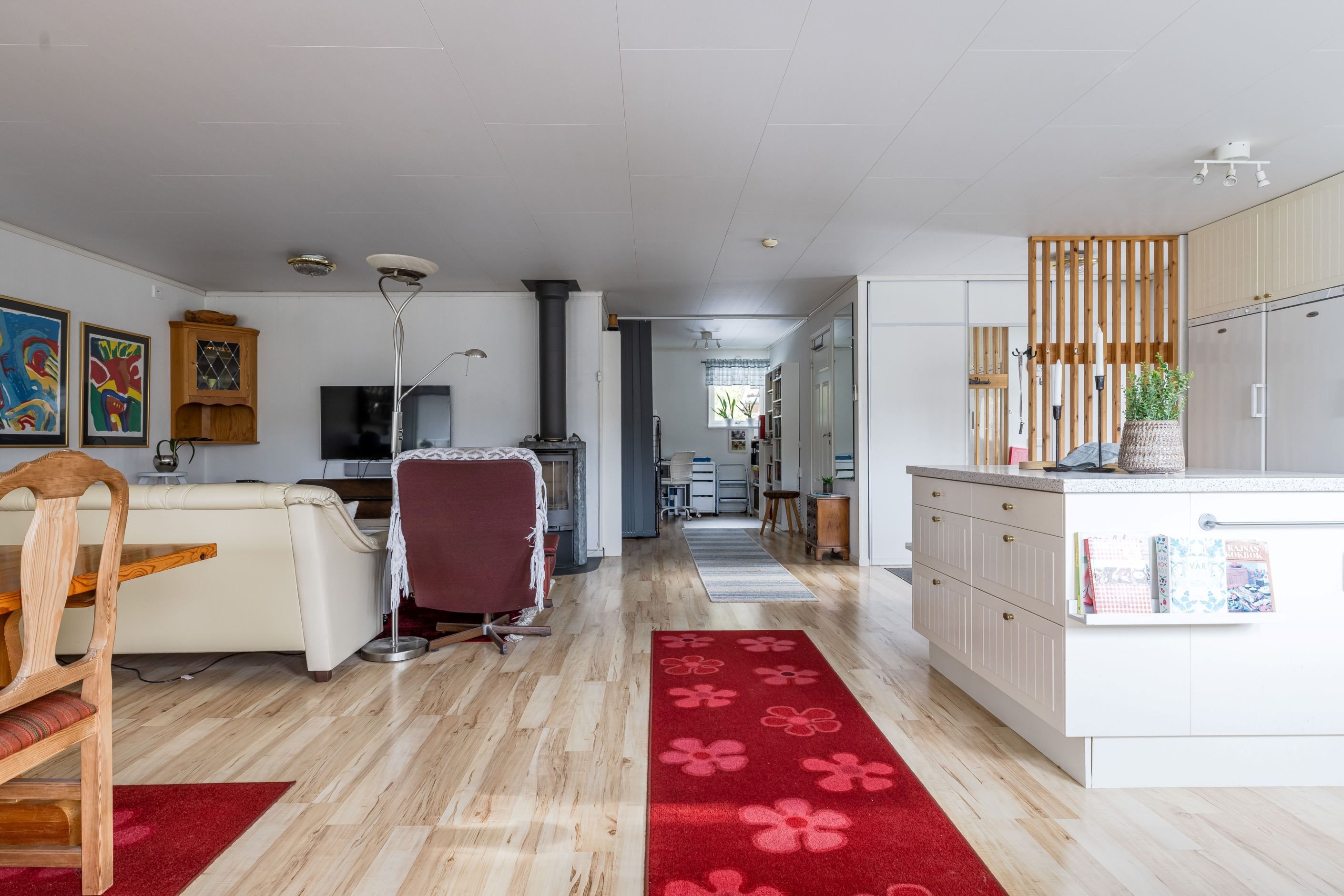 Köket är funktionellt och välplanerat med bra arbetsytor och förvaring – en plats där det är enkelt att laga allt från snabba måltider till långa middagar med vänner och familj. Intill allrummet skapas en öppen social yta där samtalen får fortsätta medan maten förbereds.