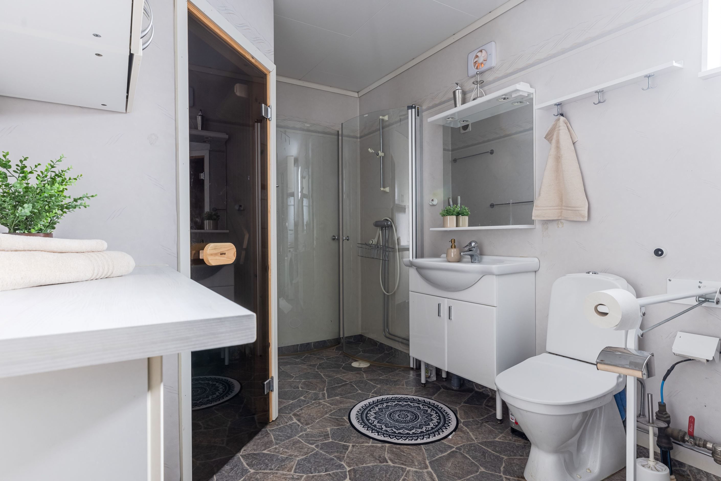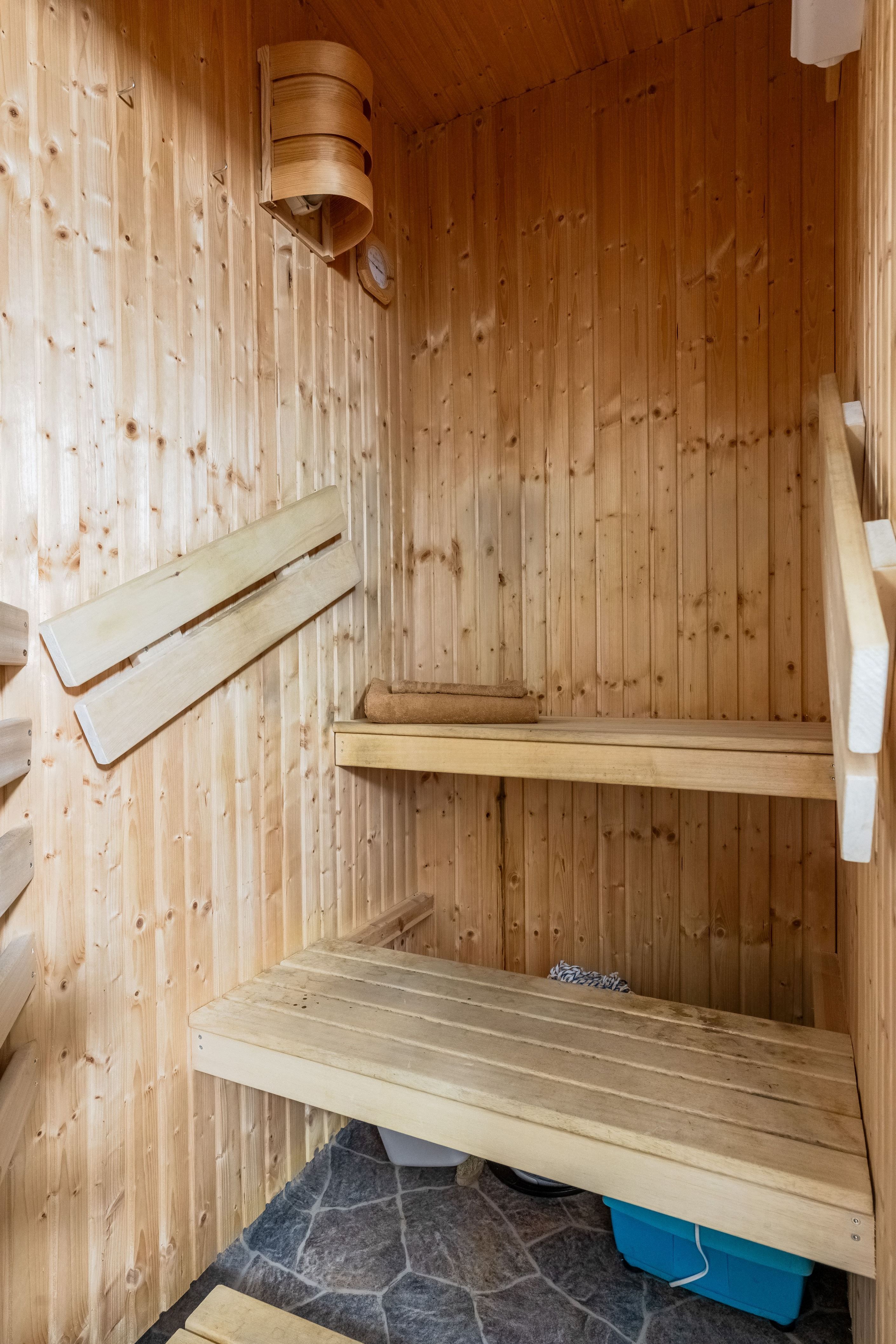 Badrummet är praktiskt utformat med slitstarka material, med en värmande bastu intill.
