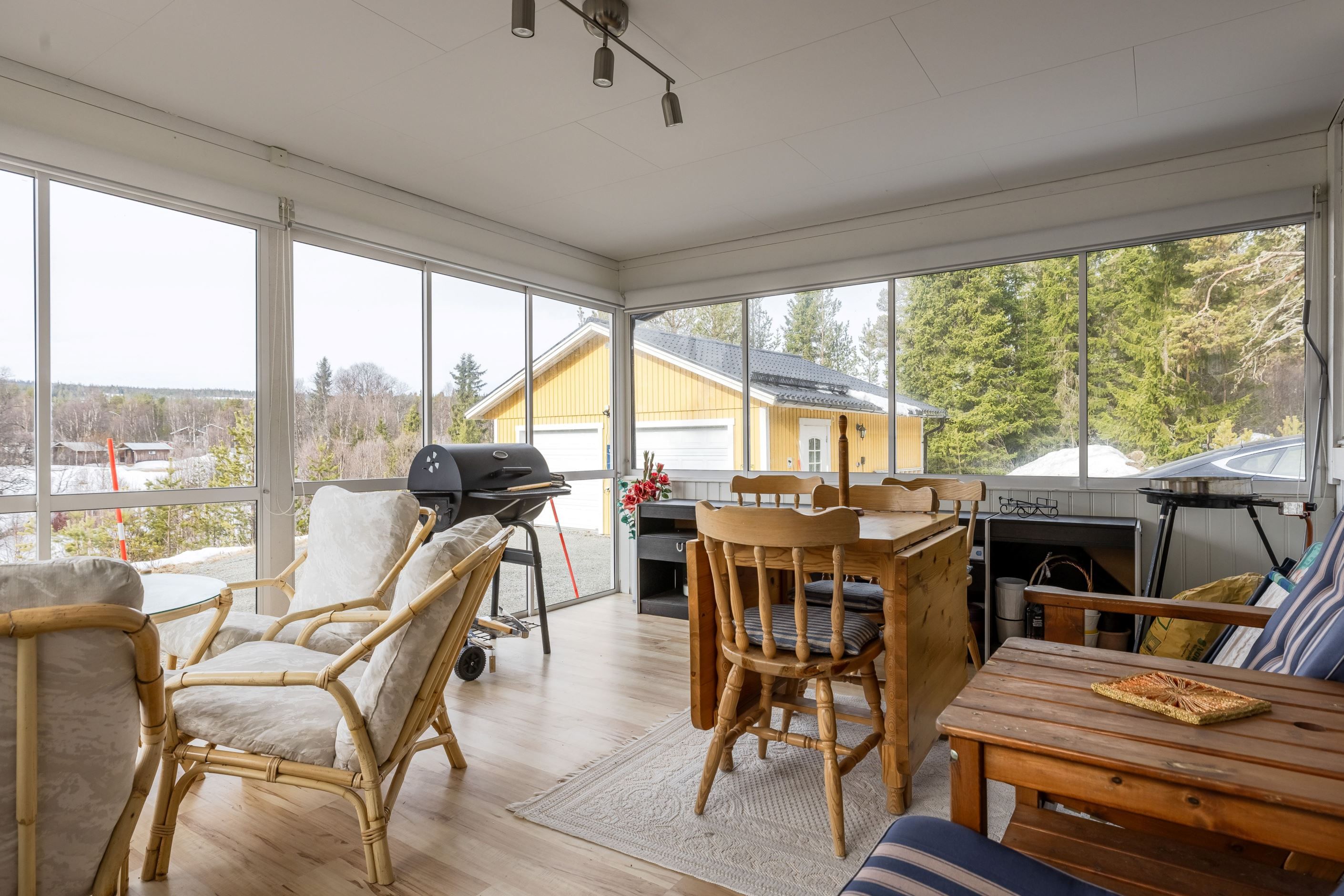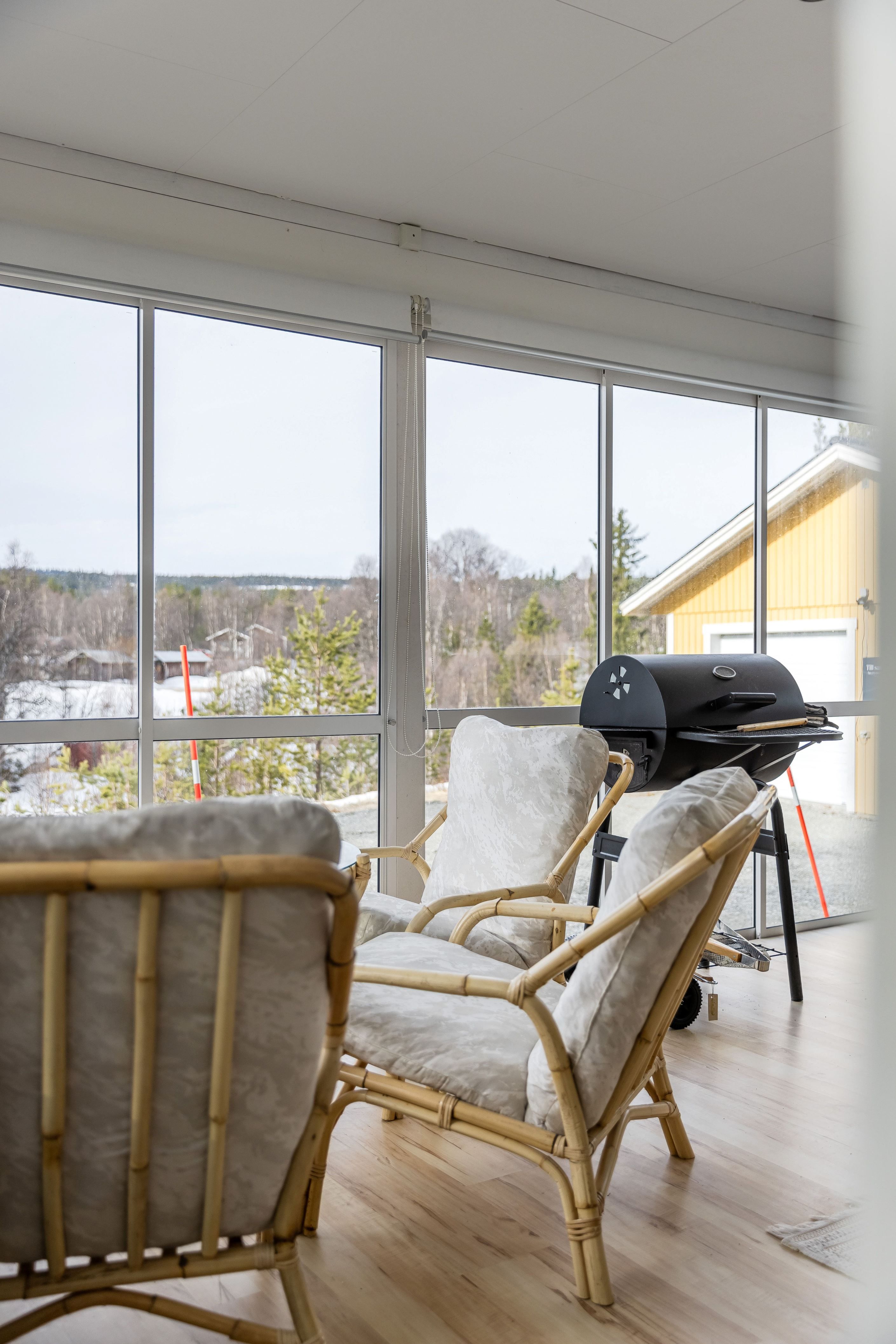 Utomhus väntar en härlig inglasad altan där du kan njuta av den fina naturen oavsett om det handlar om morgonkaffe i solen, lunchpauser mellan aktiviteter eller lugna hemmakvällar i goda vänners lag.