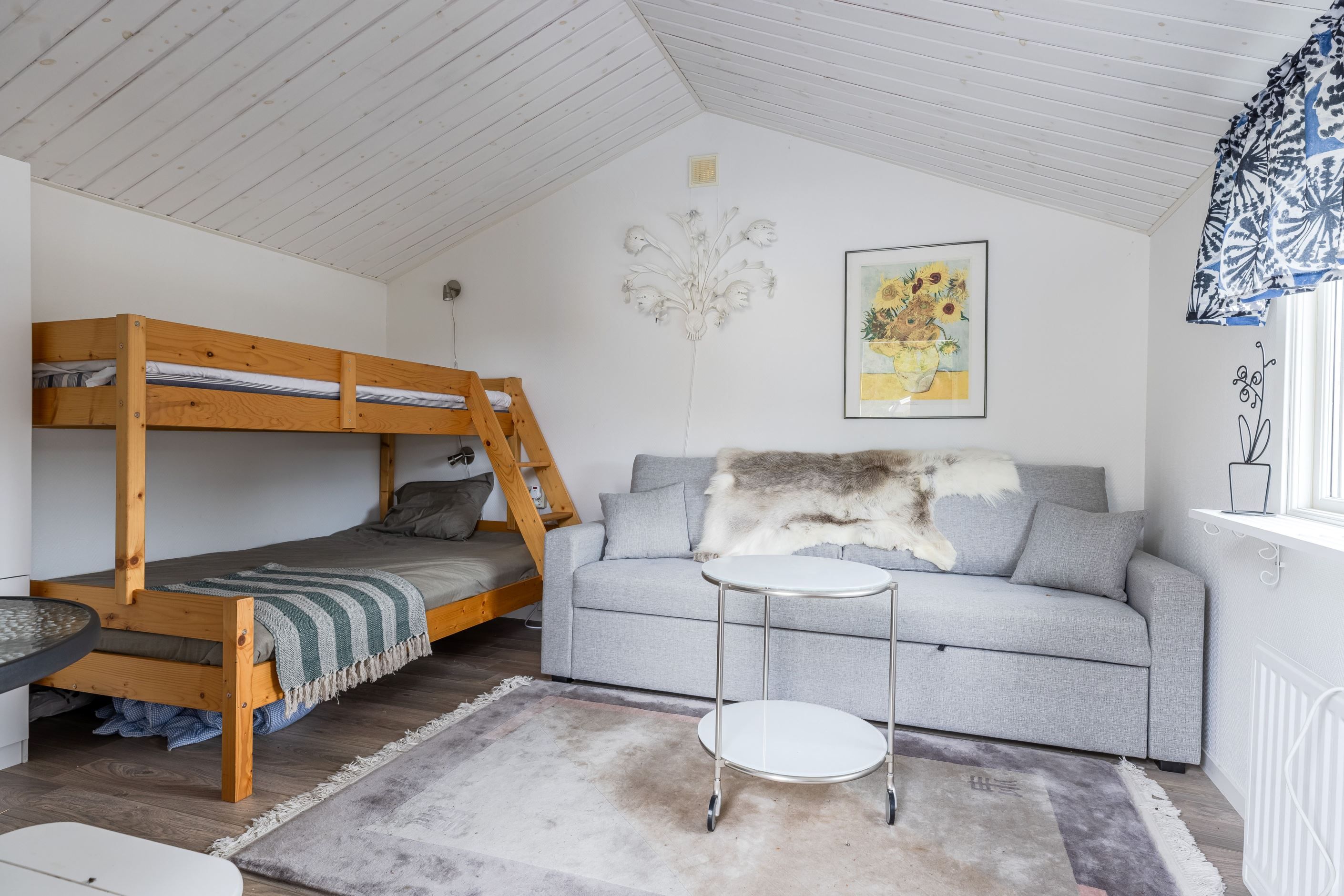 Lillstugan/gäststugan erbjuder ett ytterligare boende med en våningssängar samt en bäddsoffa med en garderob intill, vilket gör den både flexibel och bekväm för gäster eller större familjer som behöver ytterligare sängplatser.