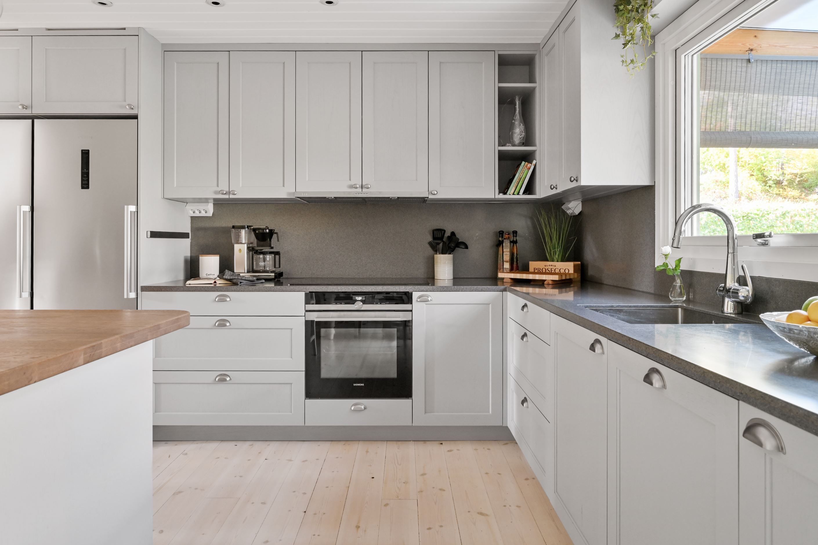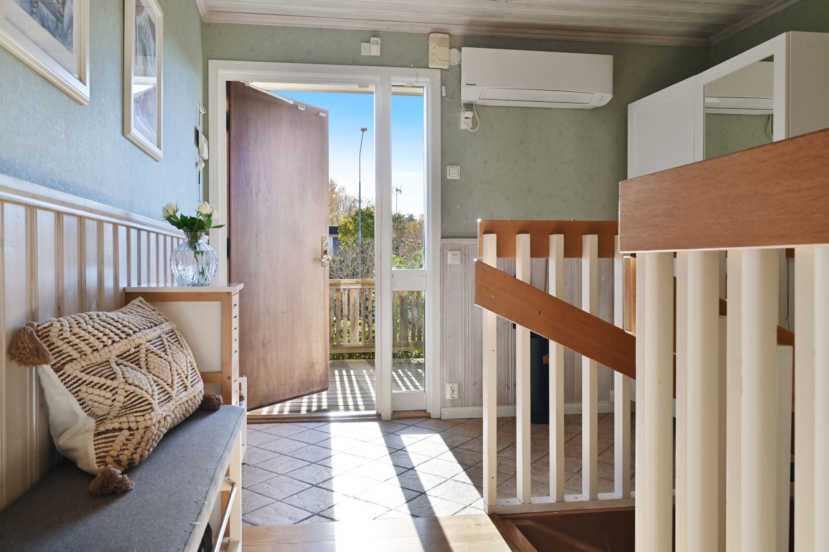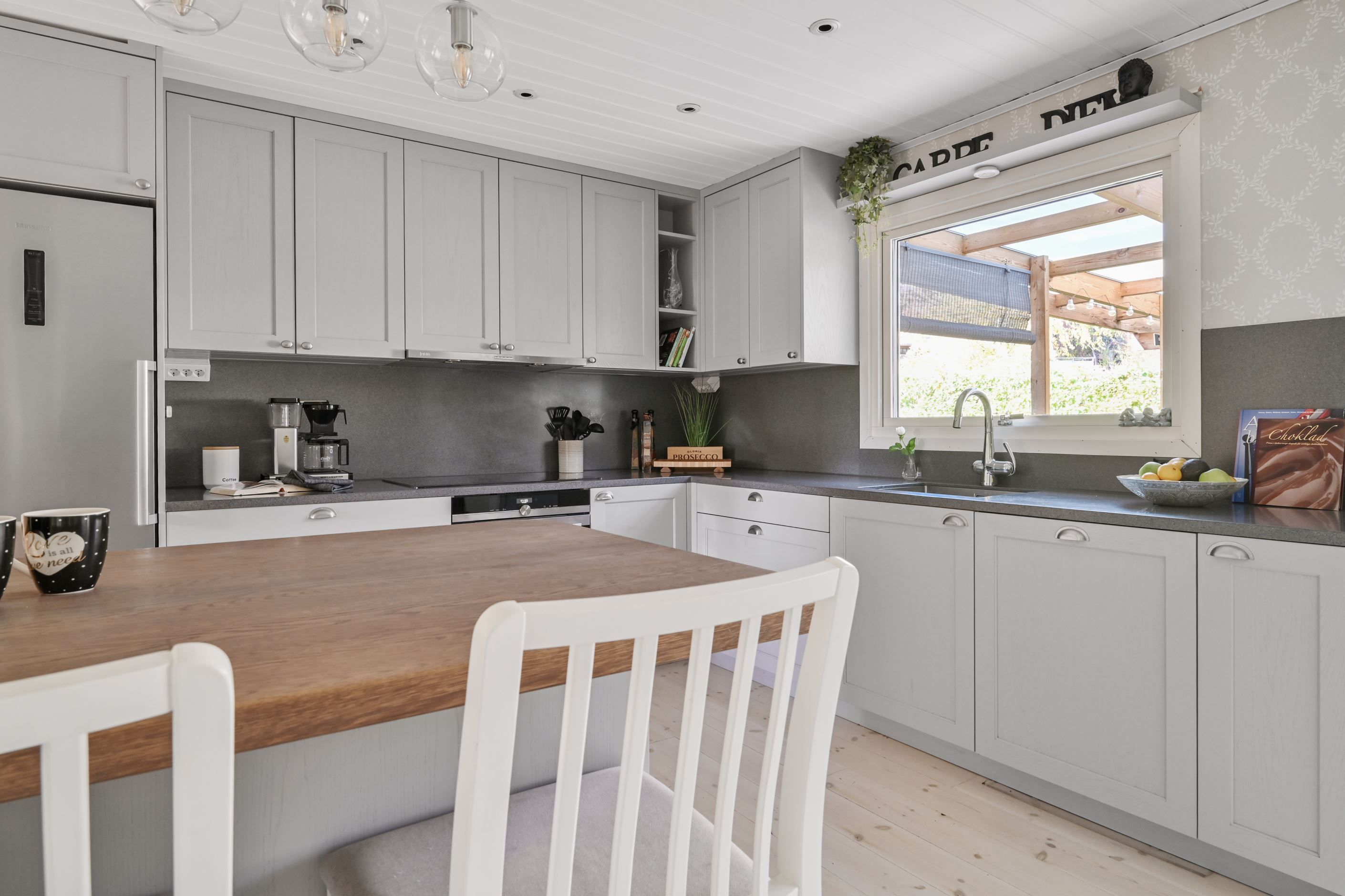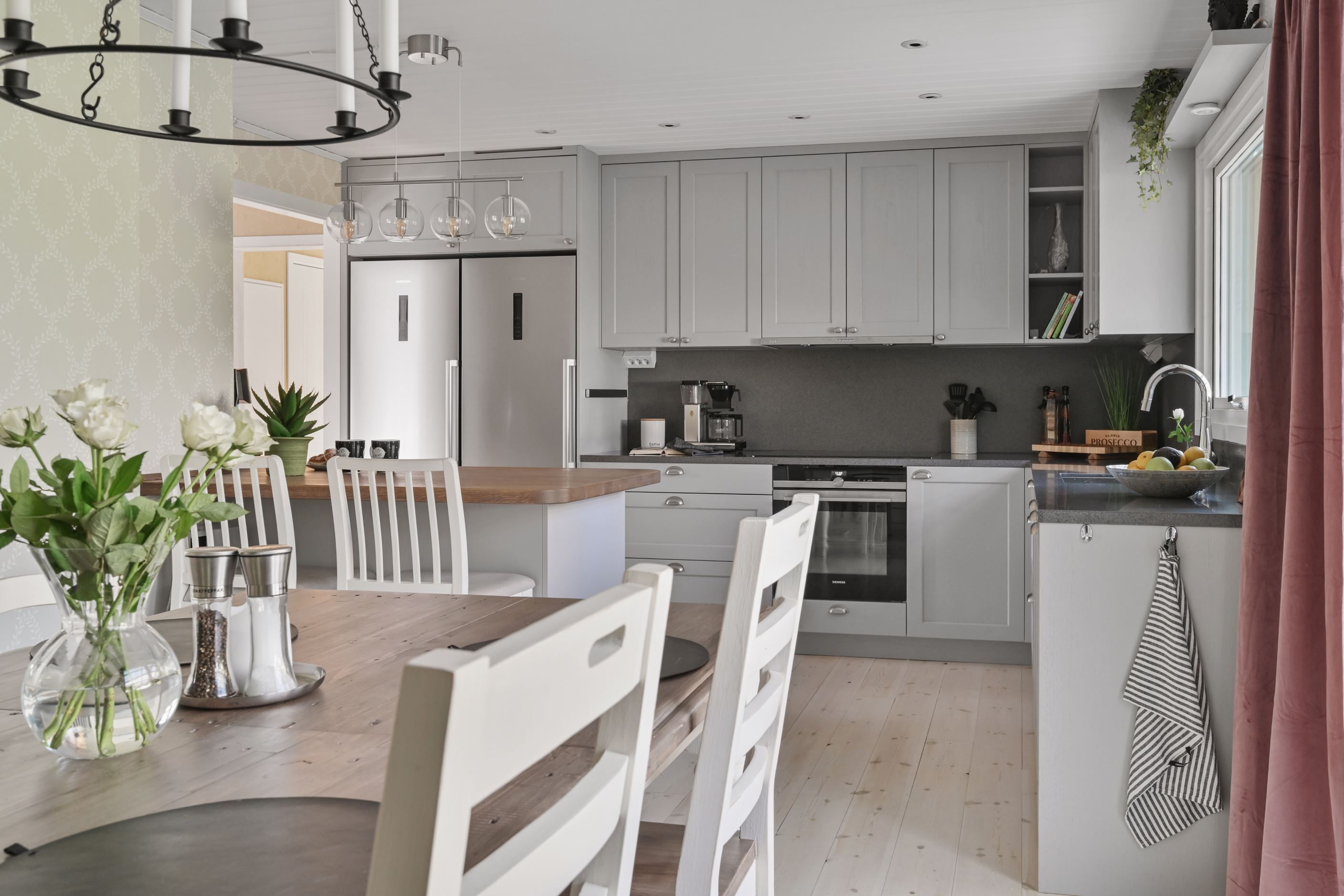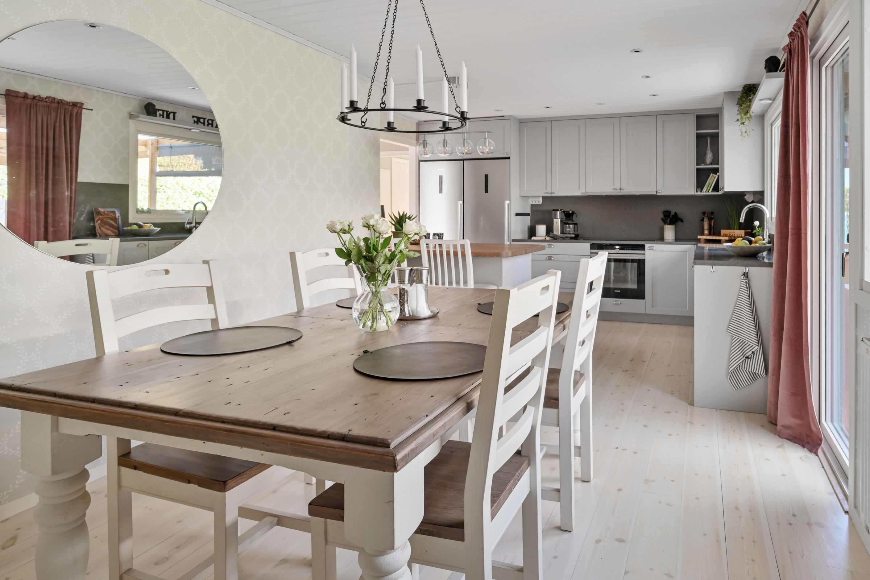 Väl inne i bostaden välkomnas du av en praktisk hall med klinkergolv och golvvärme samt bra plats för avhängning. Hallen leder vidare in i det öppna och ljusa, lyxiga och platsbyggda köket – husets naturliga samlingspunkt. Köket har gott om förvaringsskåp, generösa arbetsytor och en stor köksö med träskiva som erbjuder både funktion och social yta. Intill finns utrymme för matbord, och via altandörr i helglas når man trädgården och den takförsedda uteplatsen – vilket skapar en fin koppling mellan inne och ute.