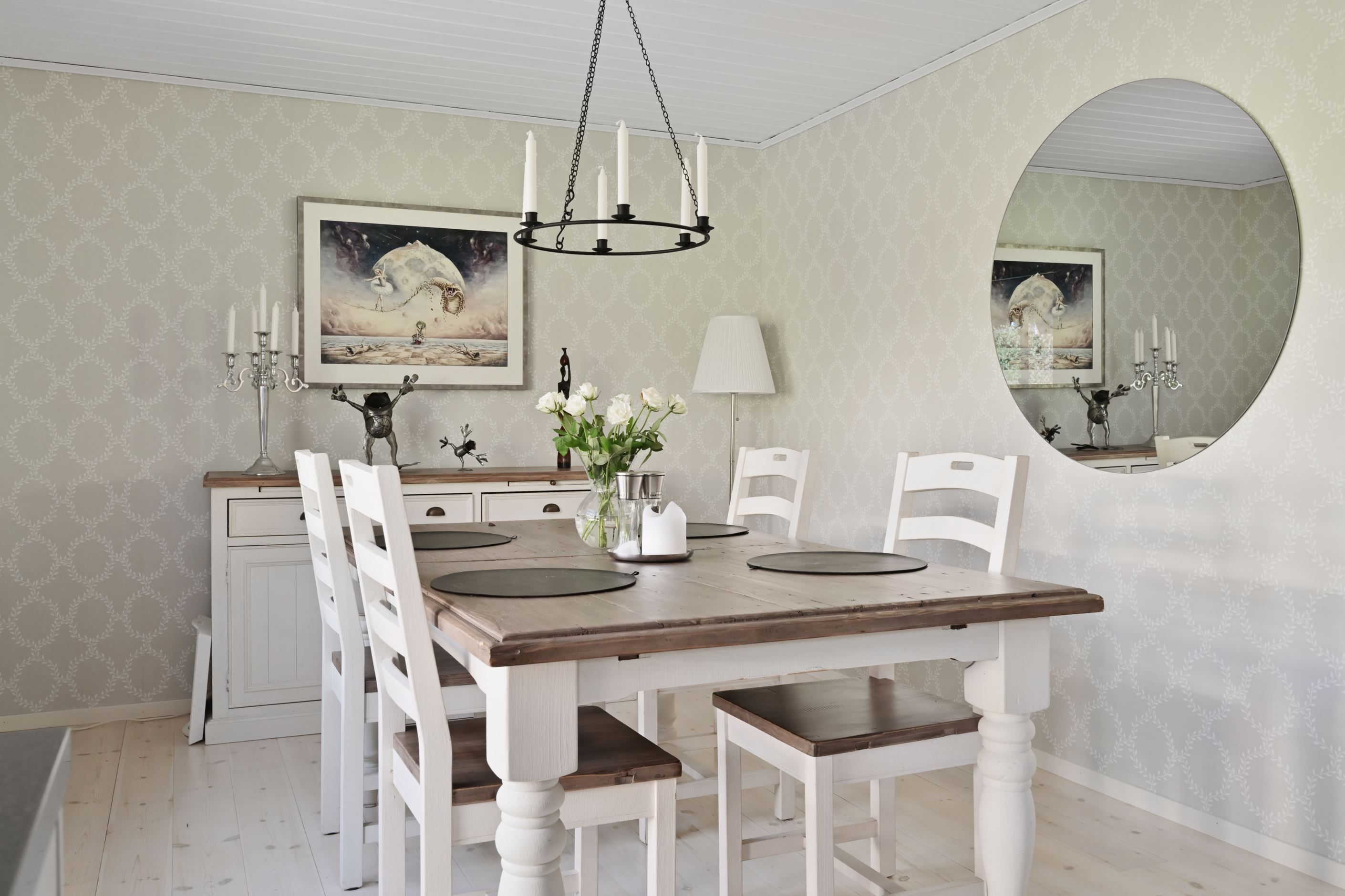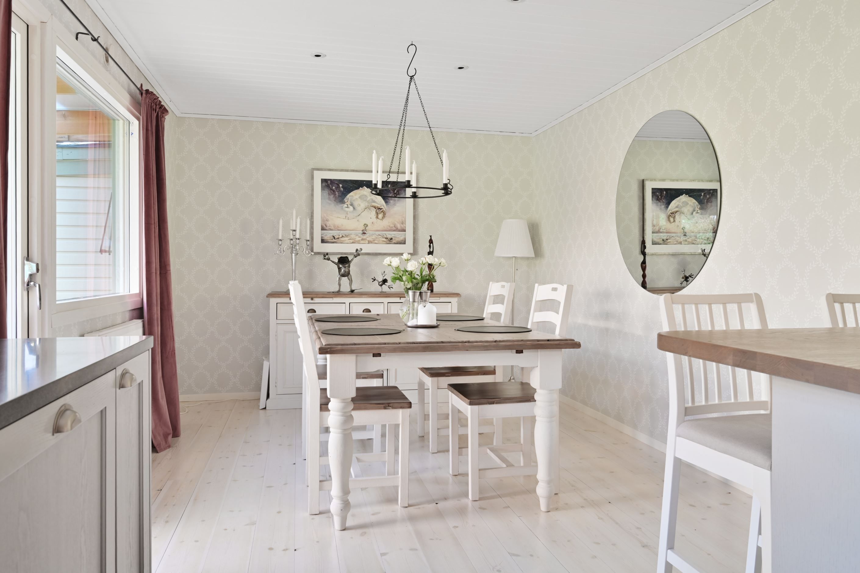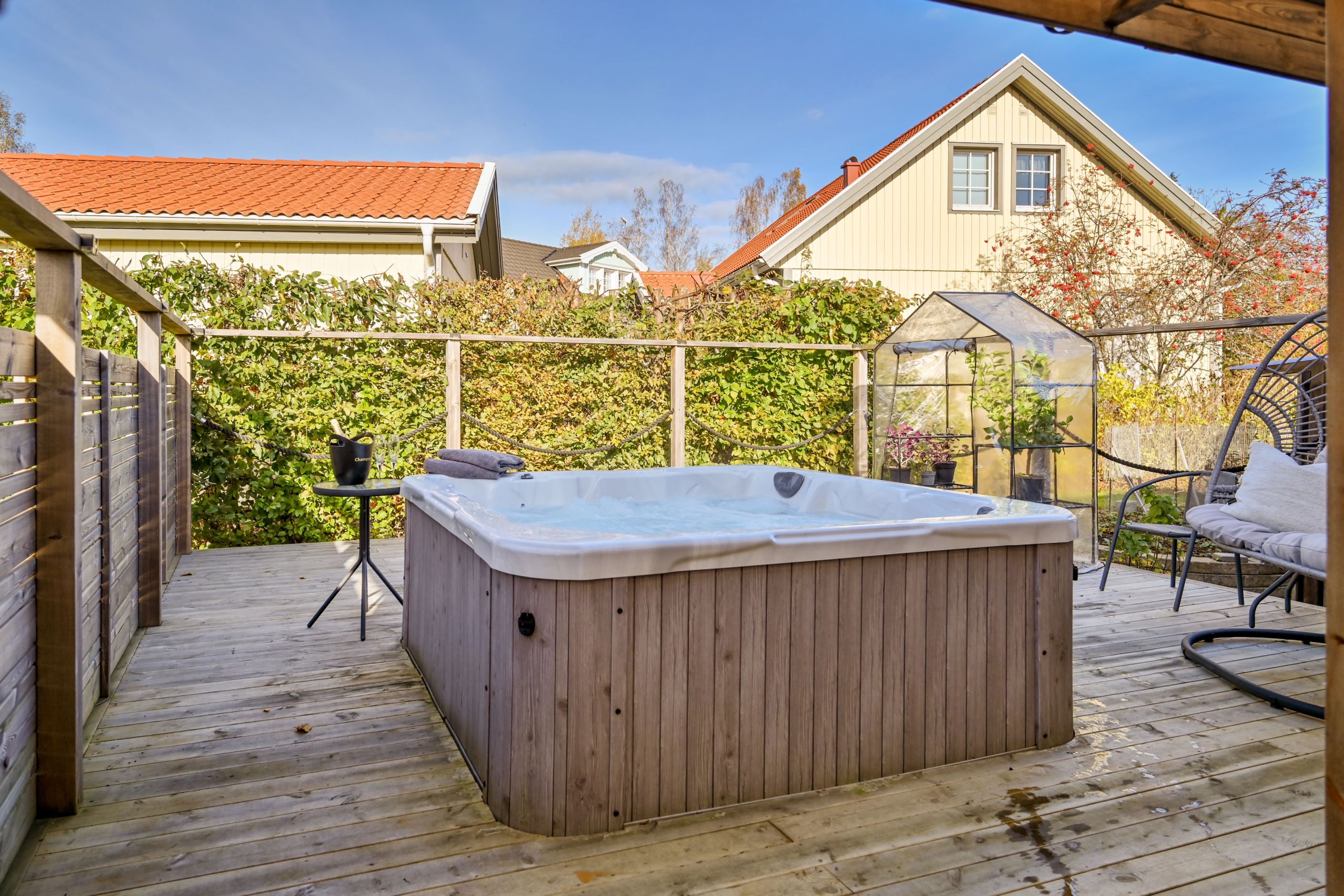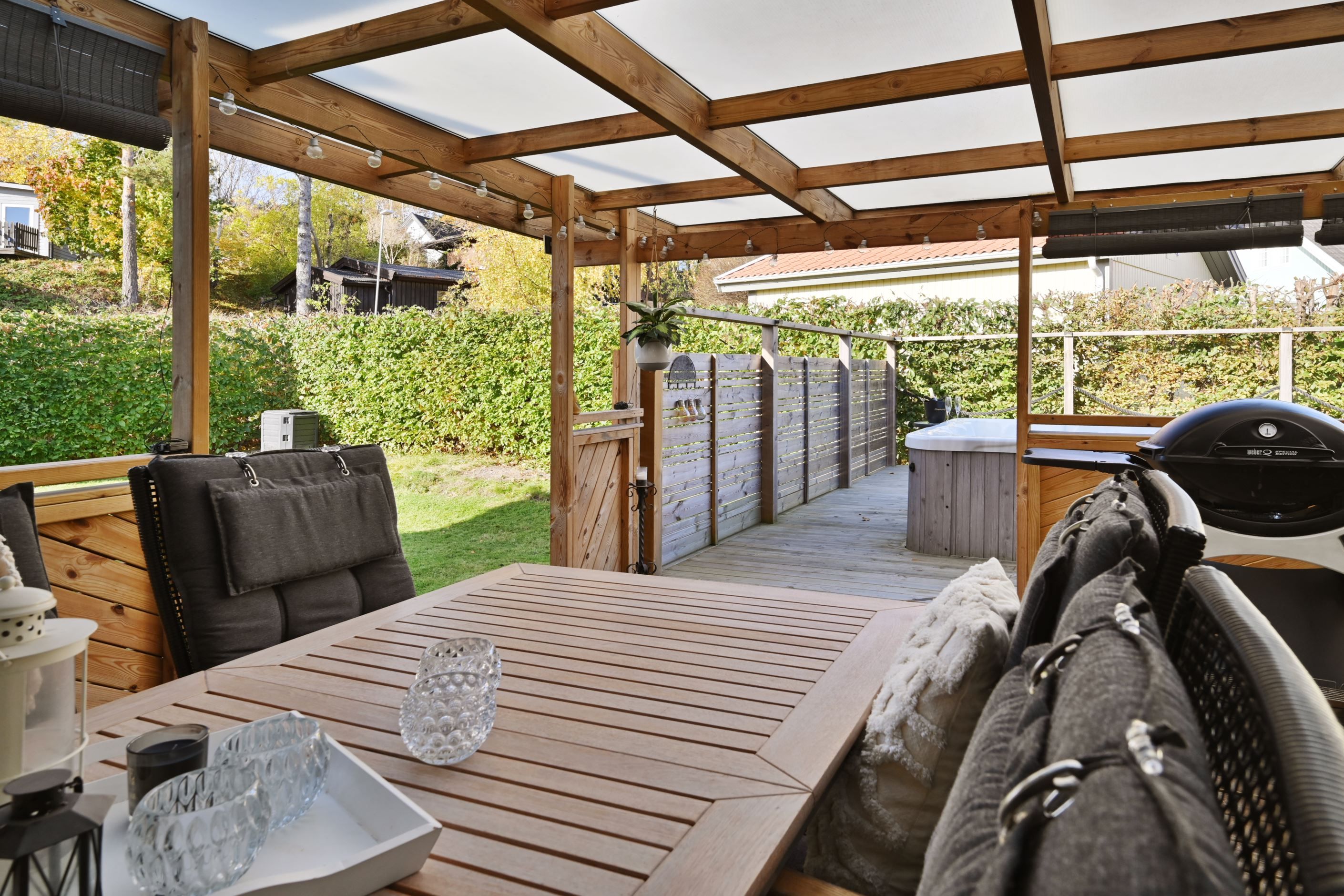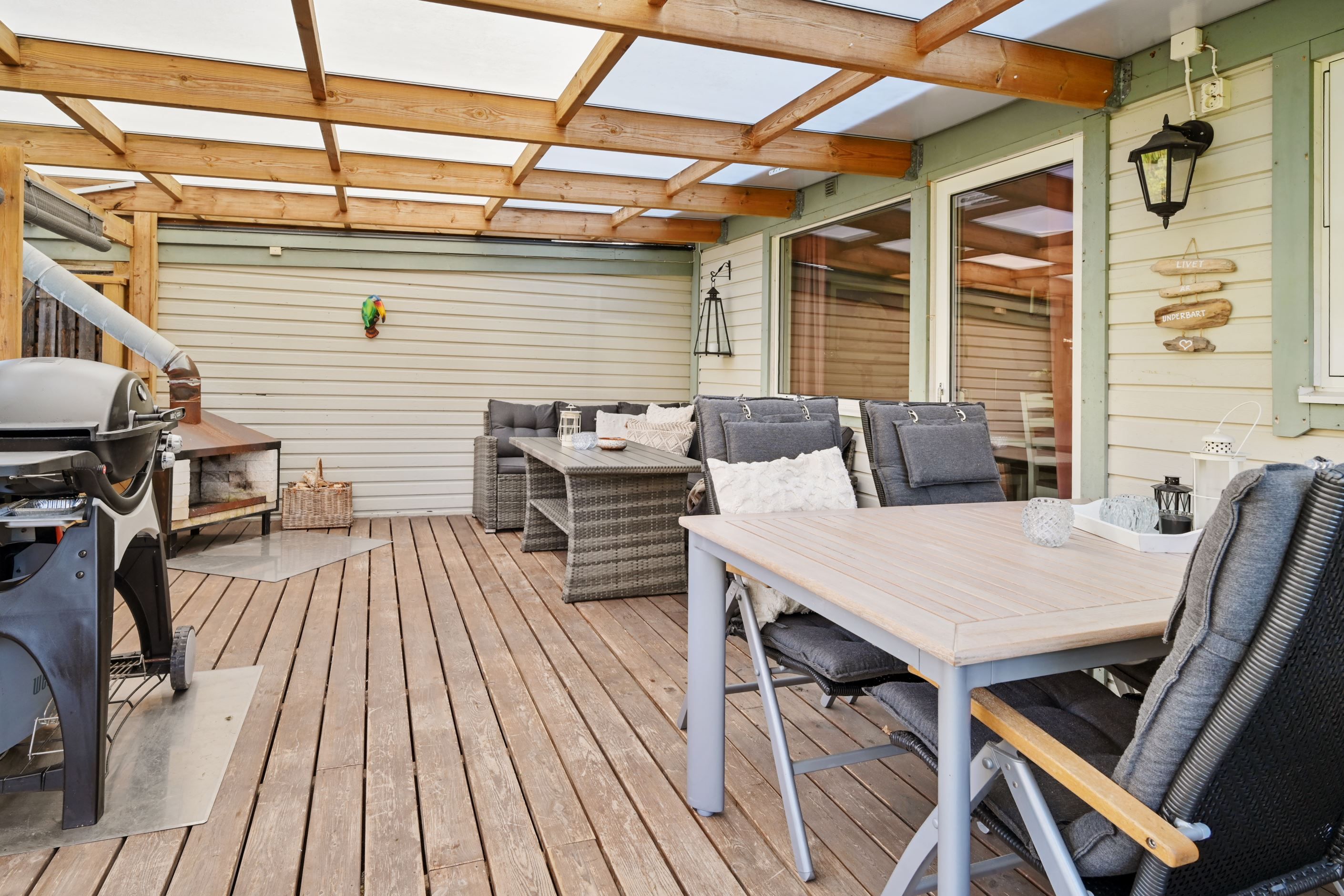 Väl inne i bostaden välkomnas du av en praktisk hall med klinkergolv och golvvärme samt bra plats för avhängning. Hallen leder vidare in i det öppna och ljusa, lyxiga och platsbyggda köket – husets naturliga samlingspunkt. Köket har gott om förvaringsskåp, generösa arbetsytor och en stor köksö med träskiva som erbjuder både funktion och social yta. Intill finns utrymme för matbord, och via altandörr i helglas når man trädgården och den takförsedda uteplatsen – vilket skapar en fin koppling mellan inne och ute.