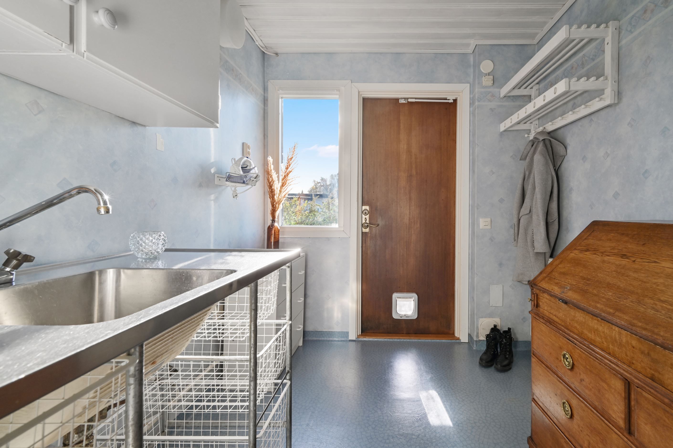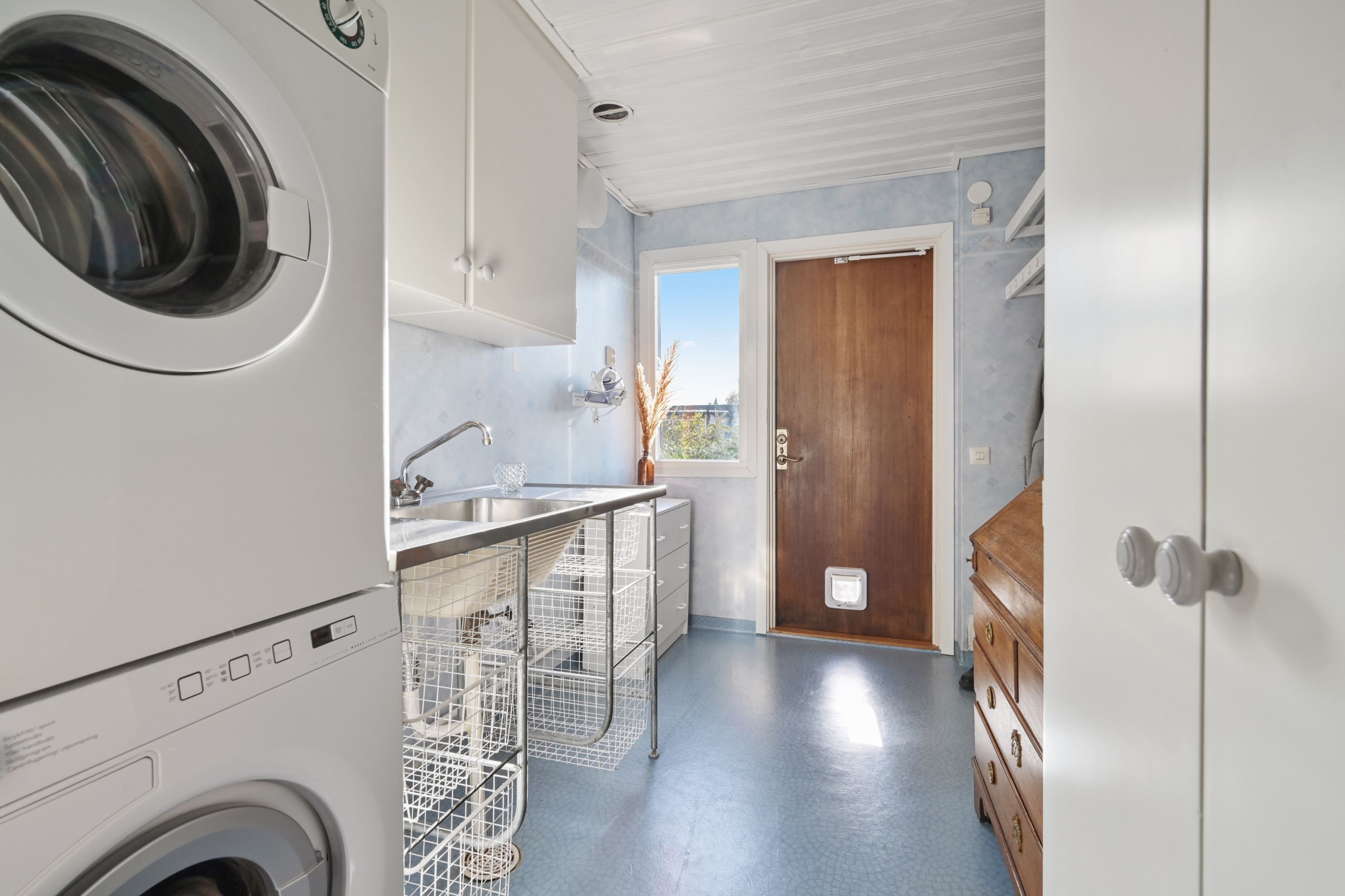 På entréplan finns också en praktisk tvättstuga med groventré, tvättmaskin, torktumlare, arbetsbänk och ho – idealiskt för den aktiva familjens behov.