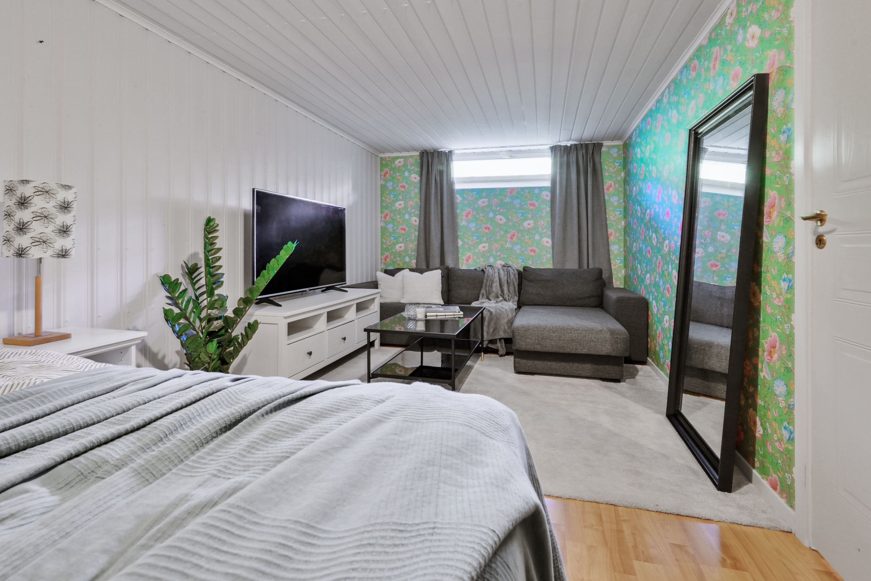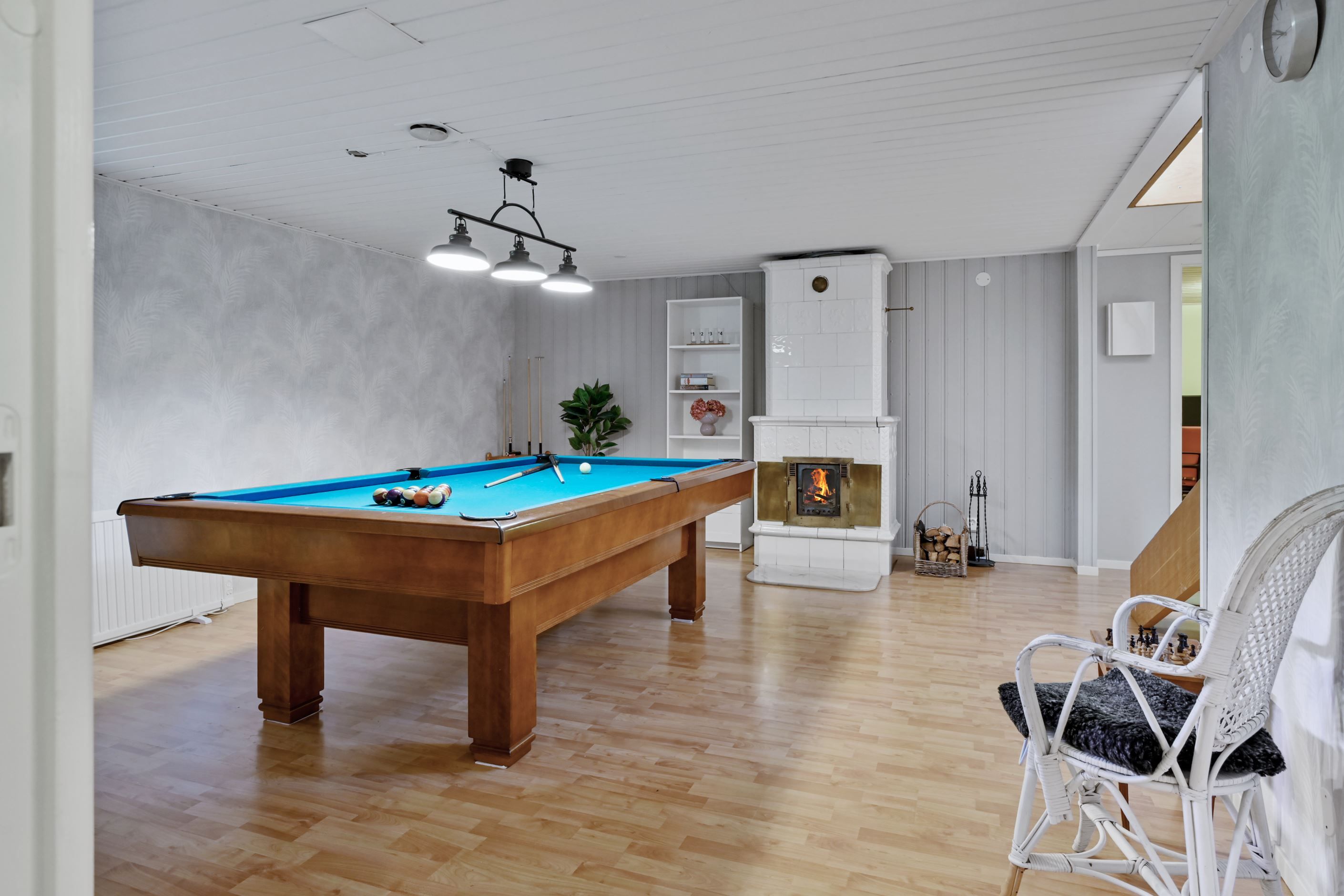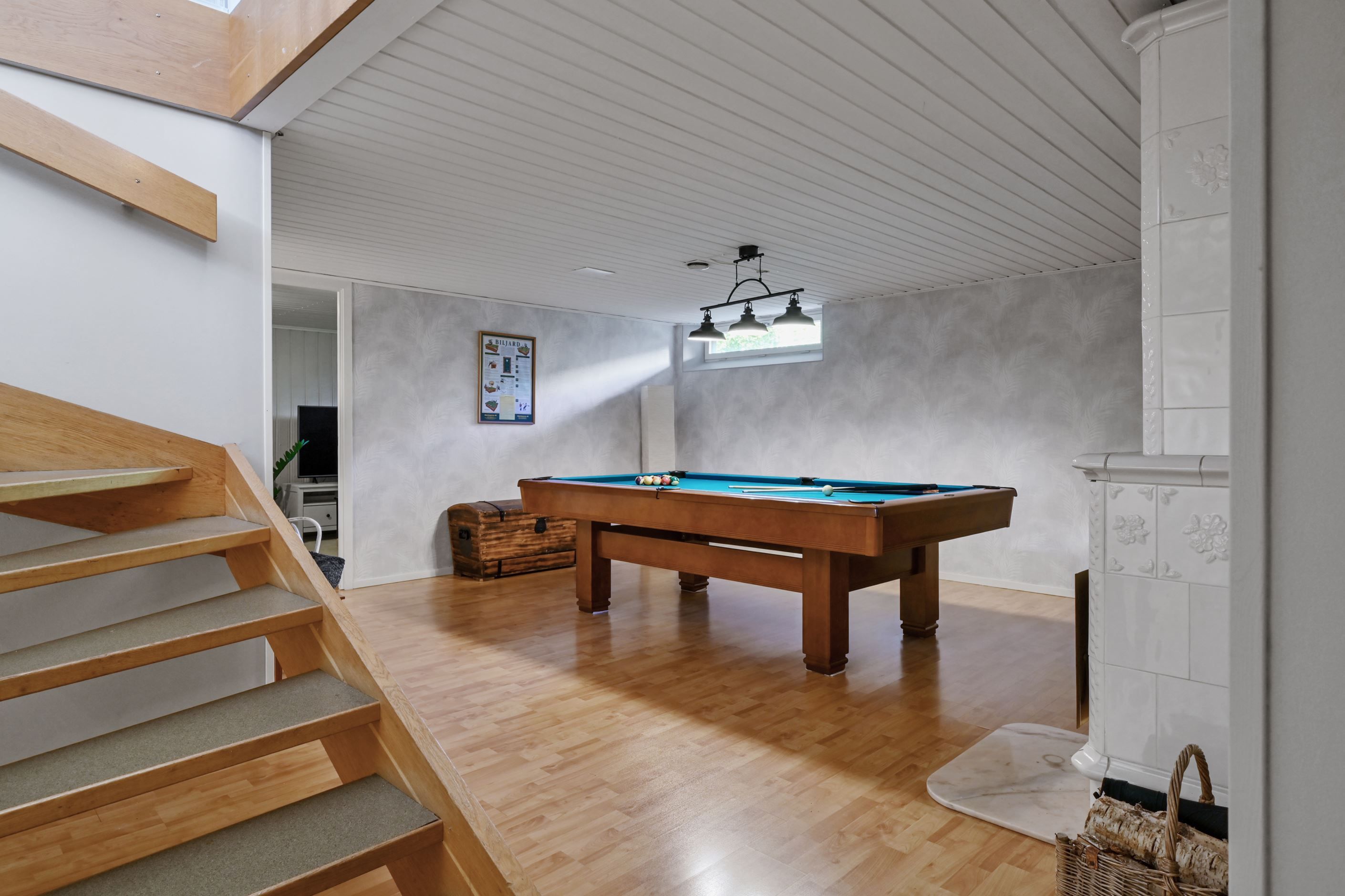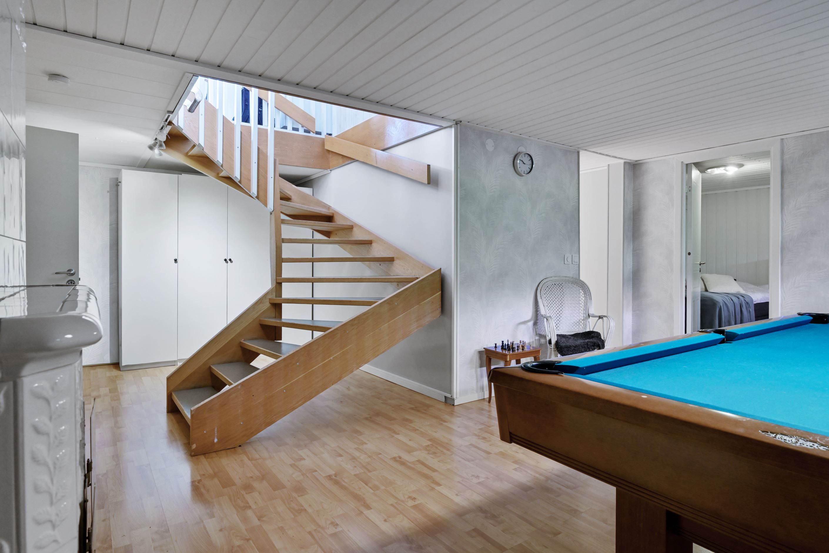 I källarplanet, som har full takhöjd och är inrett med samma omsorg som entréplanet, finns ett stort allrum/gillestuga med kakelugn från Cronspisen – en trivsam plats för både avkoppling och aktivitet. Här står idag ett biljardbord, men rummet kan enkelt anpassas efter behov som exempelvis hemmabio, lekrum eller lounge. I direkt anslutning ligger ett andra badrum med dusch, wc, handfat och en rymlig bastu. Källaren rymmer även två användbara rum som idag används som sovrum – båda med bra storlek och ett av dem med tillgång till ett större förråd som kan användas till klädförvaring, hobbyutrymme eller verkstad.