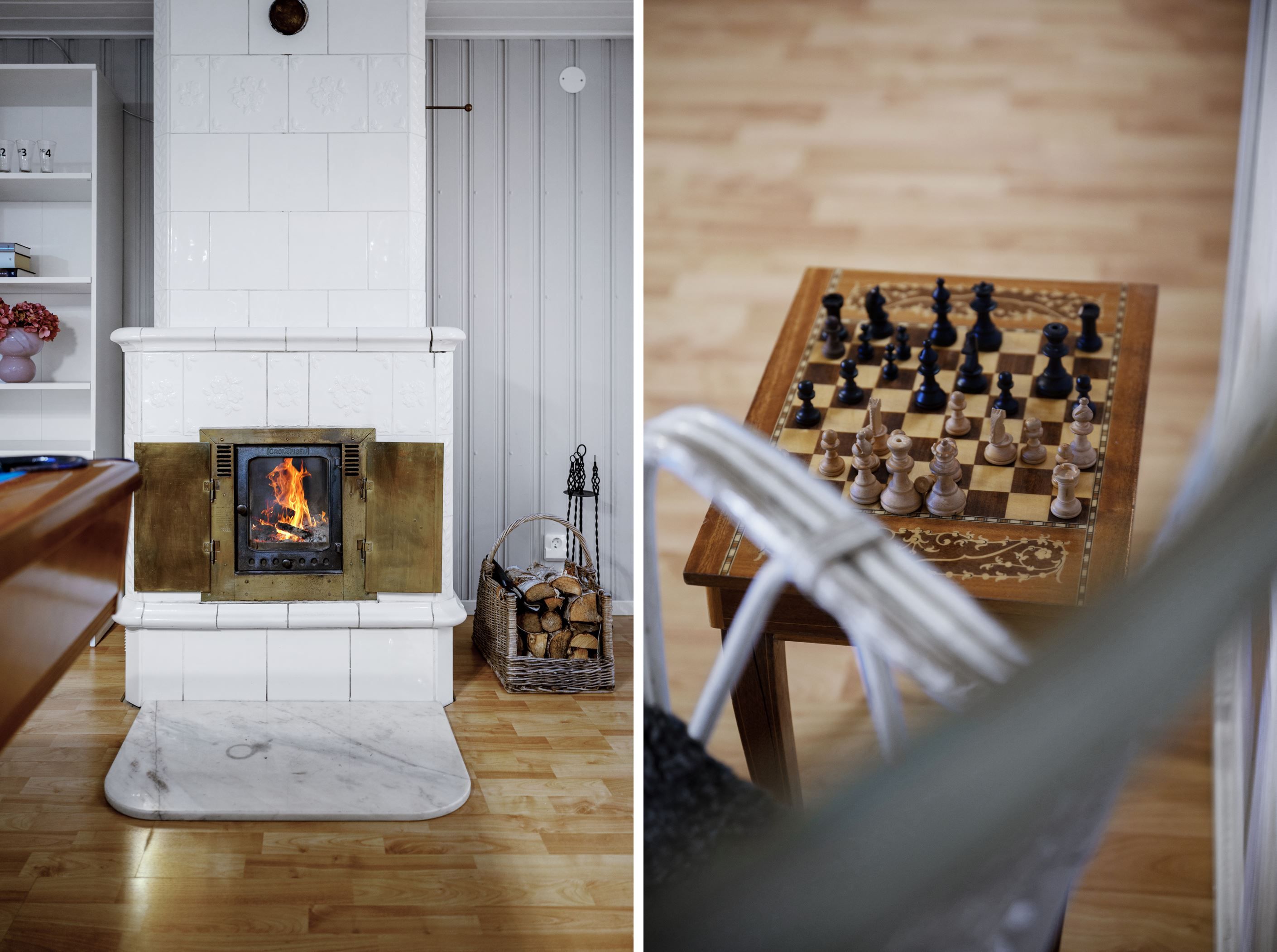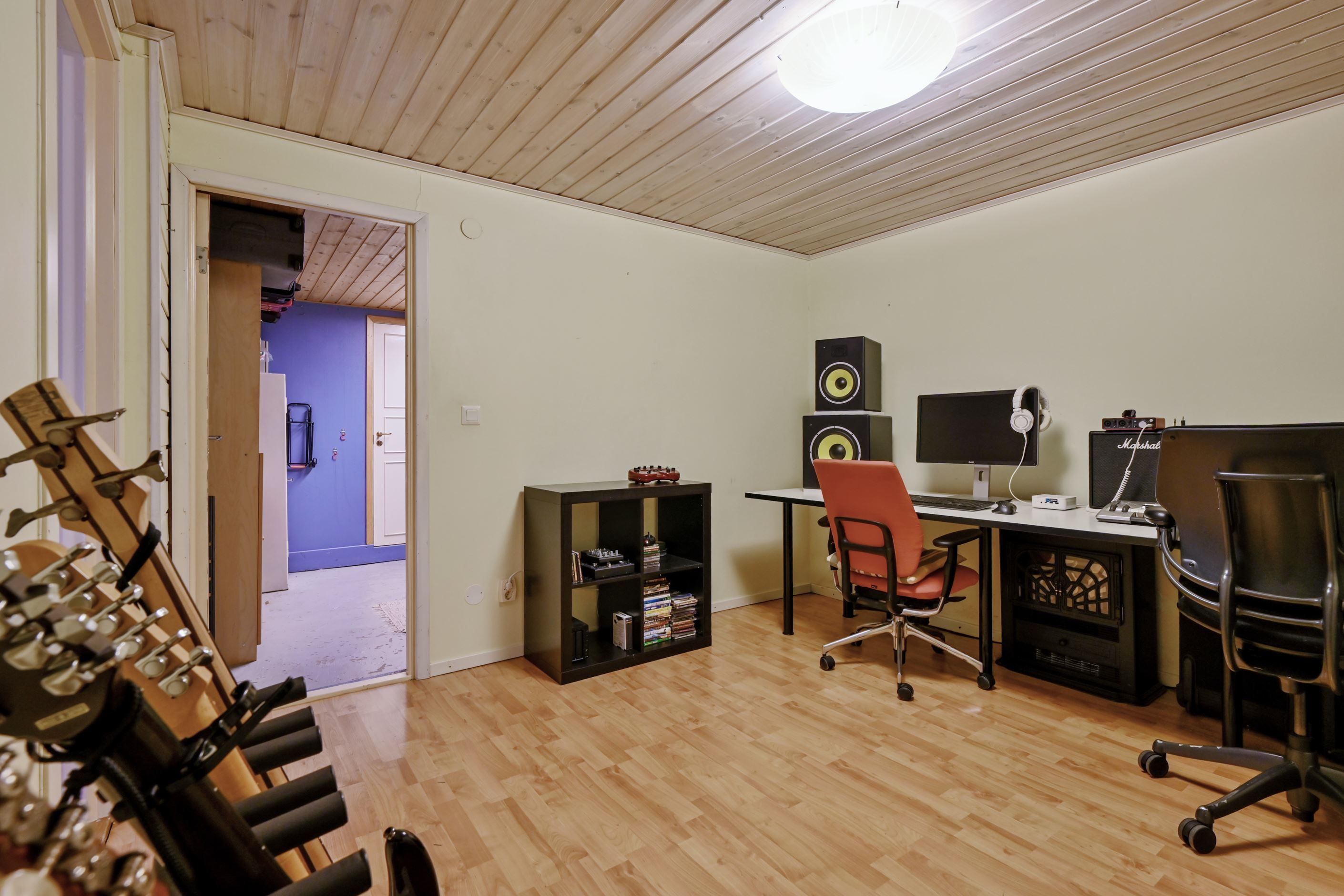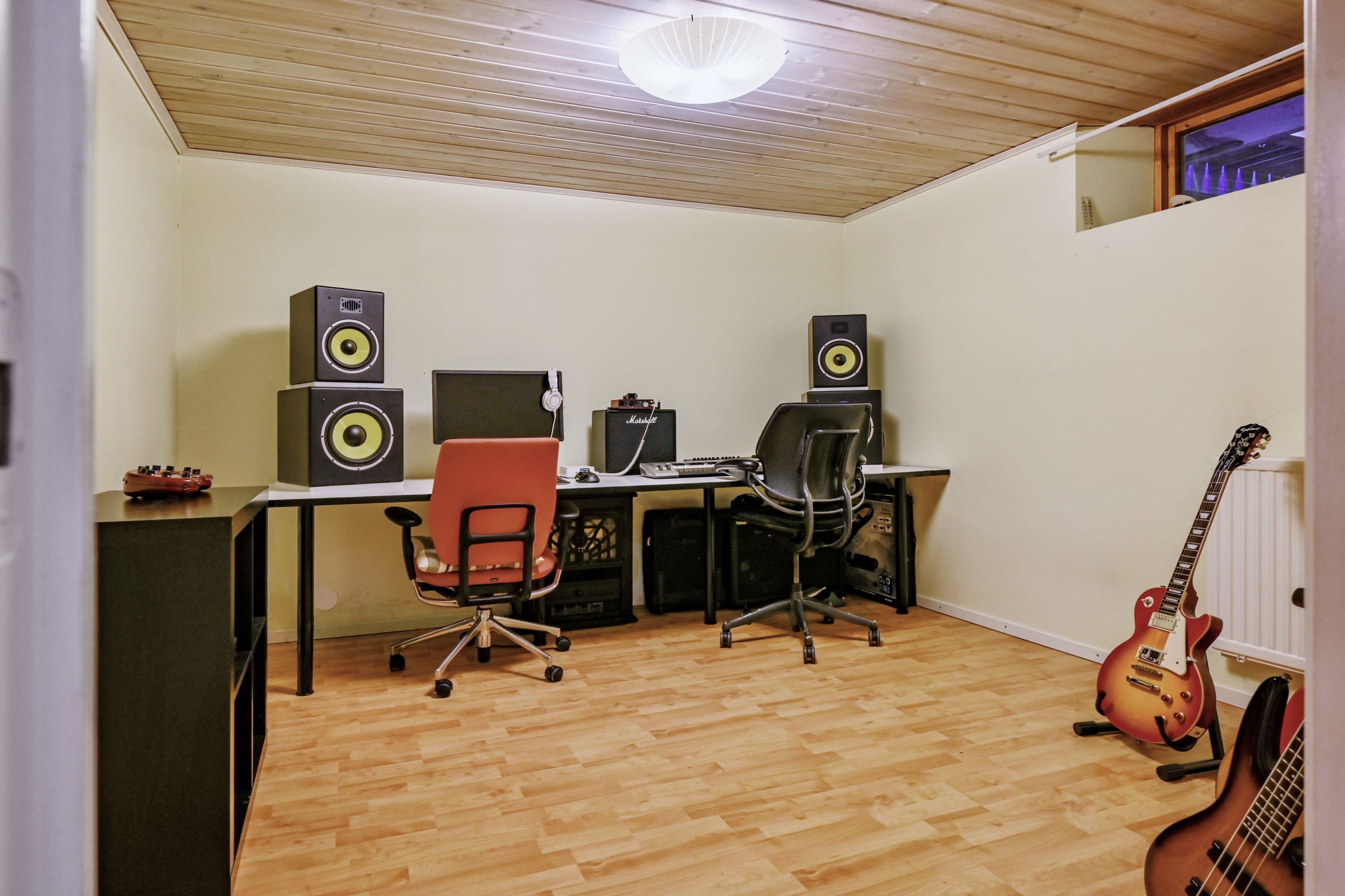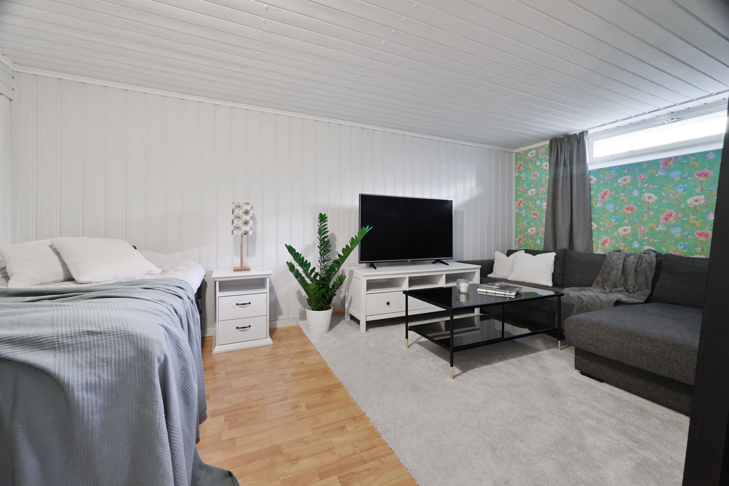 I källarplanet, som har full takhöjd och är inrett med samma omsorg som entréplanet, finns ett stort allrum/gillestuga med kakelugn från Cronspisen – en trivsam plats för både avkoppling och aktivitet. Här står idag ett biljardbord, men rummet kan enkelt anpassas efter behov som exempelvis hemmabio, lekrum eller lounge. I direkt anslutning ligger ett andra badrum med dusch, wc, handfat och en rymlig bastu. Källaren rymmer även två användbara rum som idag används som sovrum – båda med bra storlek och ett av dem med tillgång till ett större förråd som kan användas till klädförvaring, hobbyutrymme eller verkstad.