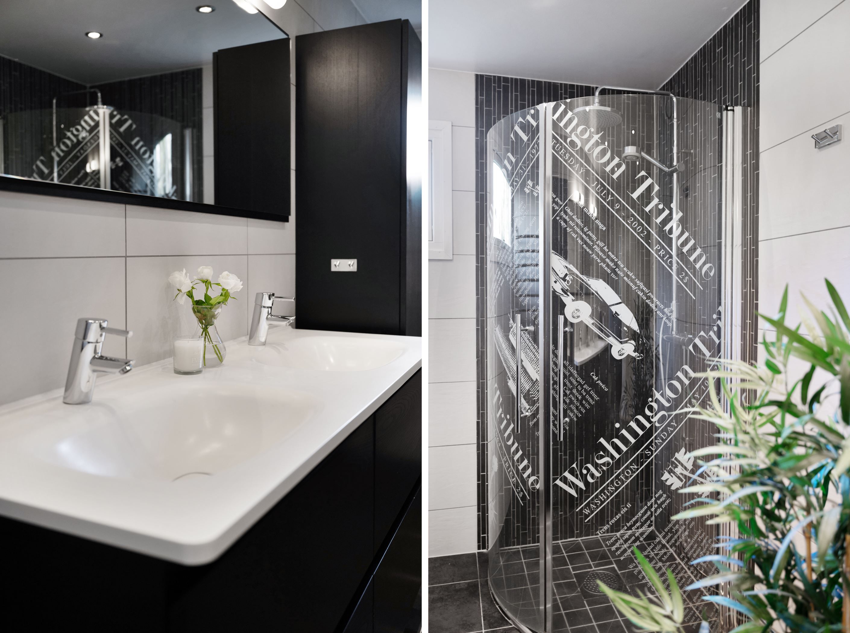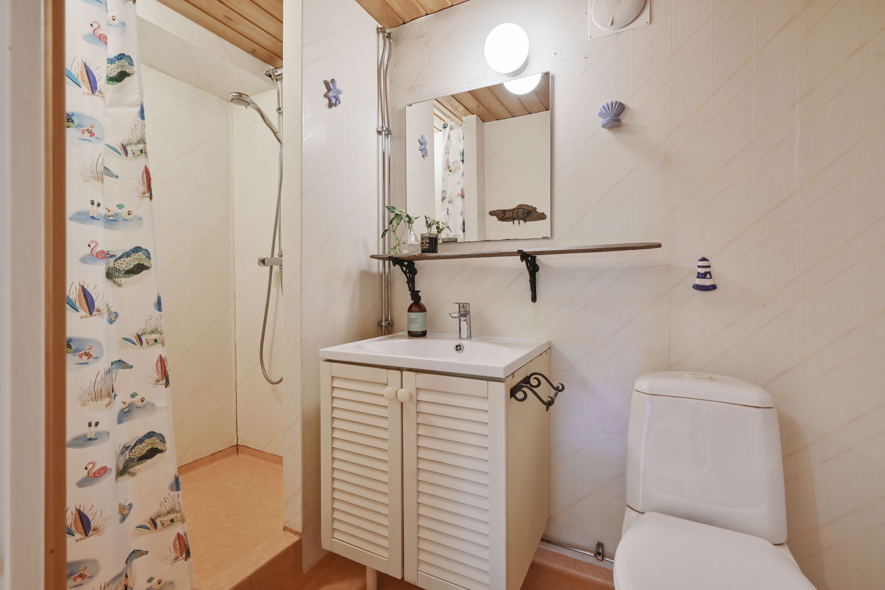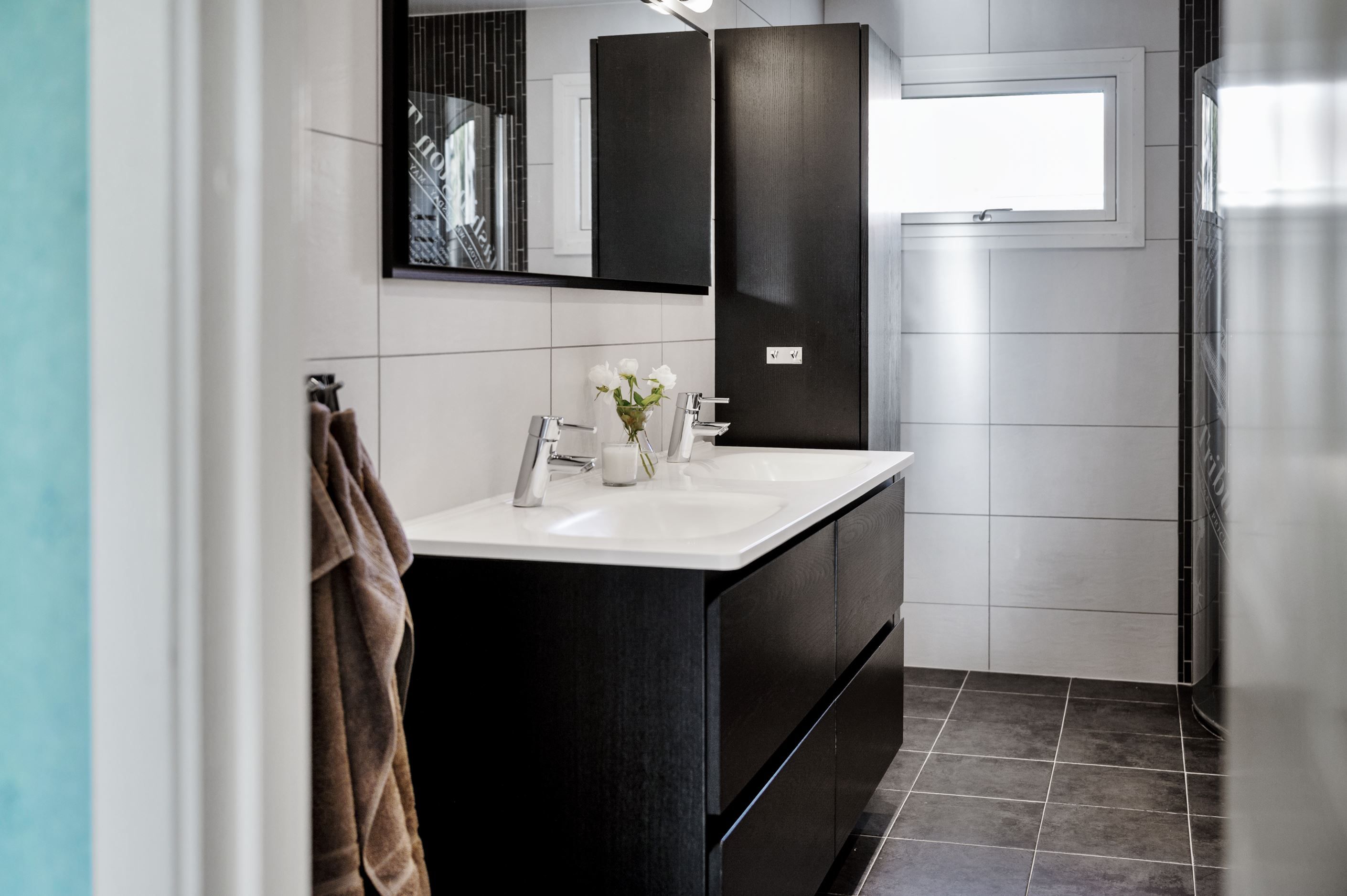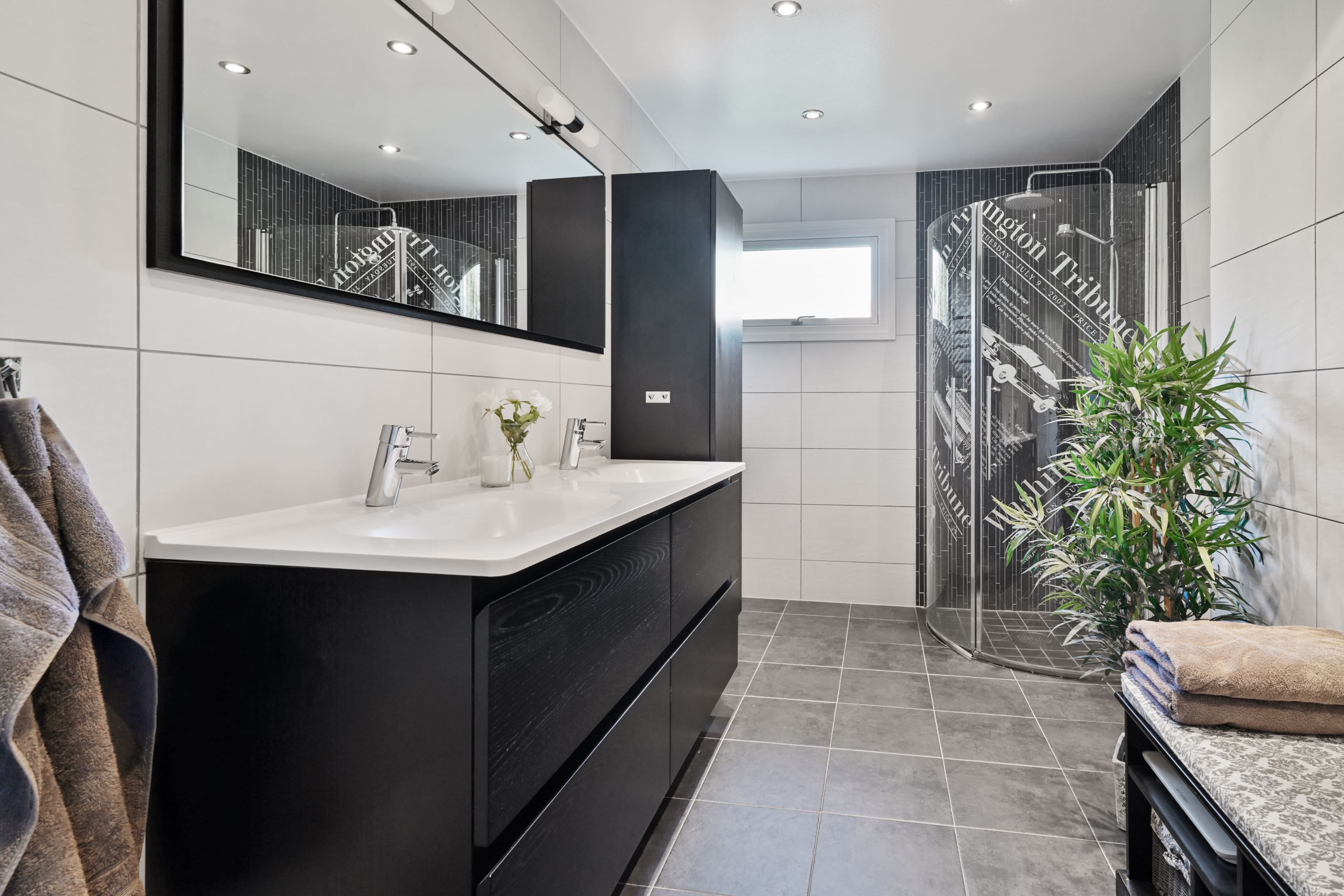 Badrummet är helkaklat och modernt, utrustat med dubbelkommod, spegel med belysning, duschhörna med glasväggar, wc samt golvvärme och infällda spotlights i taket.