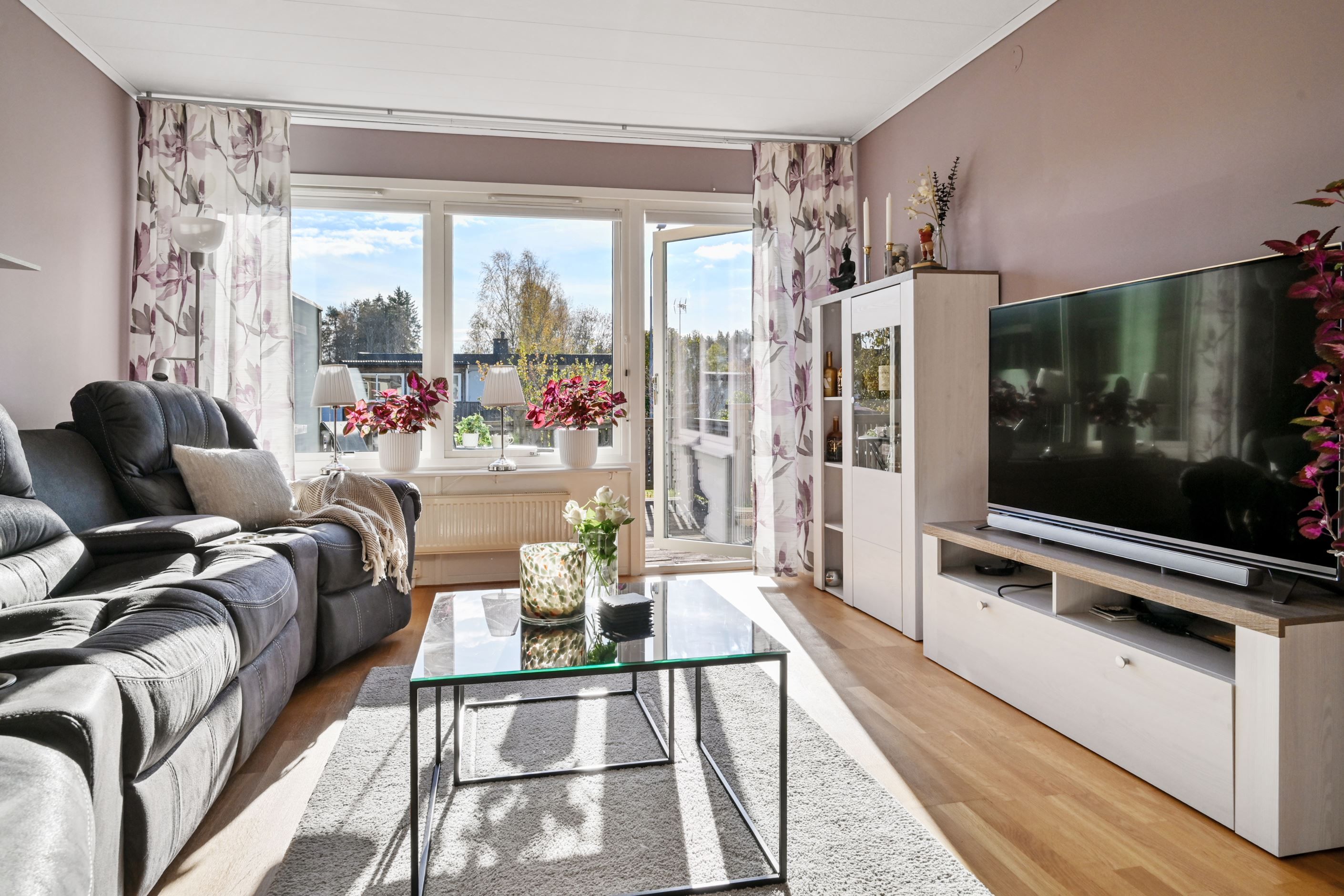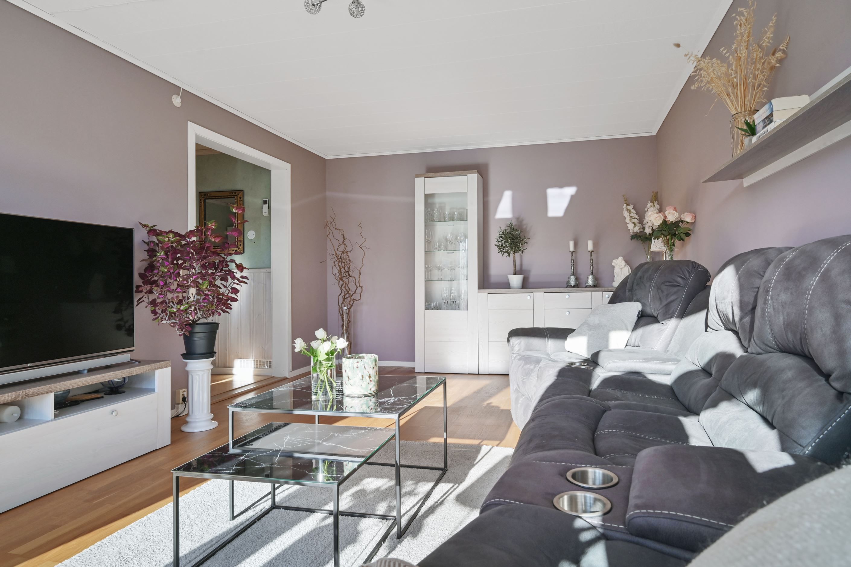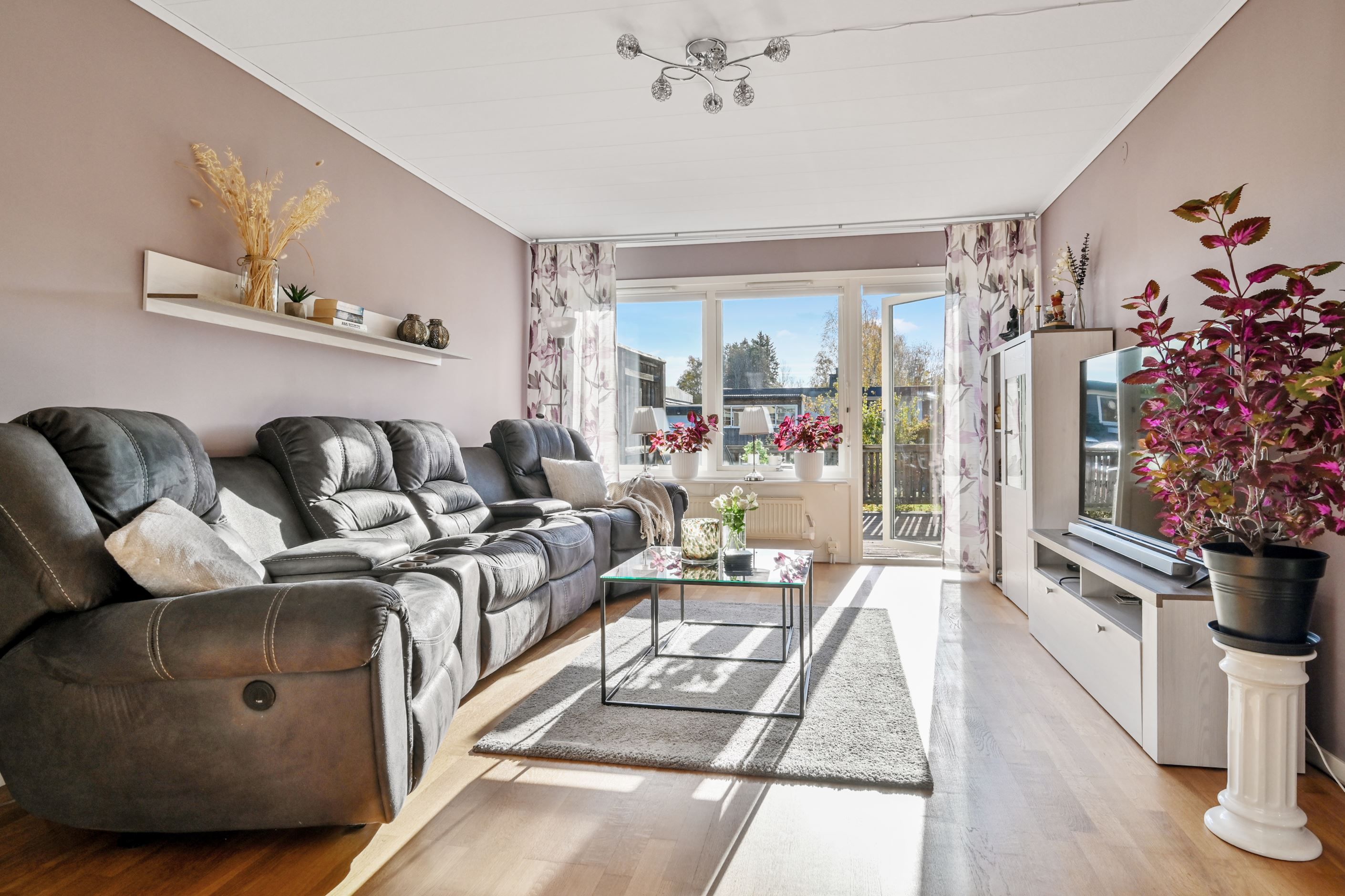 Vardagsrummet är stort, ljust och lättmöblerat med plats för större soffgrupp och med ett trevligt ljusinsläpp tack vare stora fönsterpartier samt altandörr i glas. Rummet lämpar sig väl för både vardagsliv och umgänge.