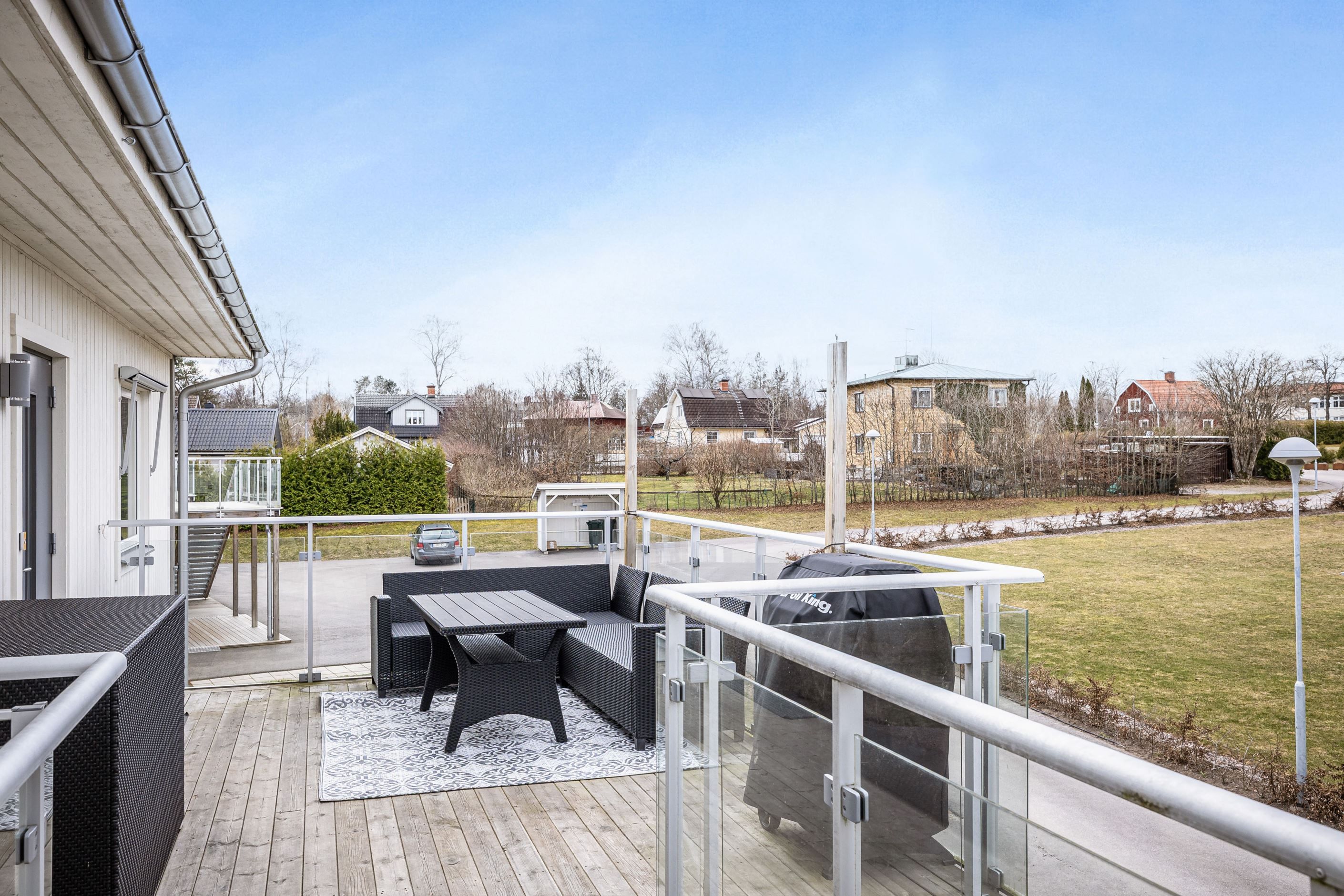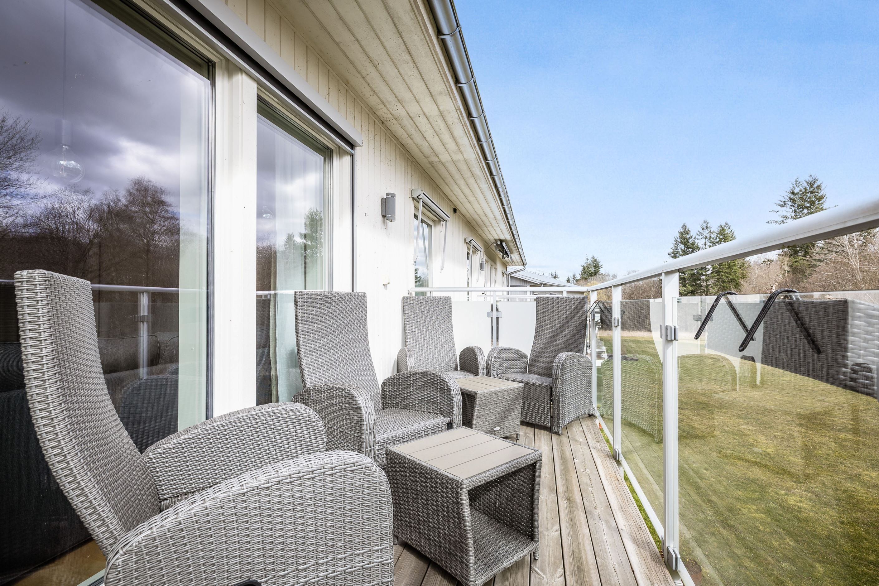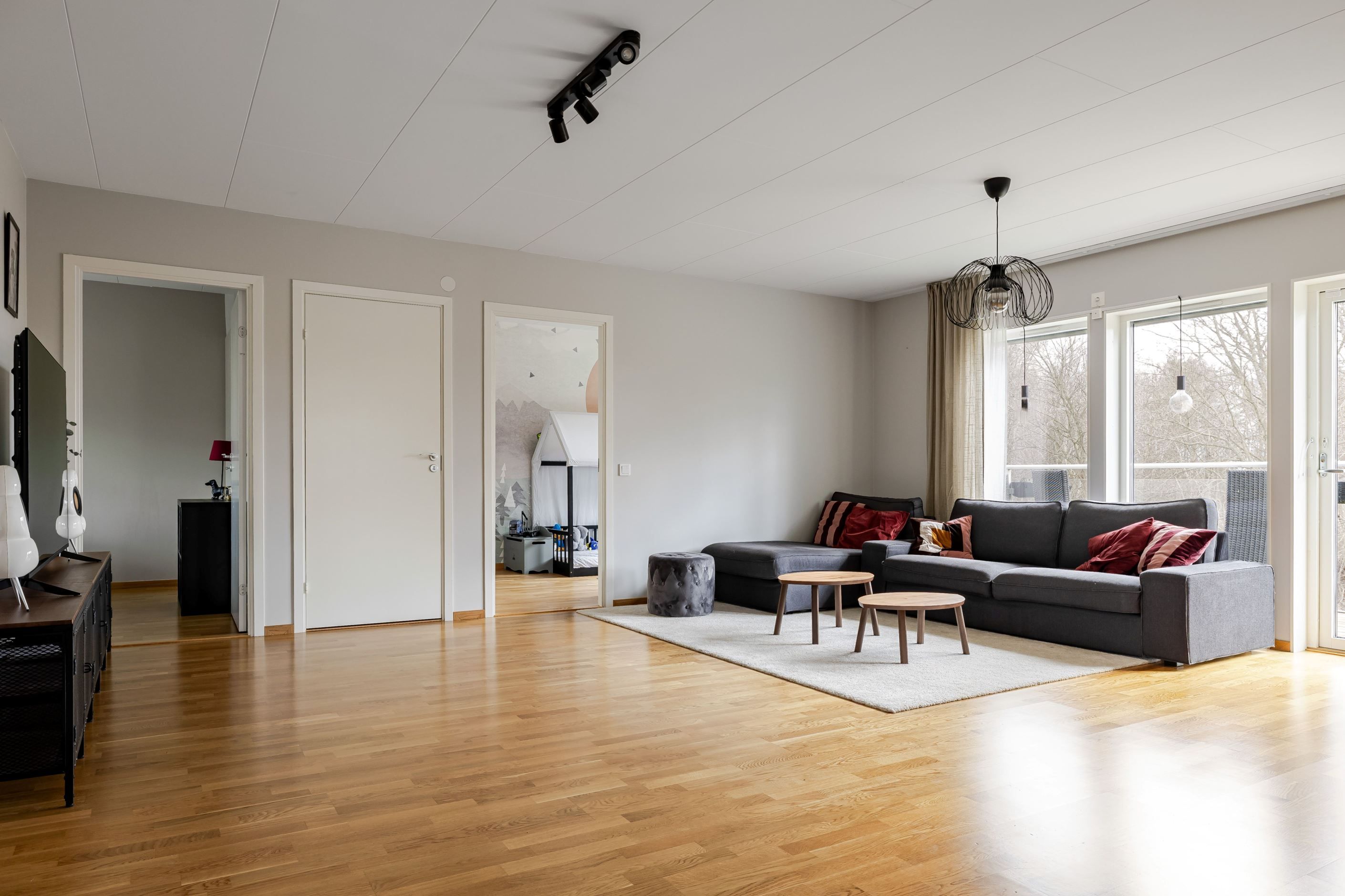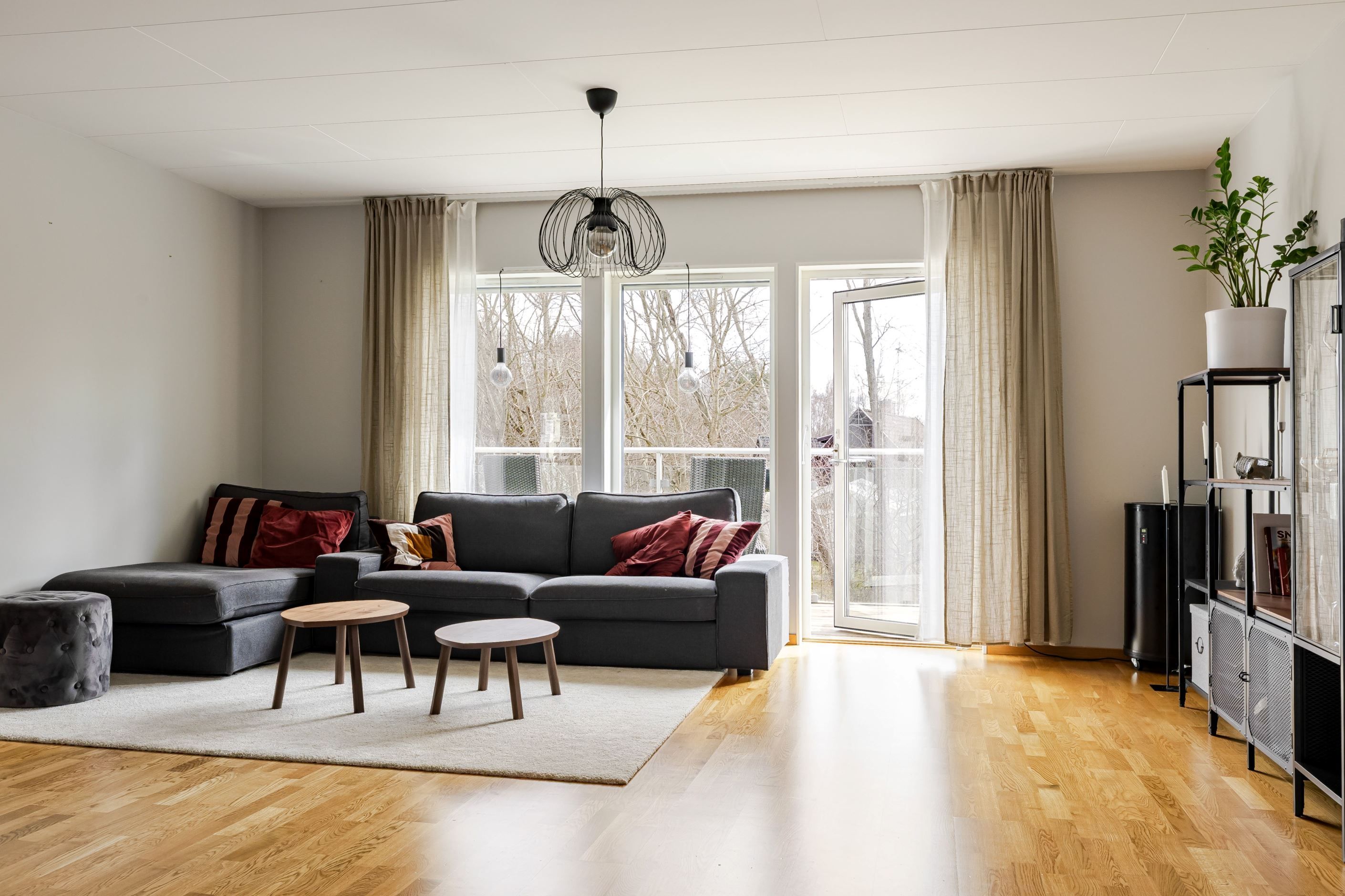 Bostaden präglas av ett fint ljusinsläpp från fönster i tre väderstreck och en luftig, insynsskyddad atmosfär. Det stilrena Marbodalköket i fin grå ton bjuder in till både matlagning och umgänge, medan vardagsrummet är luftigt och bostadens nav där varje övrigt rum utgår från. Från vardagsrummet nås en av balkongerna med lummig natur strax utanför. Här kan du njuta av egentid och morgonkaffet i lugn och ro.