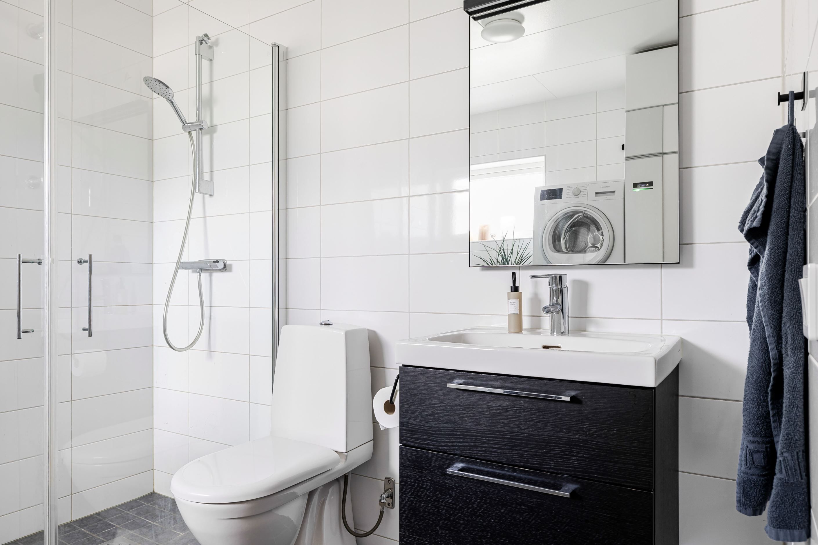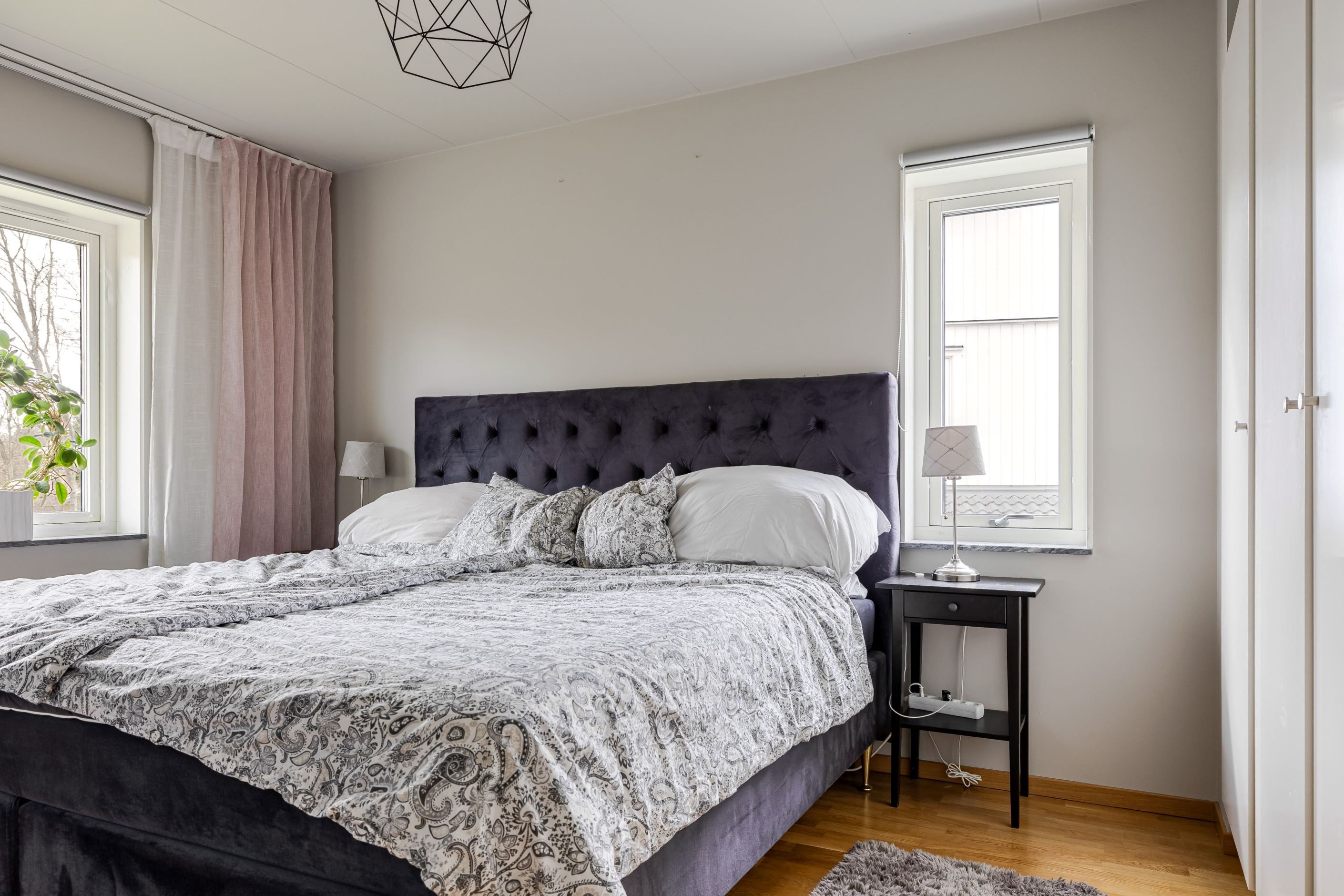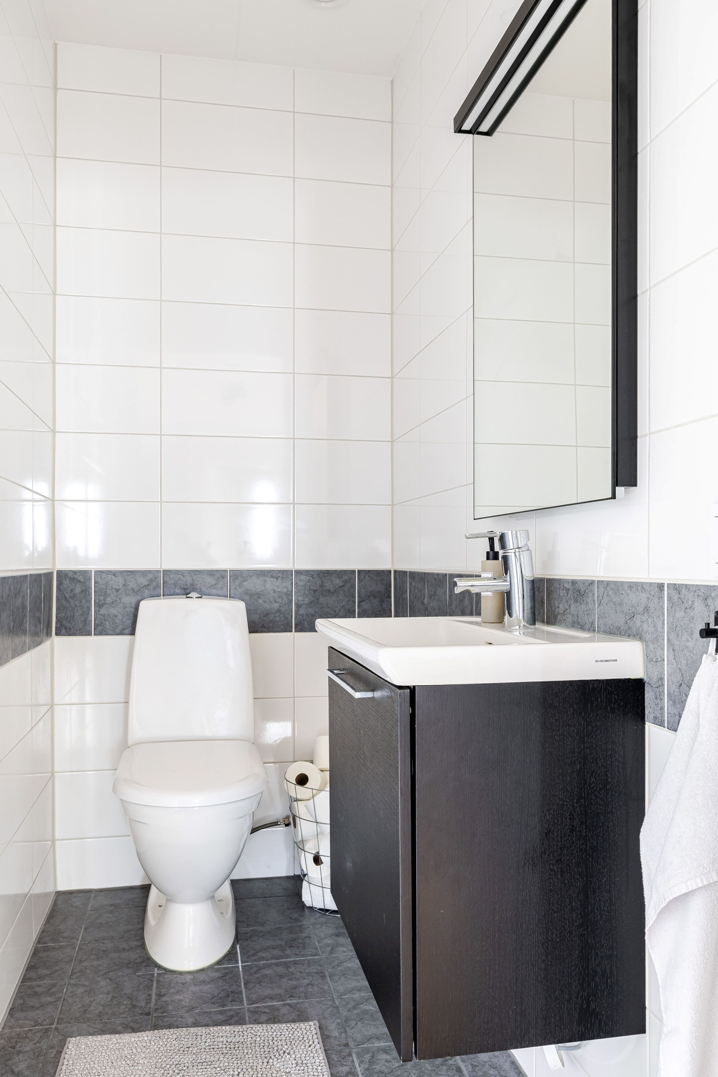 I lägenheten finns tre rymliga sovrum, ett fräscht helkaklat badrum med tvättdel samt en extra toalett som ger hög vardagskomfort. Golvvärme i hela bostaden ger skönt inomhusklimat året om, och det uppvärmda förrådet ger extra praktisk förvaring.