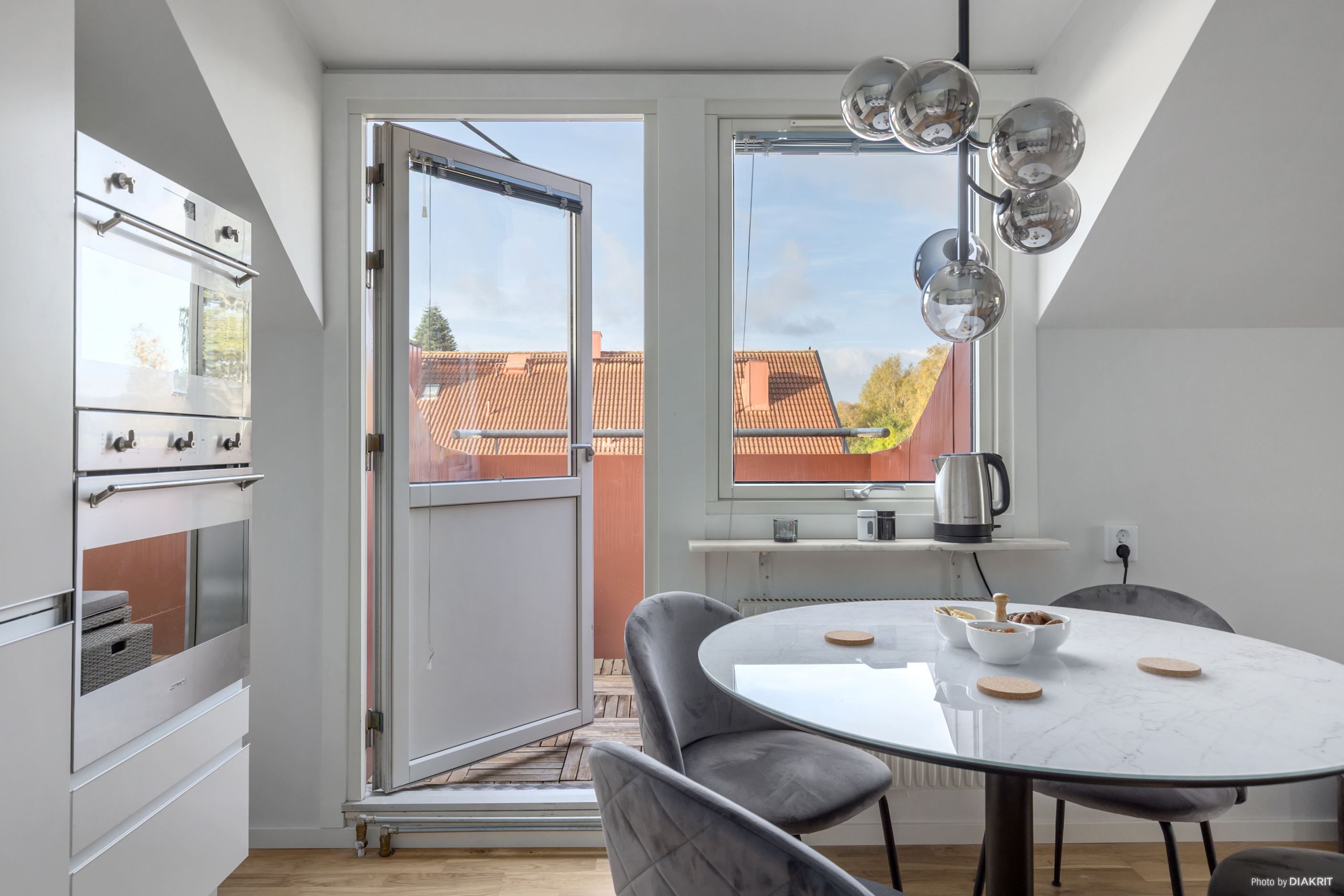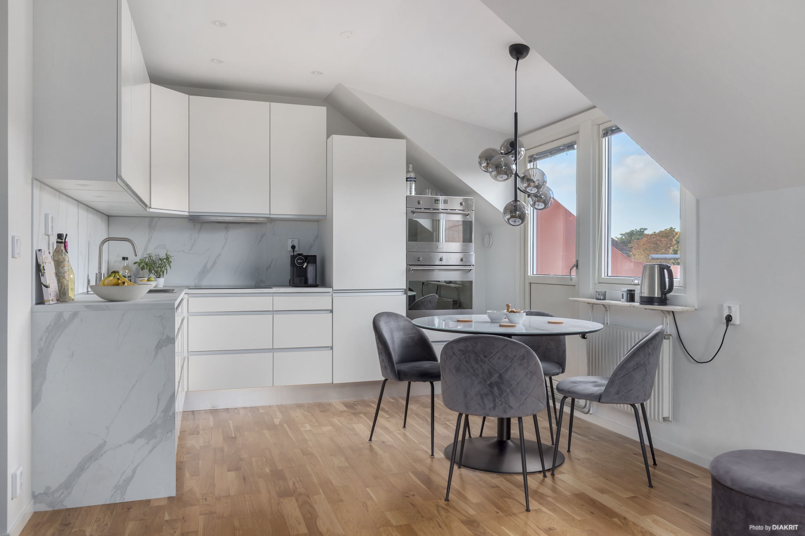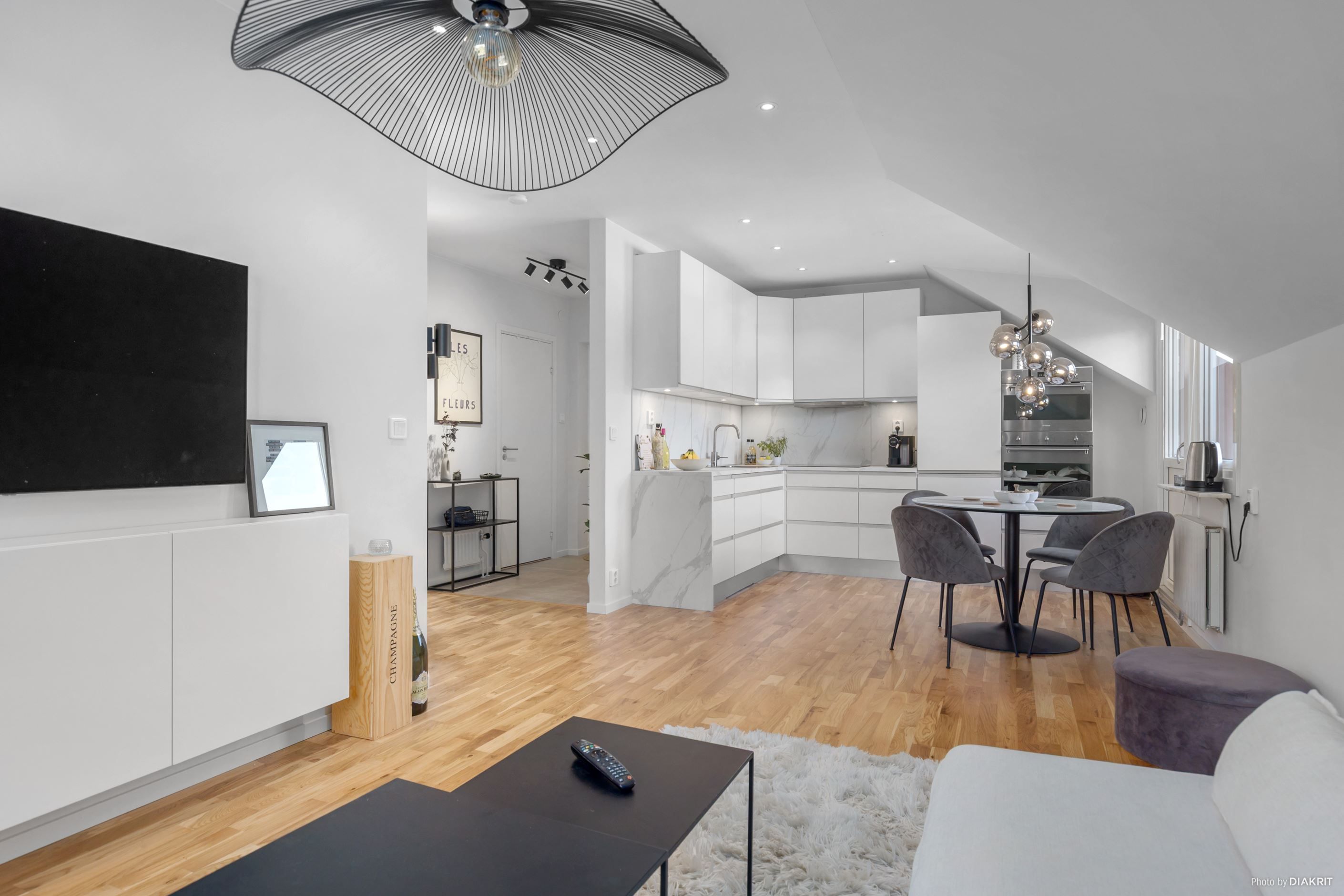 Här möts du av en modern och öppen planlösning där kök och vardagsrum smälter samman till en social och ljus helhet – perfekt för både vardagsliv och umgänge.