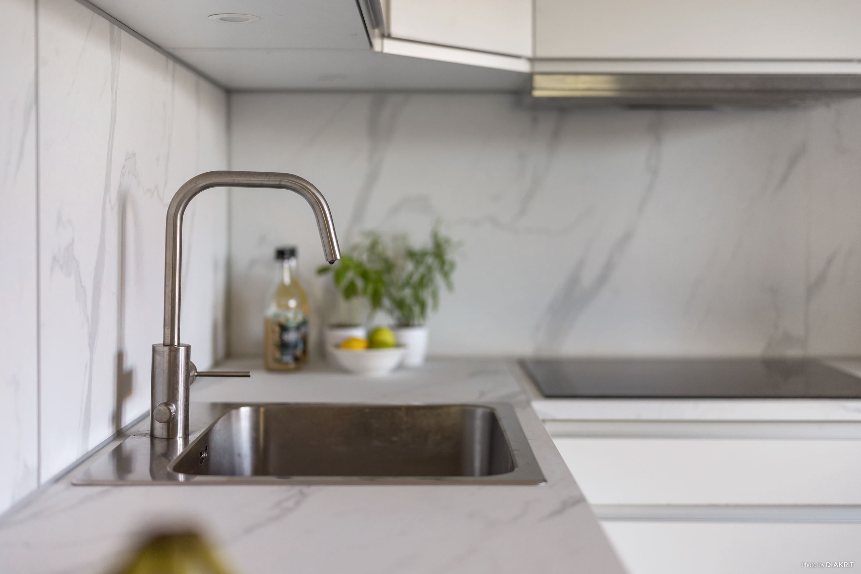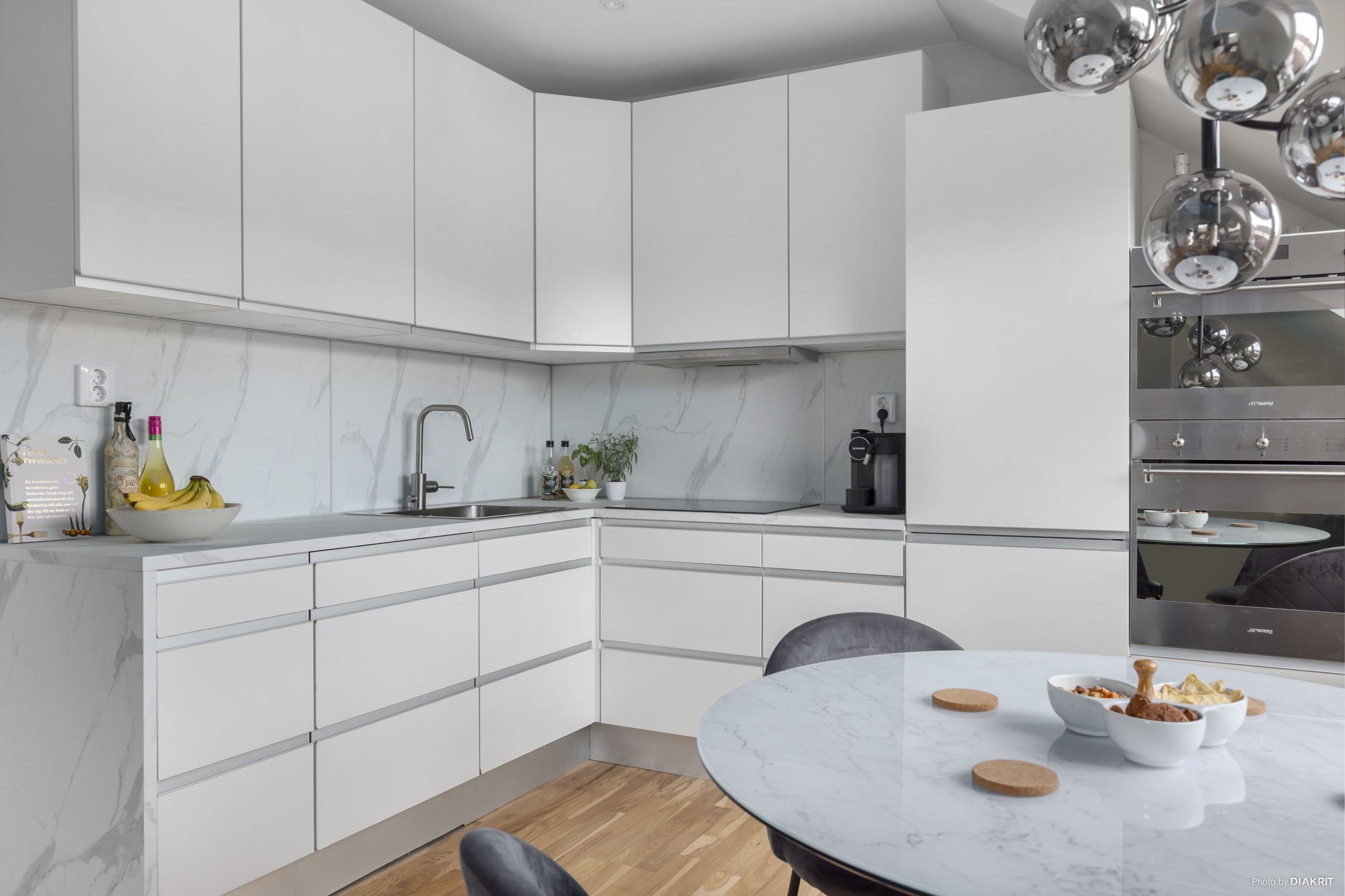 Det exklusiva köket från JKE Design kombinerar nordisk design med funktionalitet i toppklass, fullt utrustat med stilrena vitvaror från SMEG som lyfter helhetsintrycket ytterligare. Materialvalen är noggrant utvalda för att skapa en harmonisk och tidlös känsla i hela bostaden.