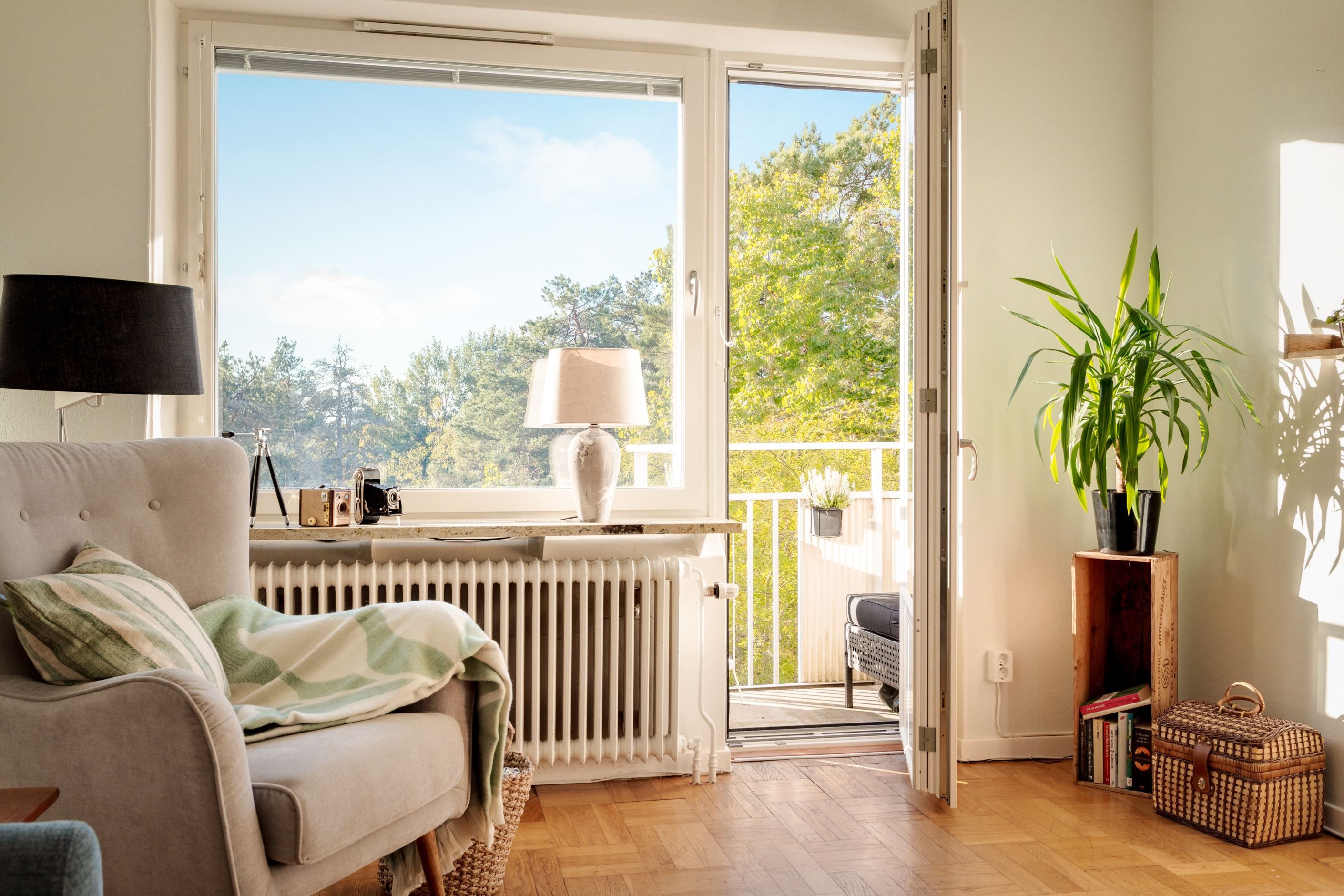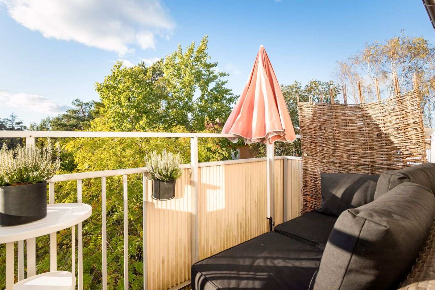 Den möblerbara balkongen i väst/nordväst, med utsikt över grönskan, har sol från lunch till solnedgång.