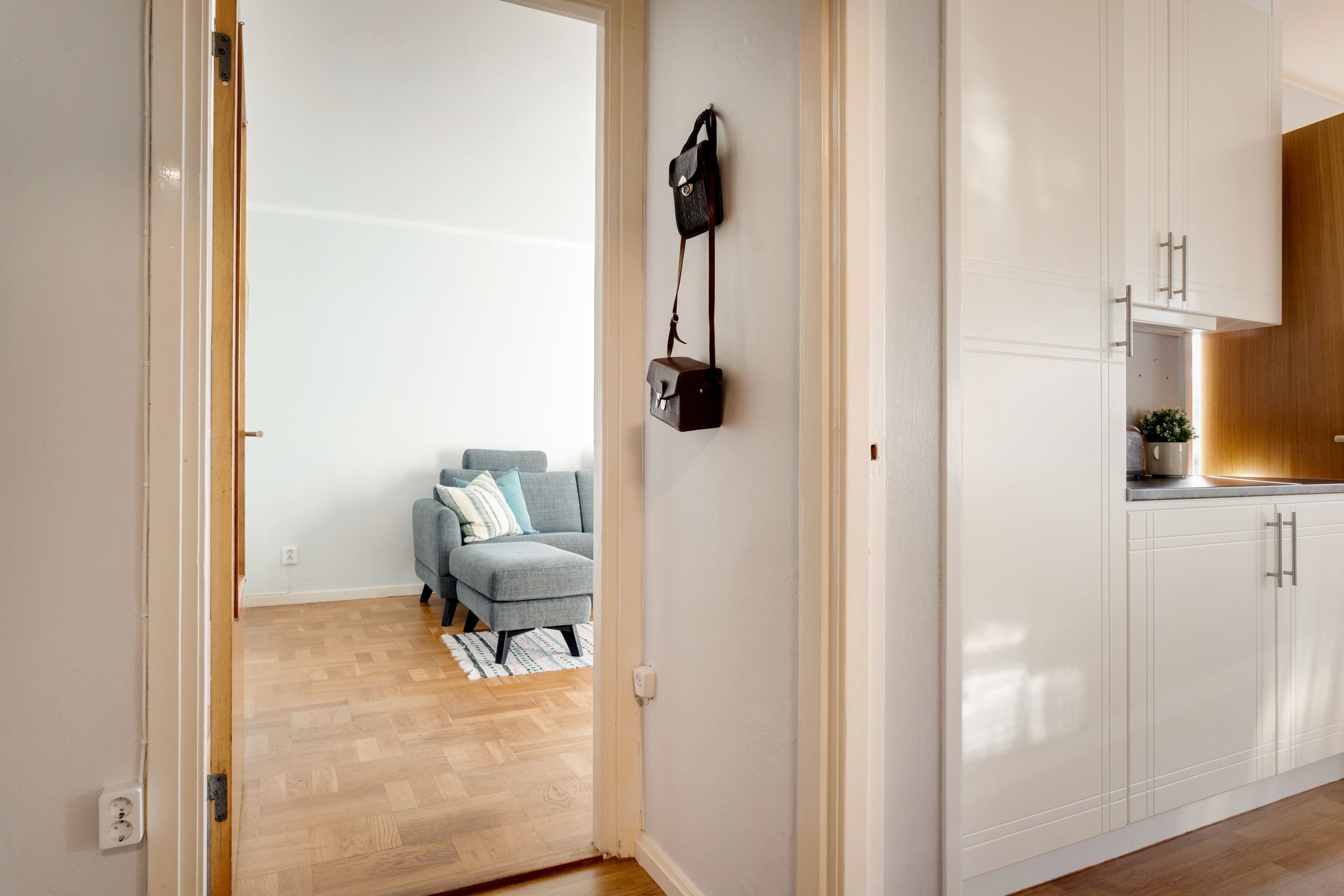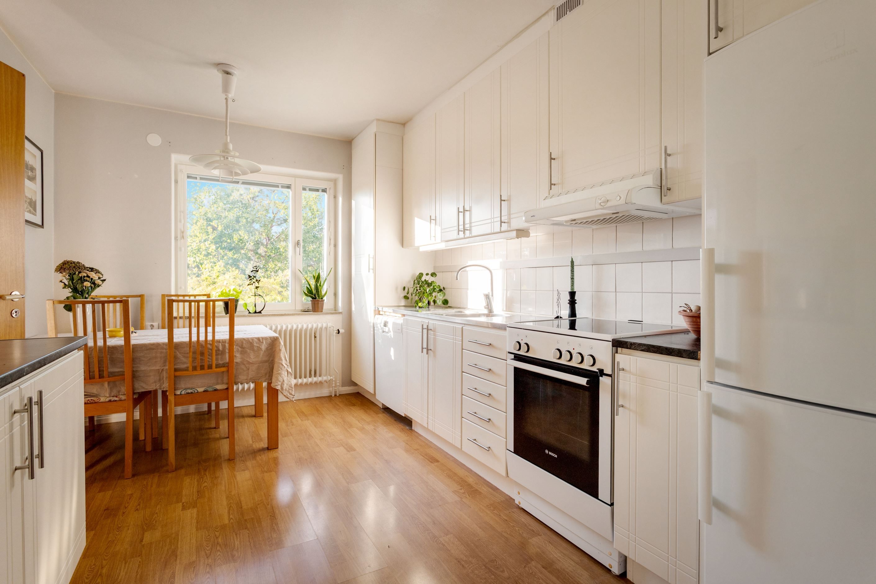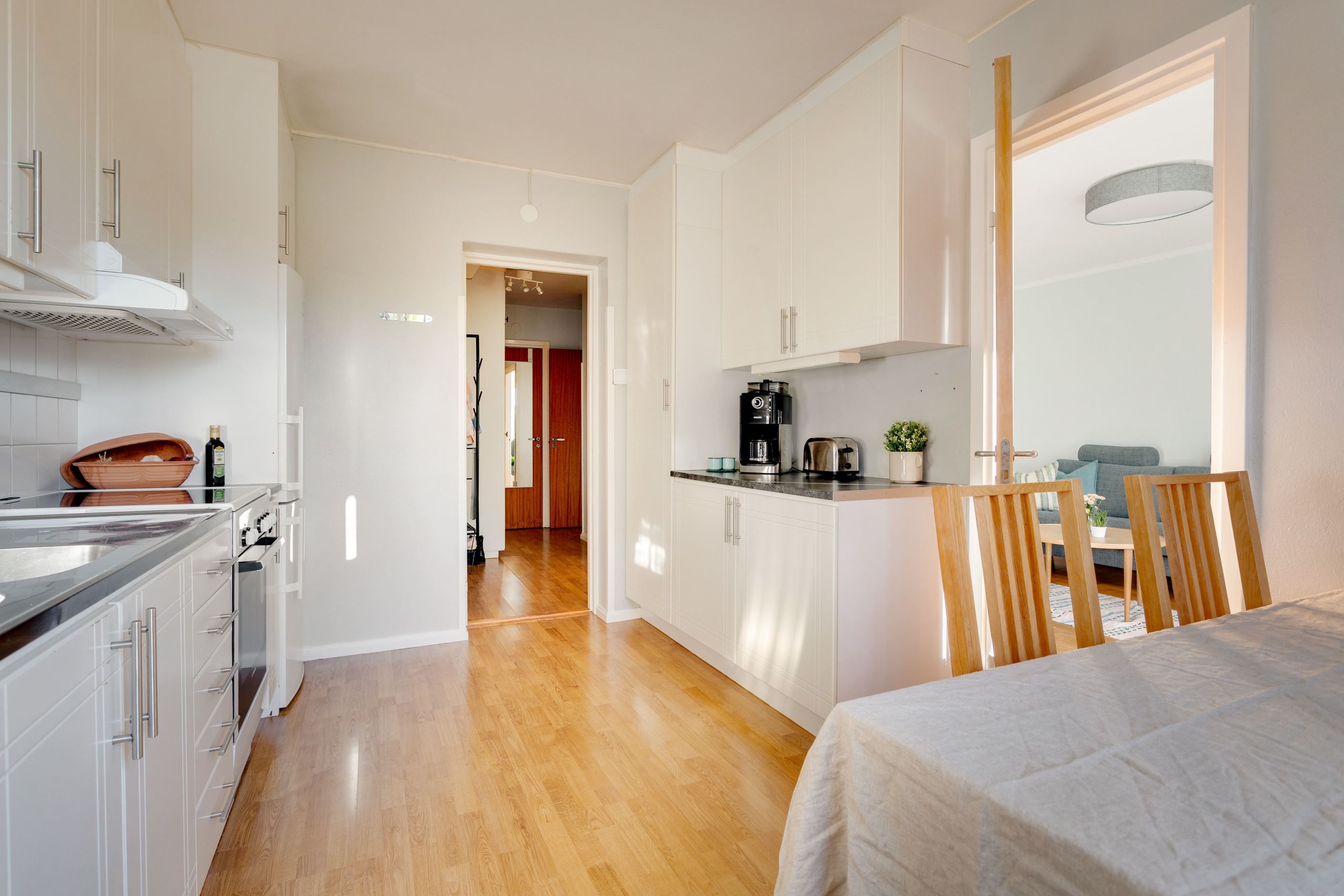 Köket ligger praktiskt vägg i vägg med det lättmöblerade vardagsrummet som har generöst med plats för både en större soff- och sällskapsgrupp liksom bokhyllor och en arbetshörna. Tack vare rummets utformning finns flera möbleringsalternativ - tex. om en önskar en mer öppen planlösning.