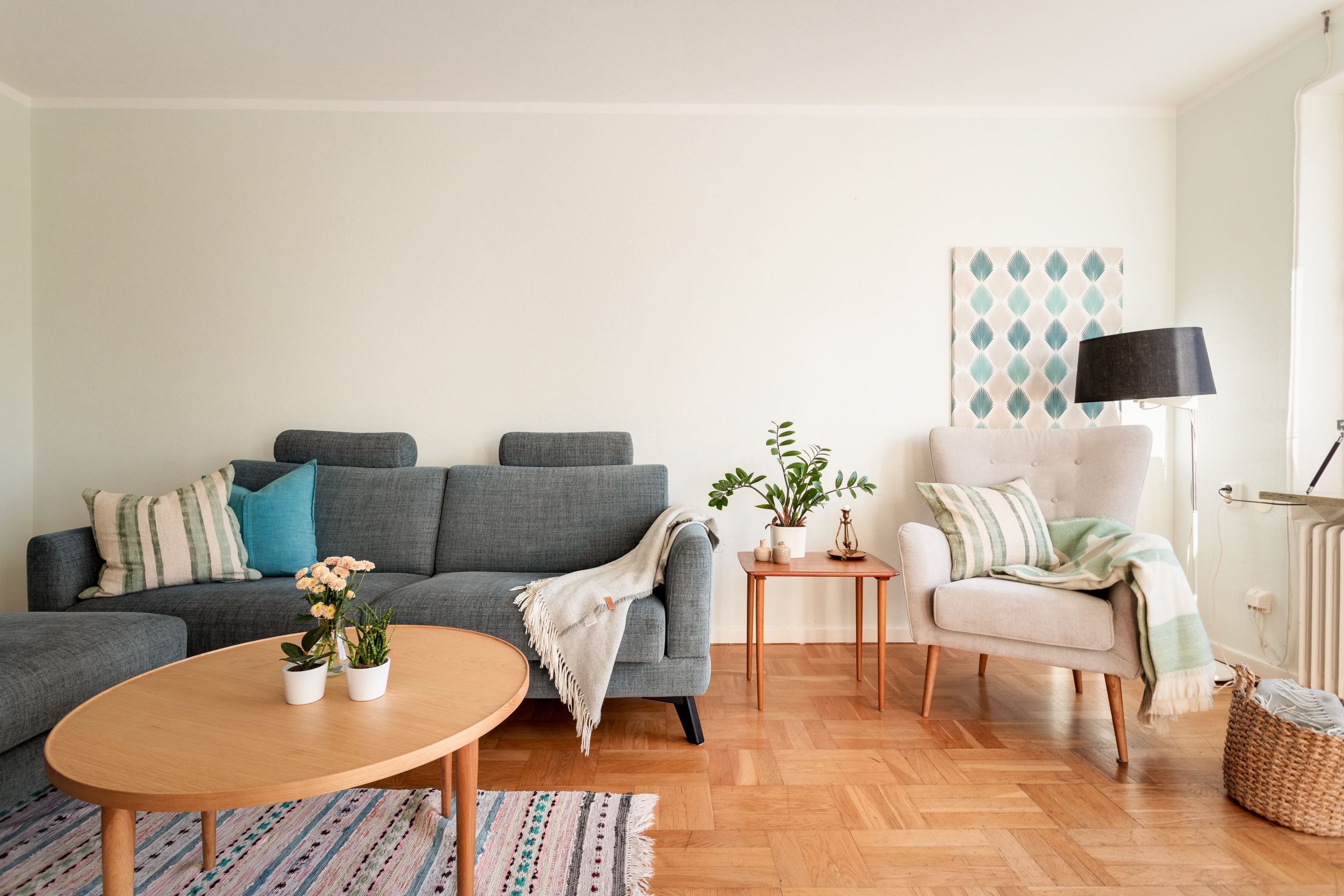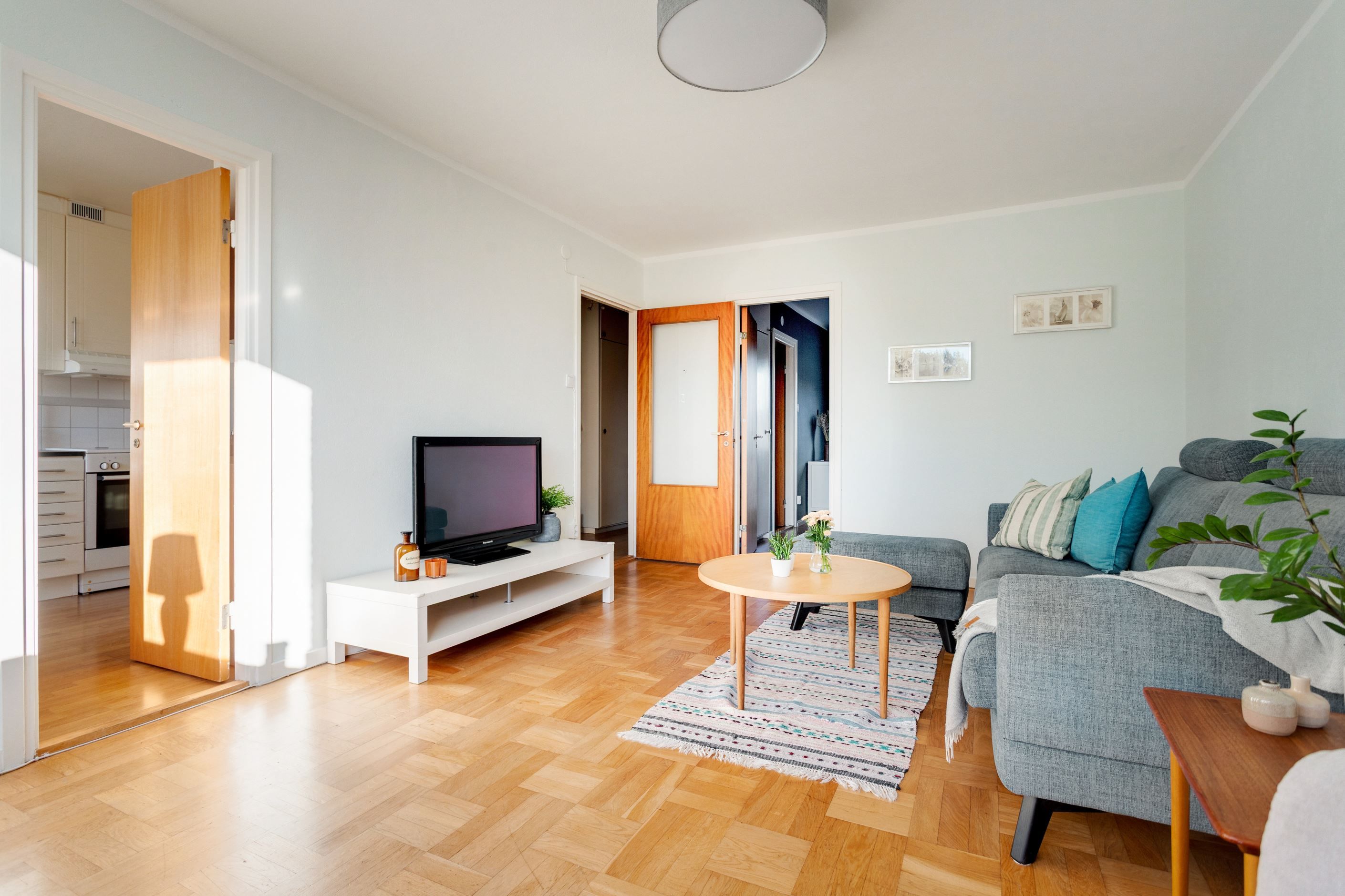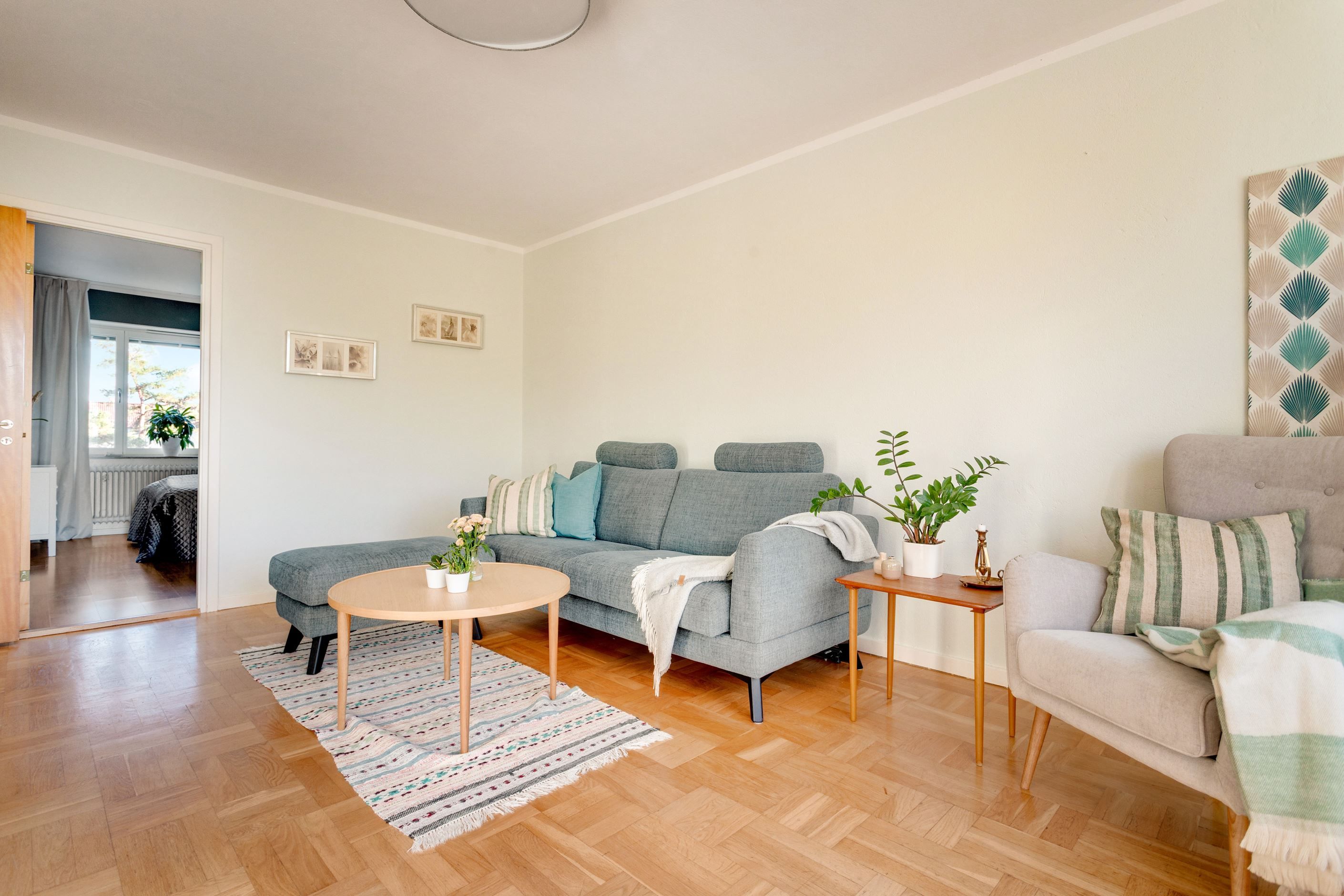Köket ligger praktiskt vägg i vägg med det lättmöblerade vardagsrummet som har generöst med plats för både en större soff- och sällskapsgrupp liksom bokhyllor och en arbetshörna. Tack vare rummets utformning finns flera möbleringsalternativ - tex. om en önskar en mer öppen planlösning.