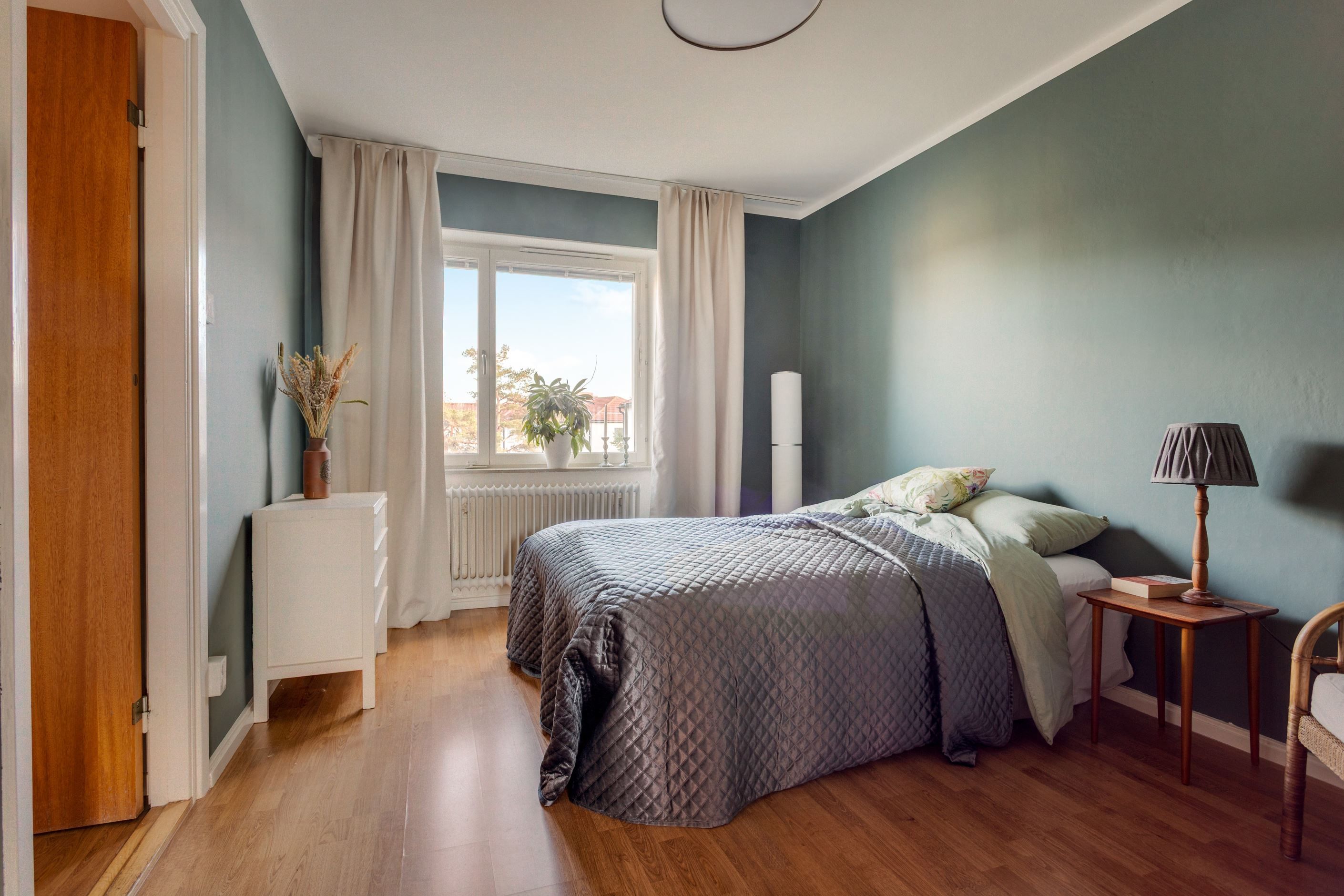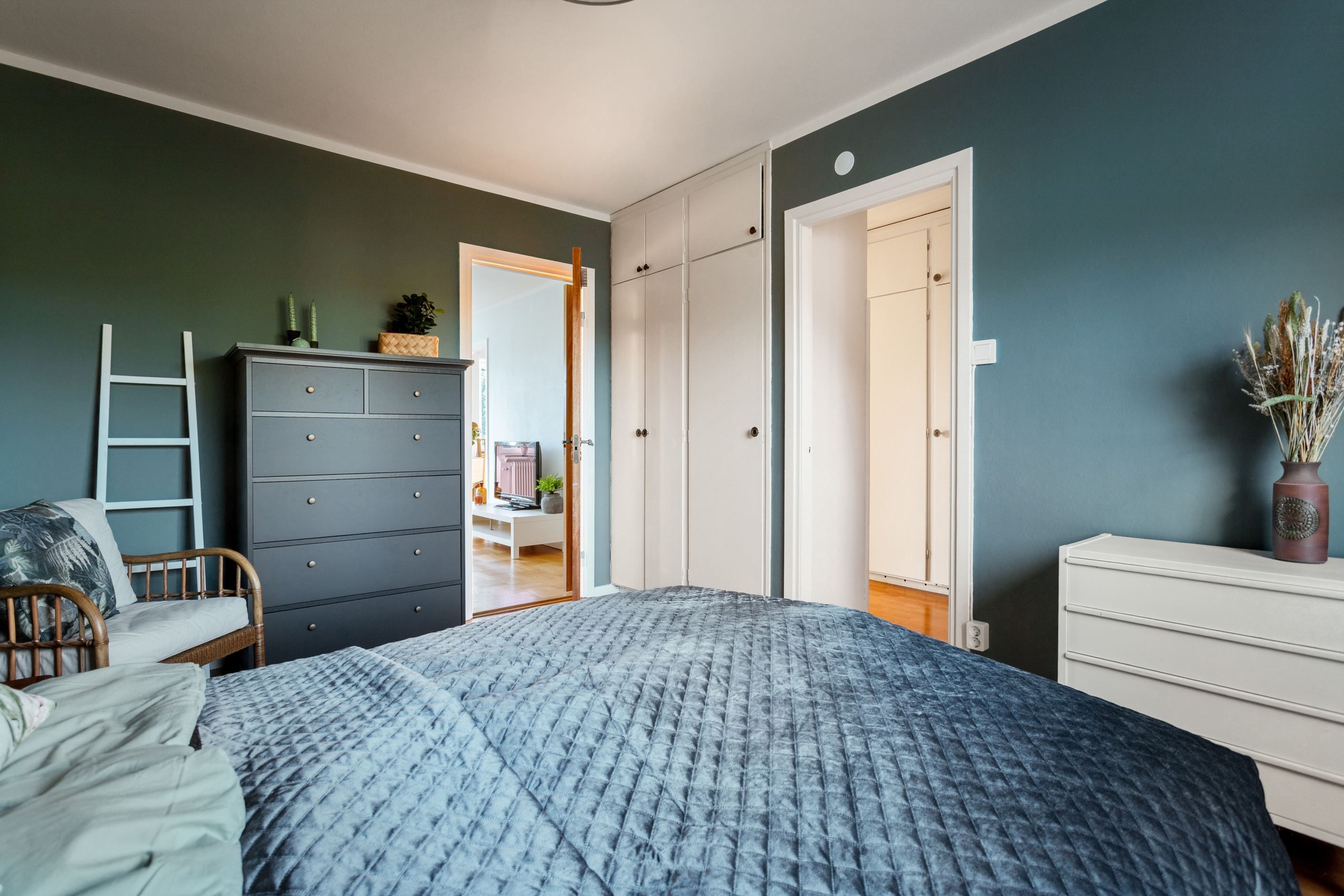 Det väl tilltagna sovrummet är målat en rogivande nyans och är helt fritt från insyn, gott om plats för både dubbelsäng, nattduksbord och byråer.