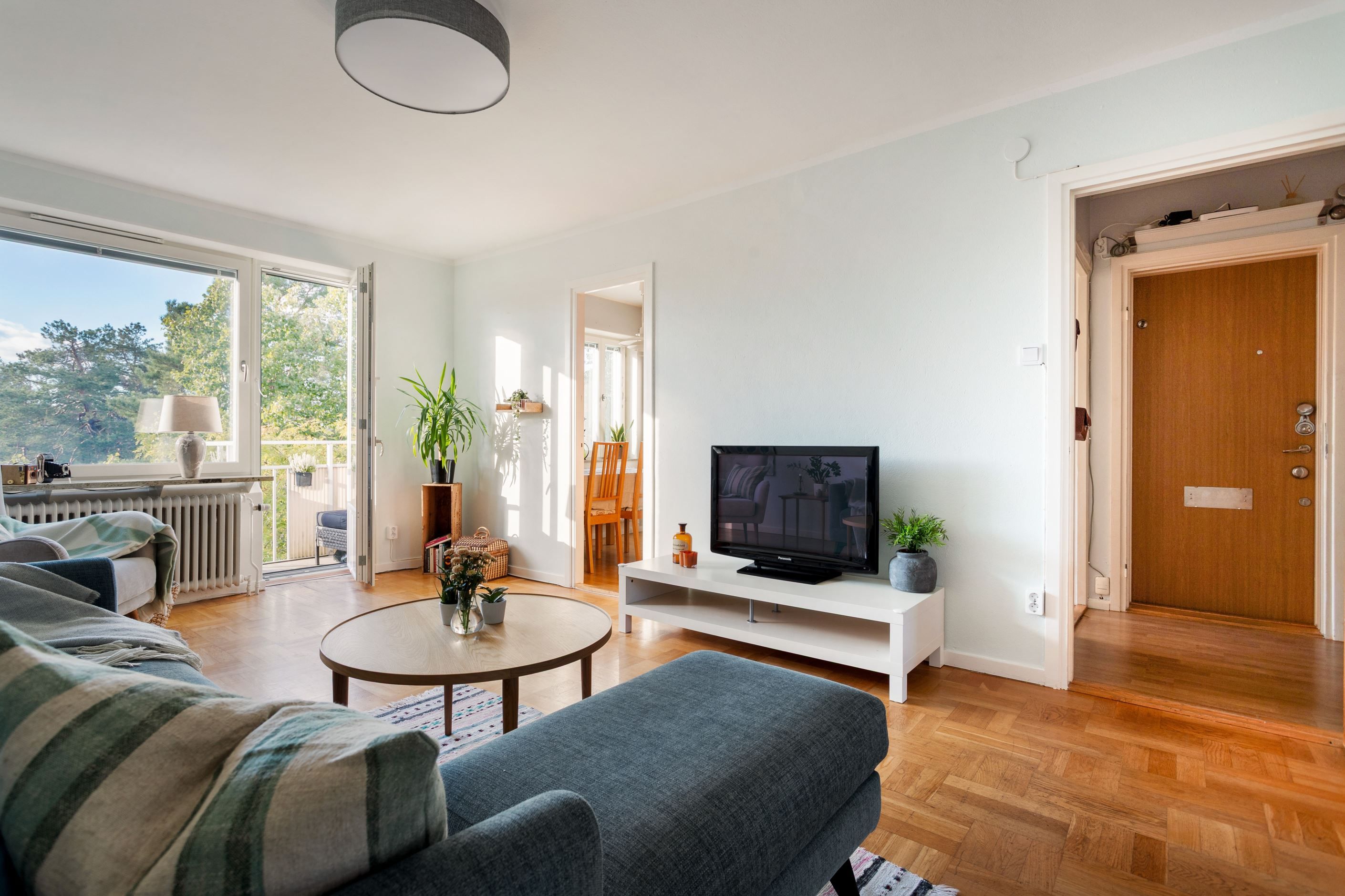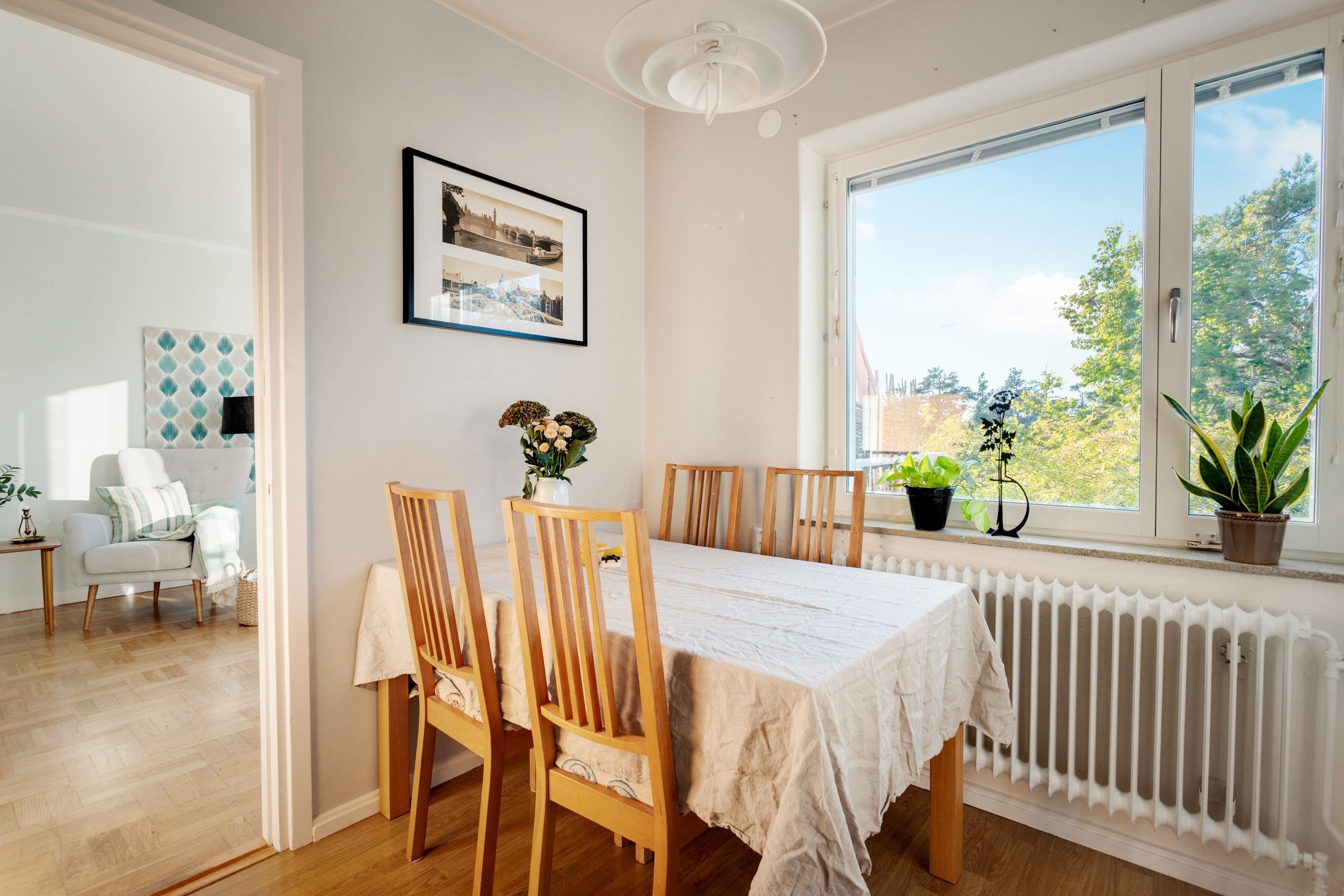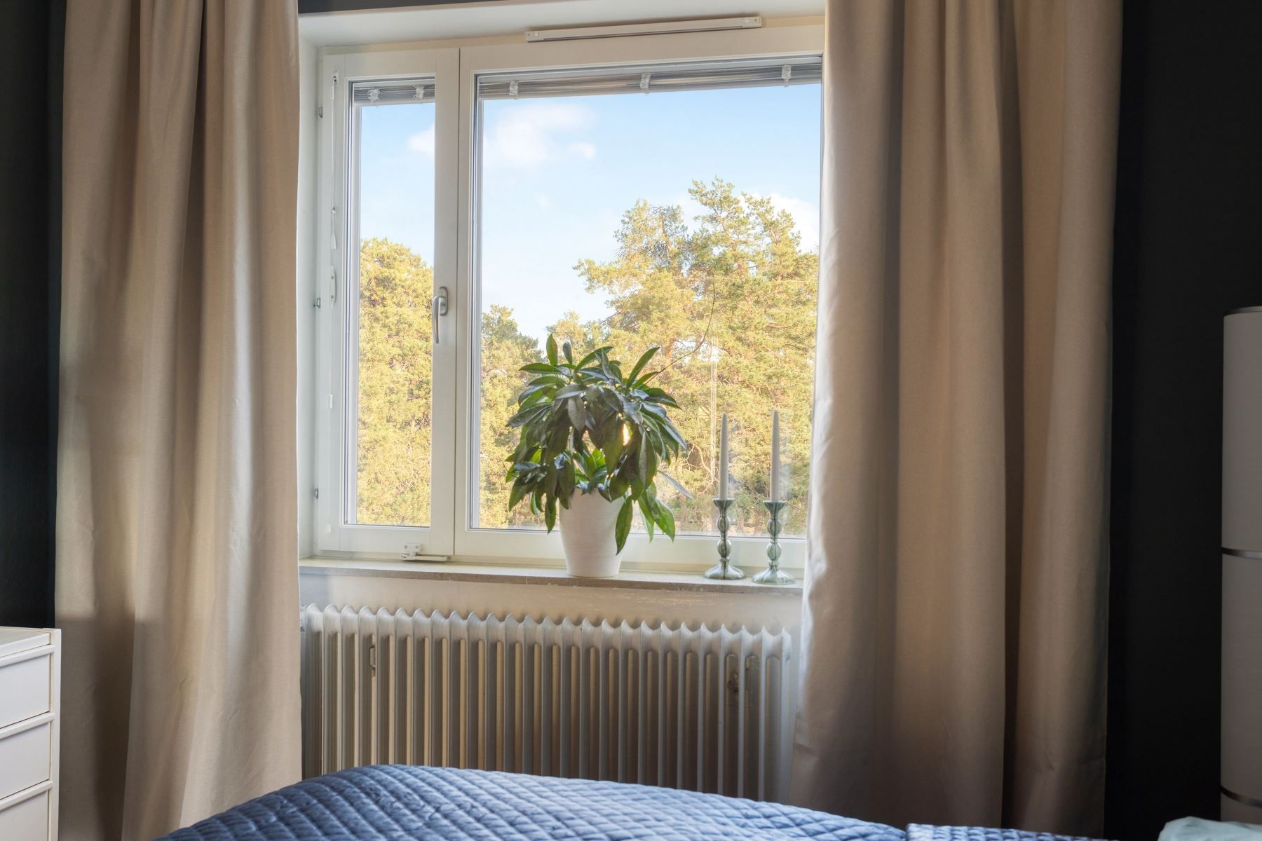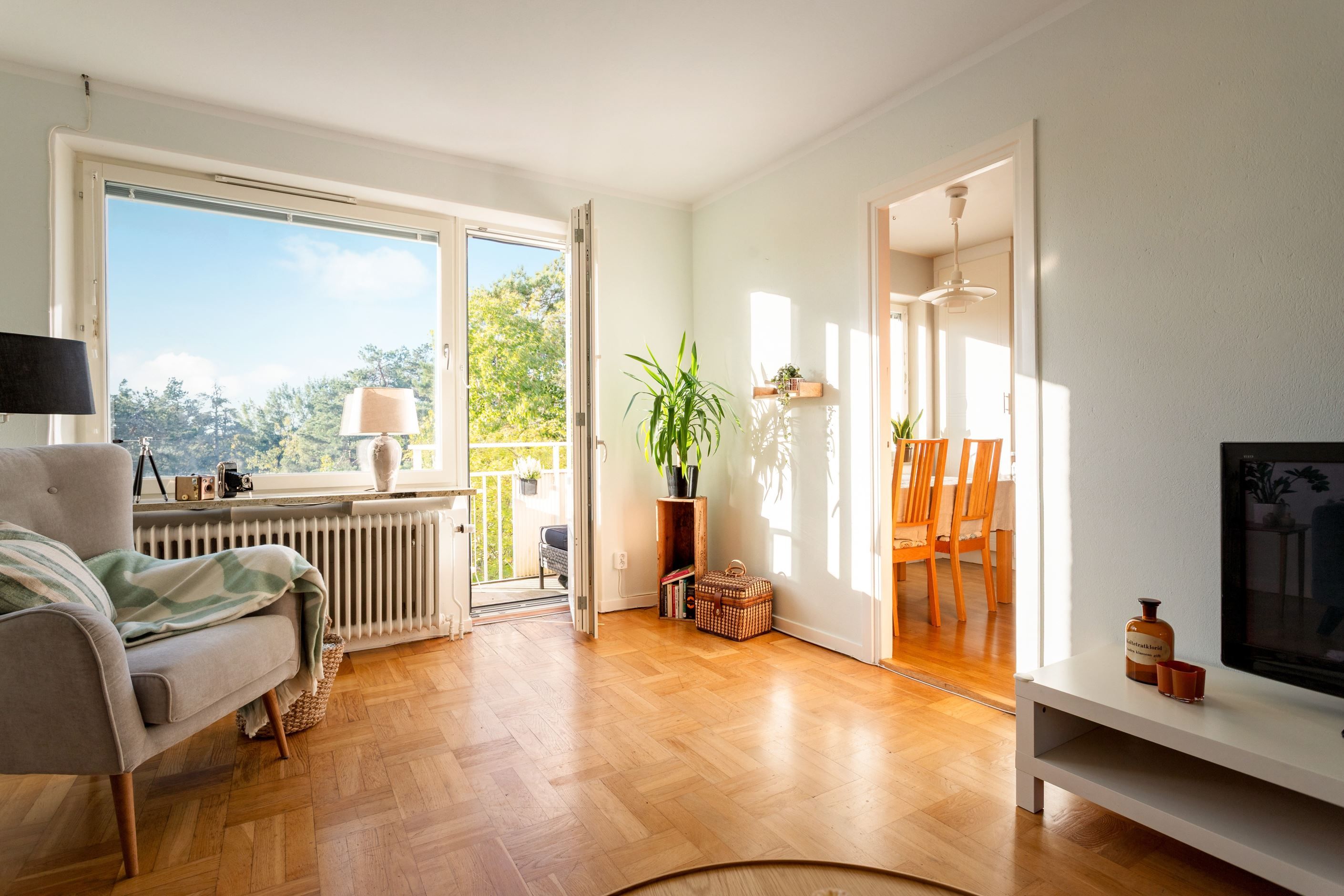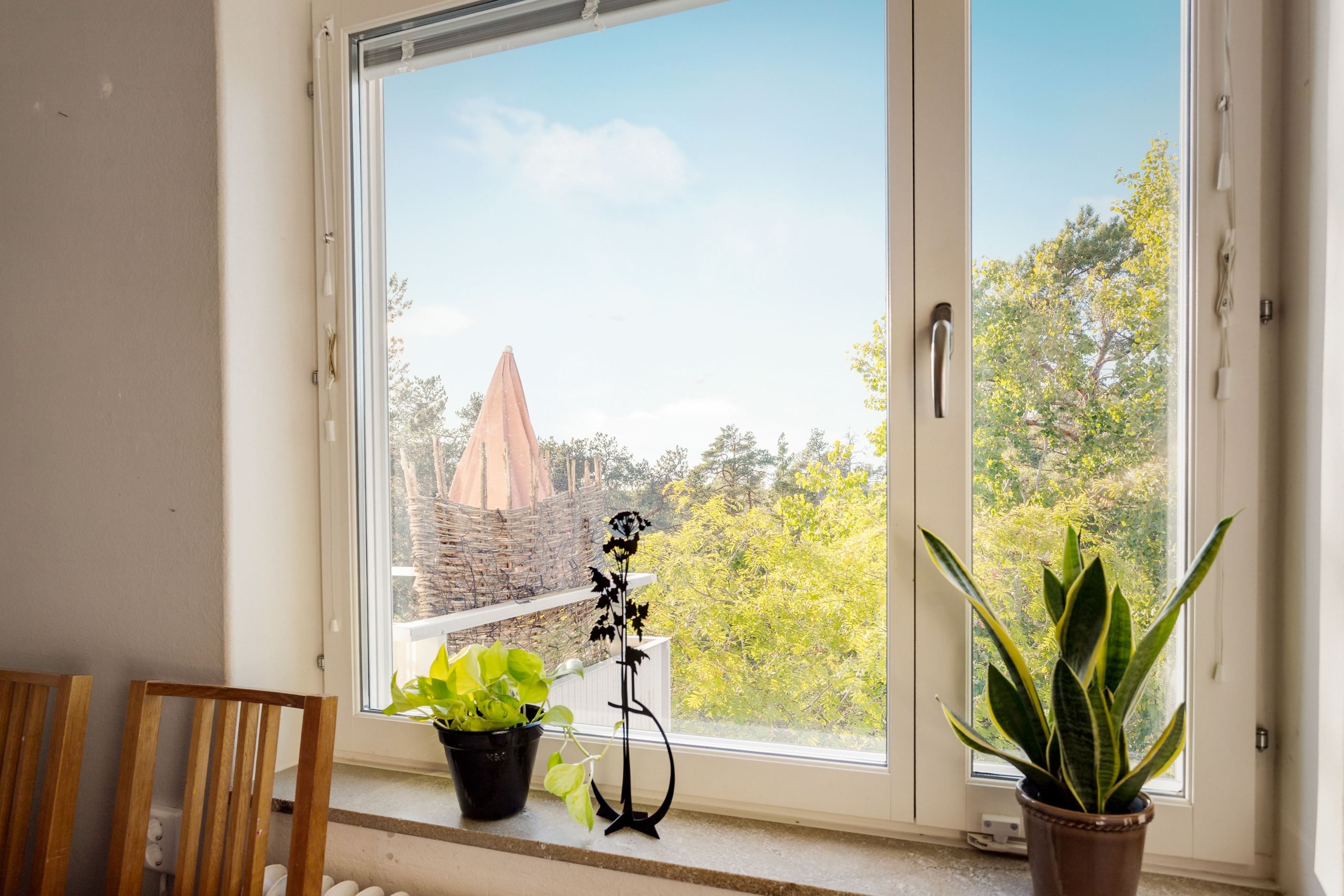 Med ett högt läge bor ni helt fritt från insyn med rogivande utsikt över trädtoppar och grönskande omgivning. I lägenheten finns gott om förvaringsutrymmen i flera rejäla garderober varav flera i original.