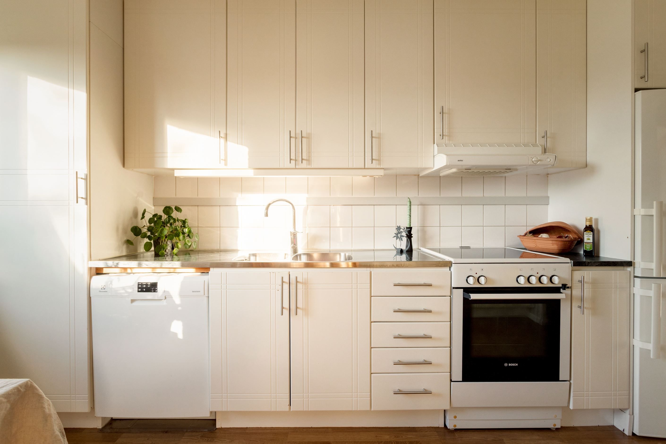 Köket är välutrustat och det finns goda arbets- och förvaringsutrymmen.