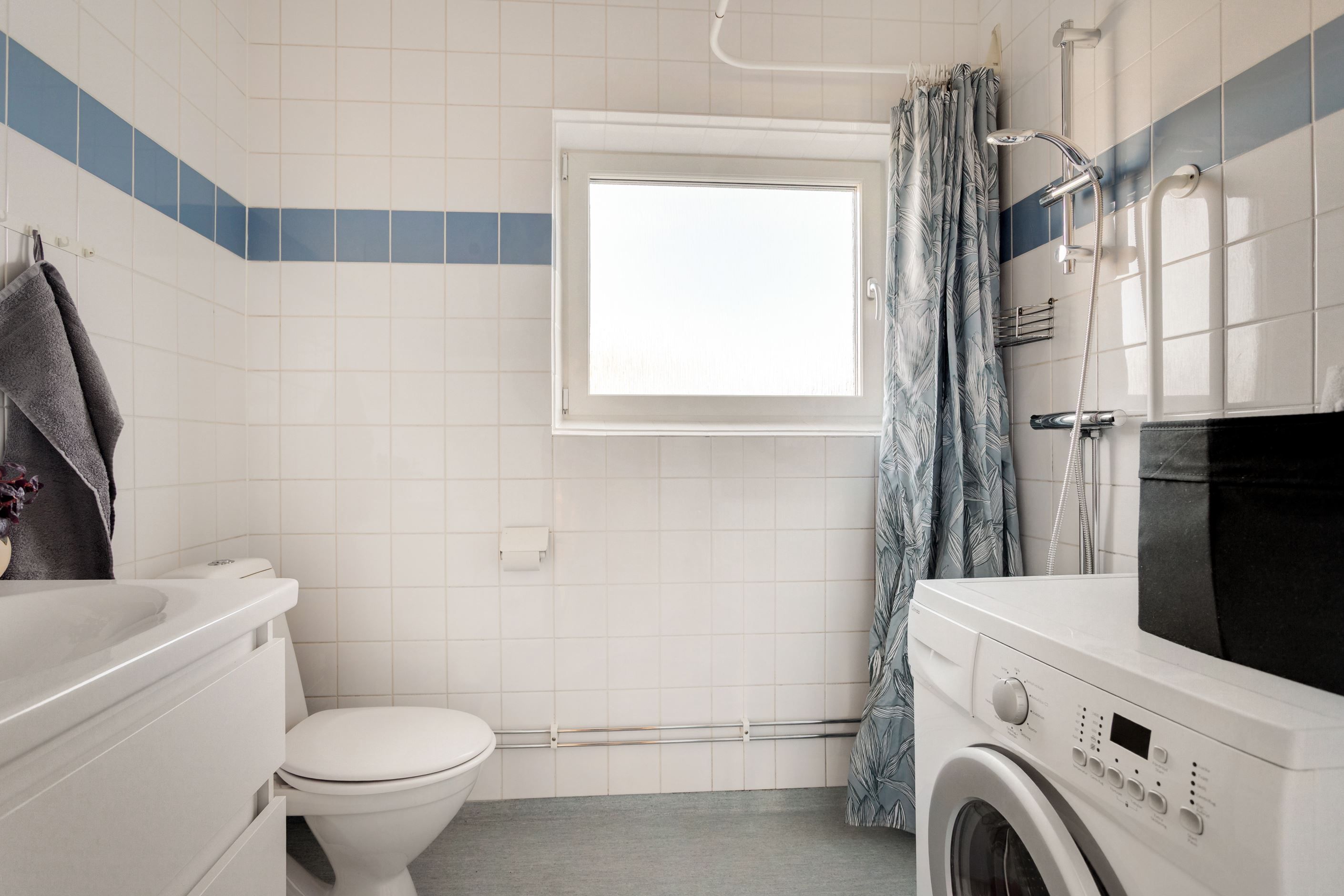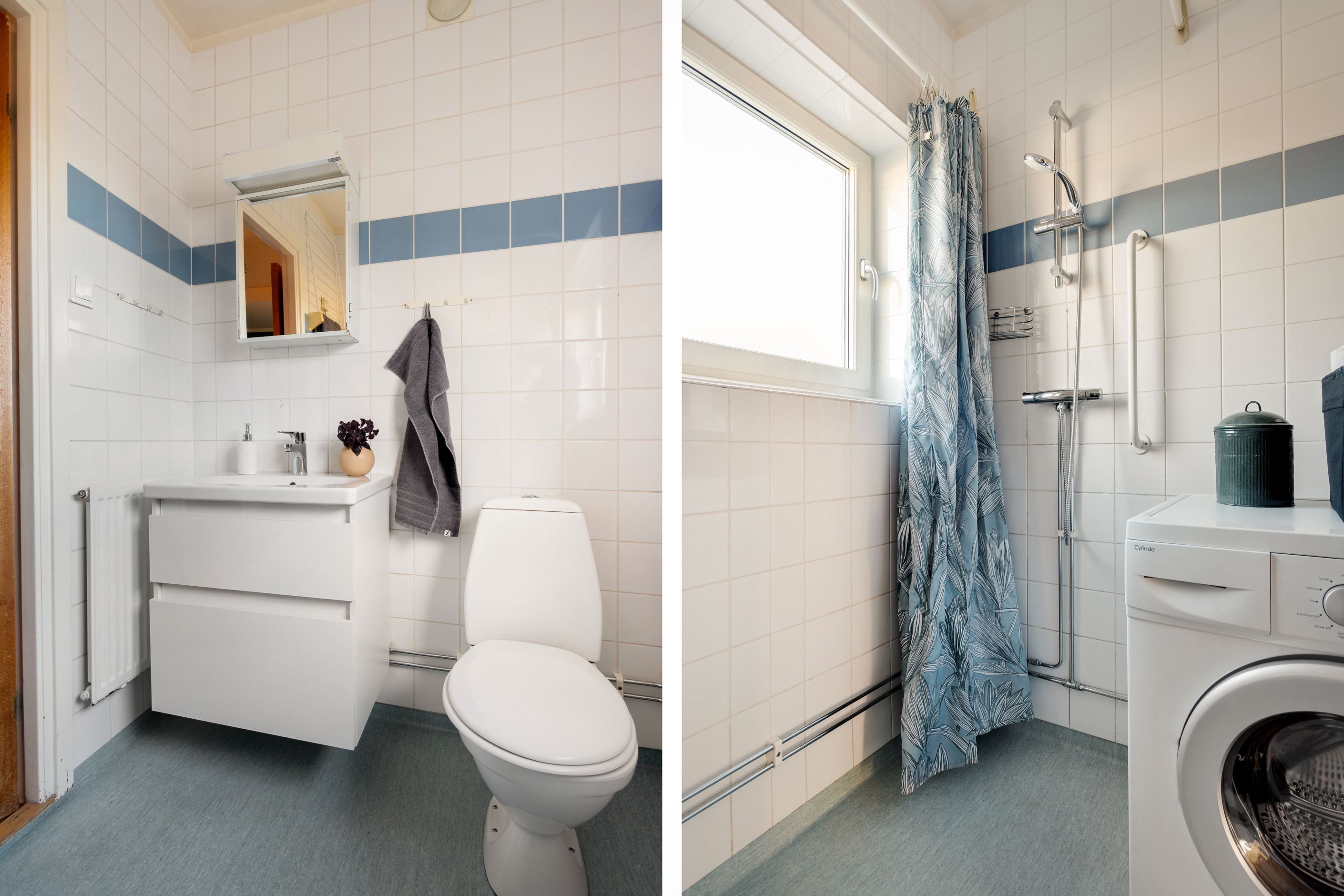Badrummet är ljust och utrustat med en rejäl handfatskommod, badrumsskåp och tvättmaskin.