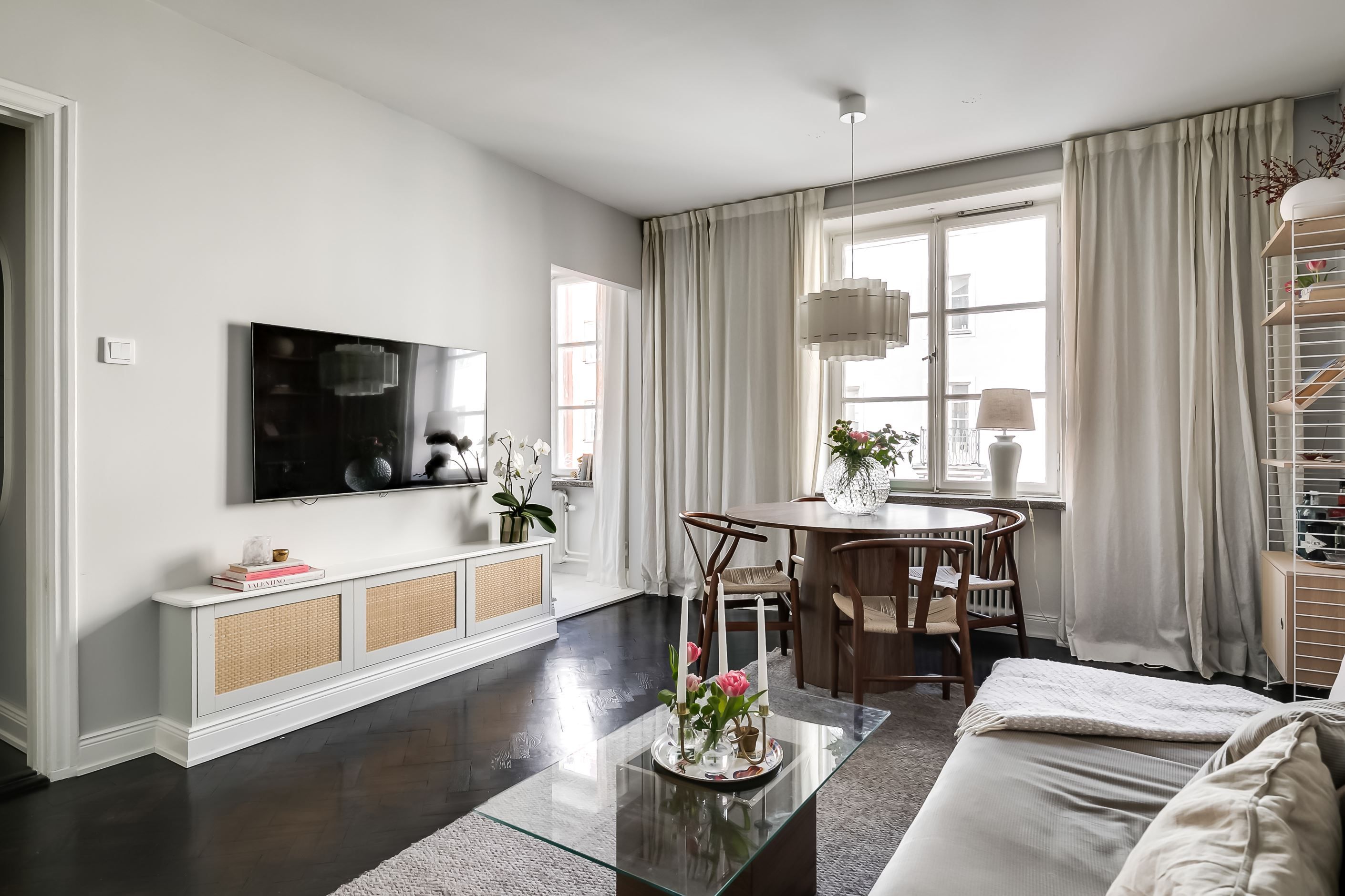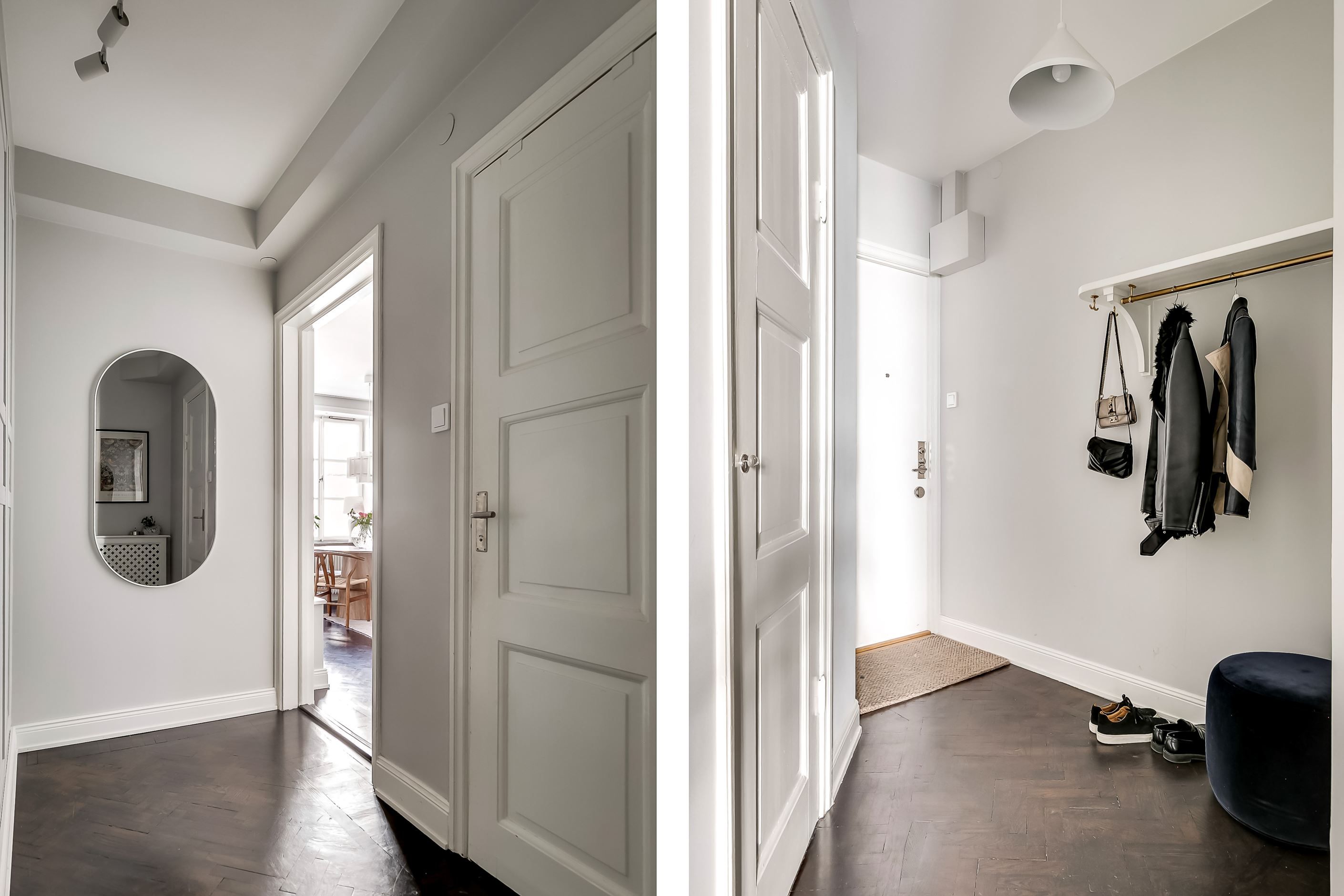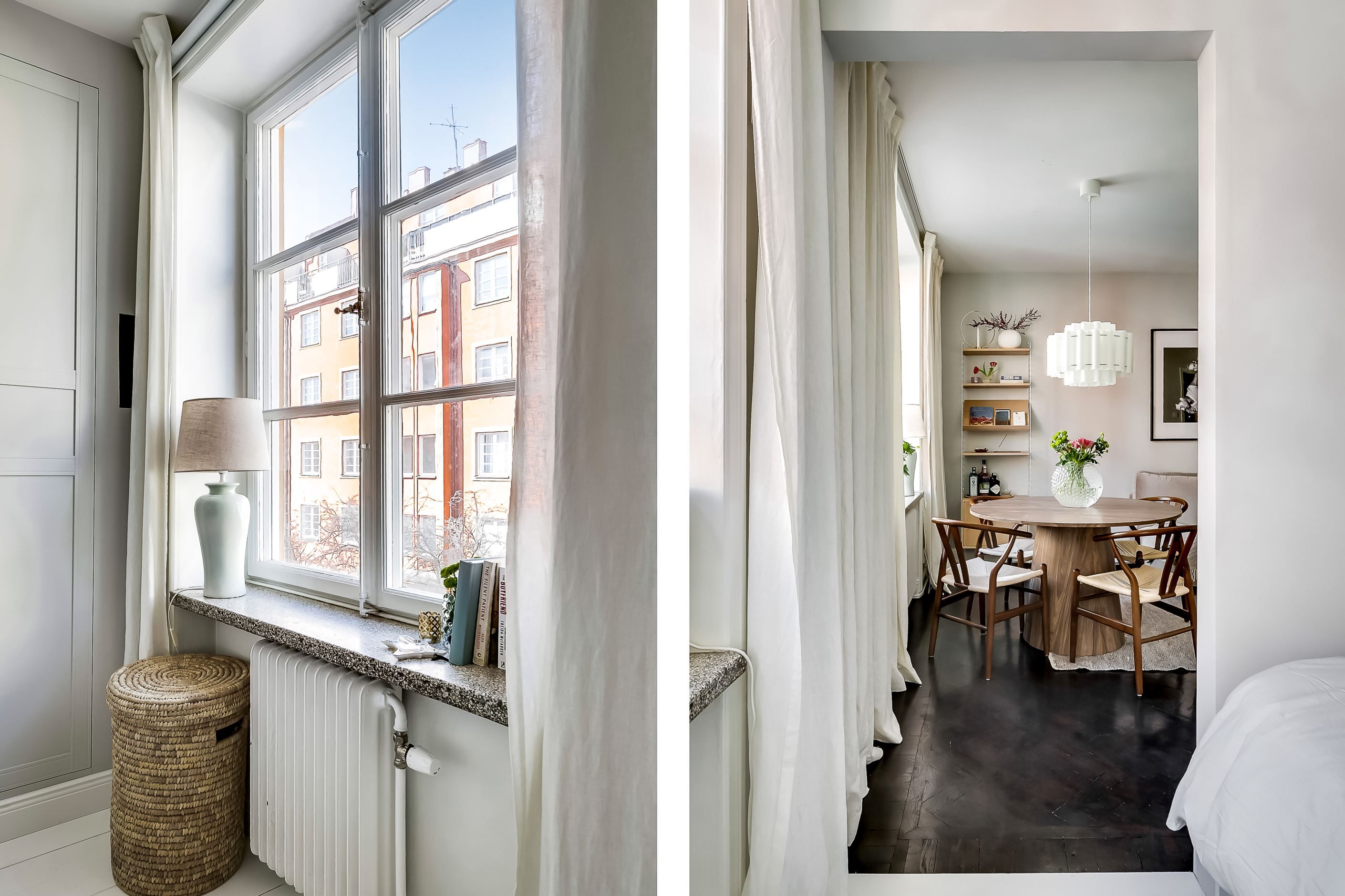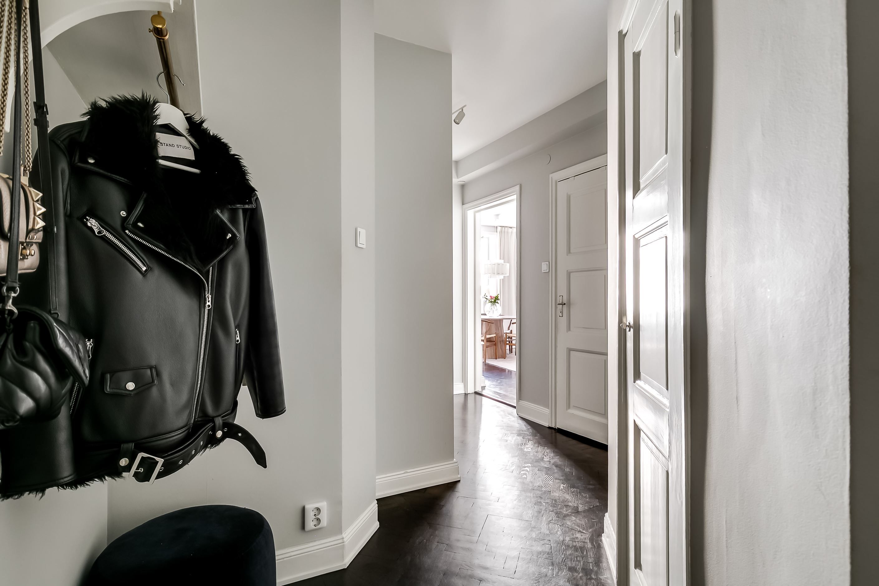Redan när du kliver in möts du av den generösa takhöjden, de spröjsade fönstren med djupa nischer och den vackra fiskbensparketten som löper in genom bostaden. Ljuset flödar in och skapar en varm och inbjudande atmosfär där klassiska detaljer möter ljusa, stilrena ytskikt i perfekt harmoni.