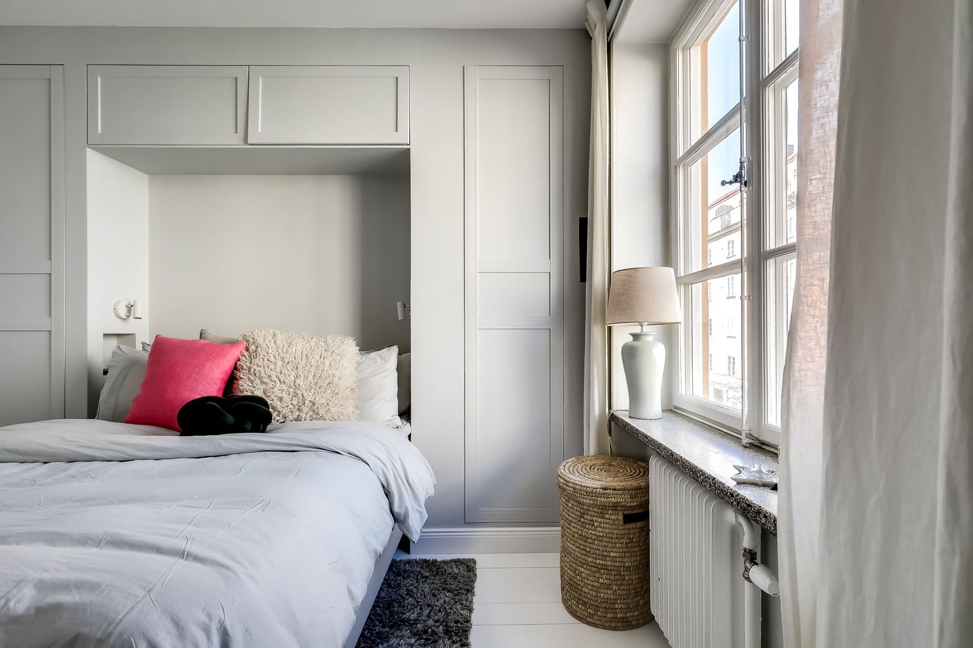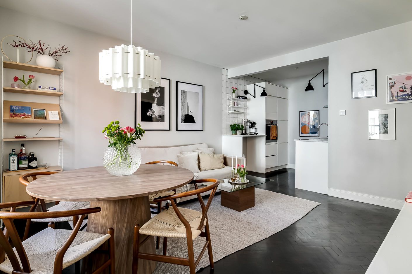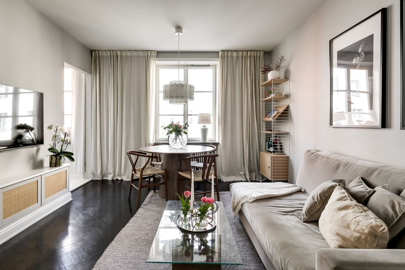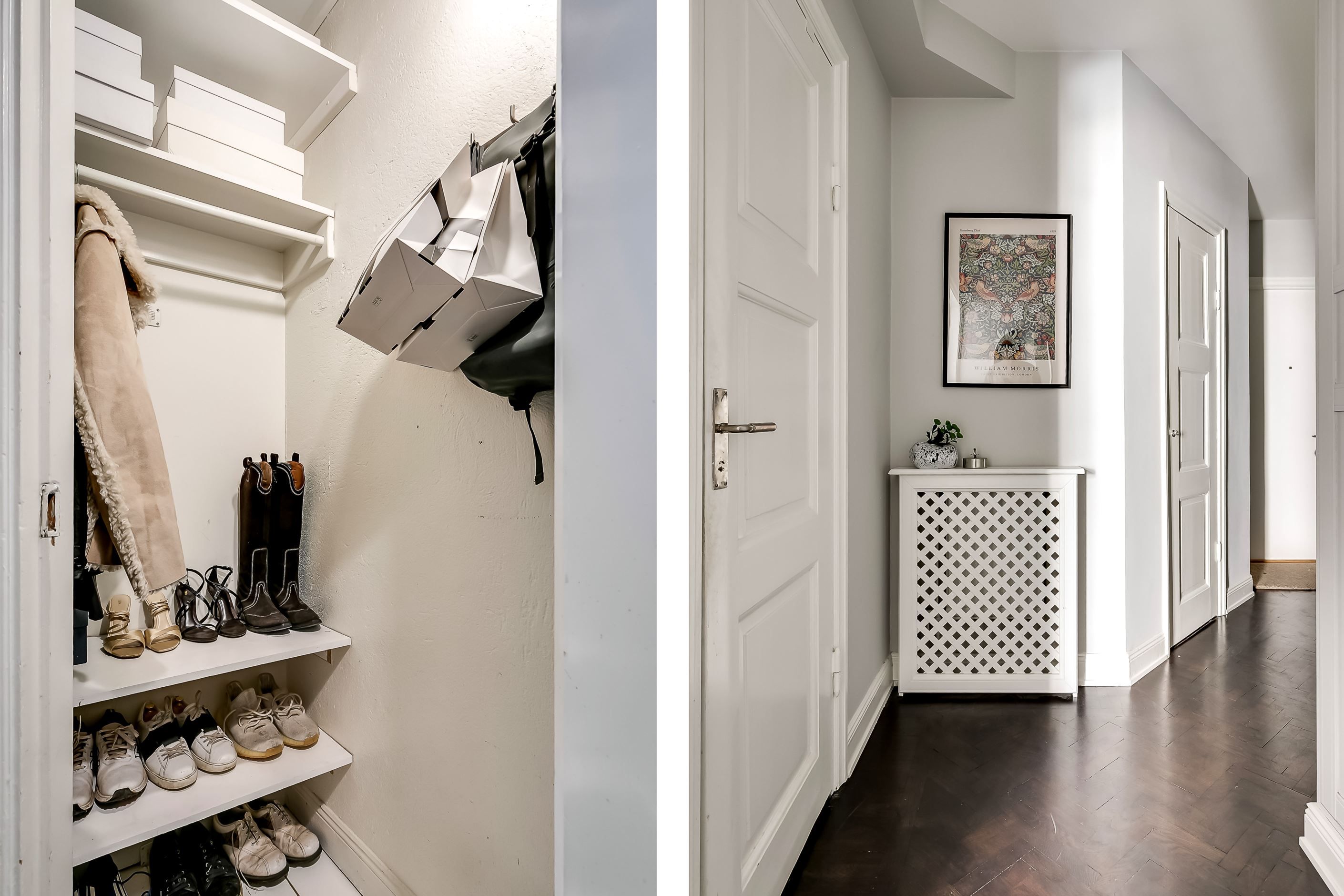 Redan när du kliver in möts du av den generösa takhöjden, de spröjsade fönstren med djupa nischer och den vackra fiskbensparketten som löper in genom bostaden. Ljuset flödar in och skapar en varm och inbjudande atmosfär där klassiska detaljer möter ljusa, stilrena ytskikt i perfekt harmoni.