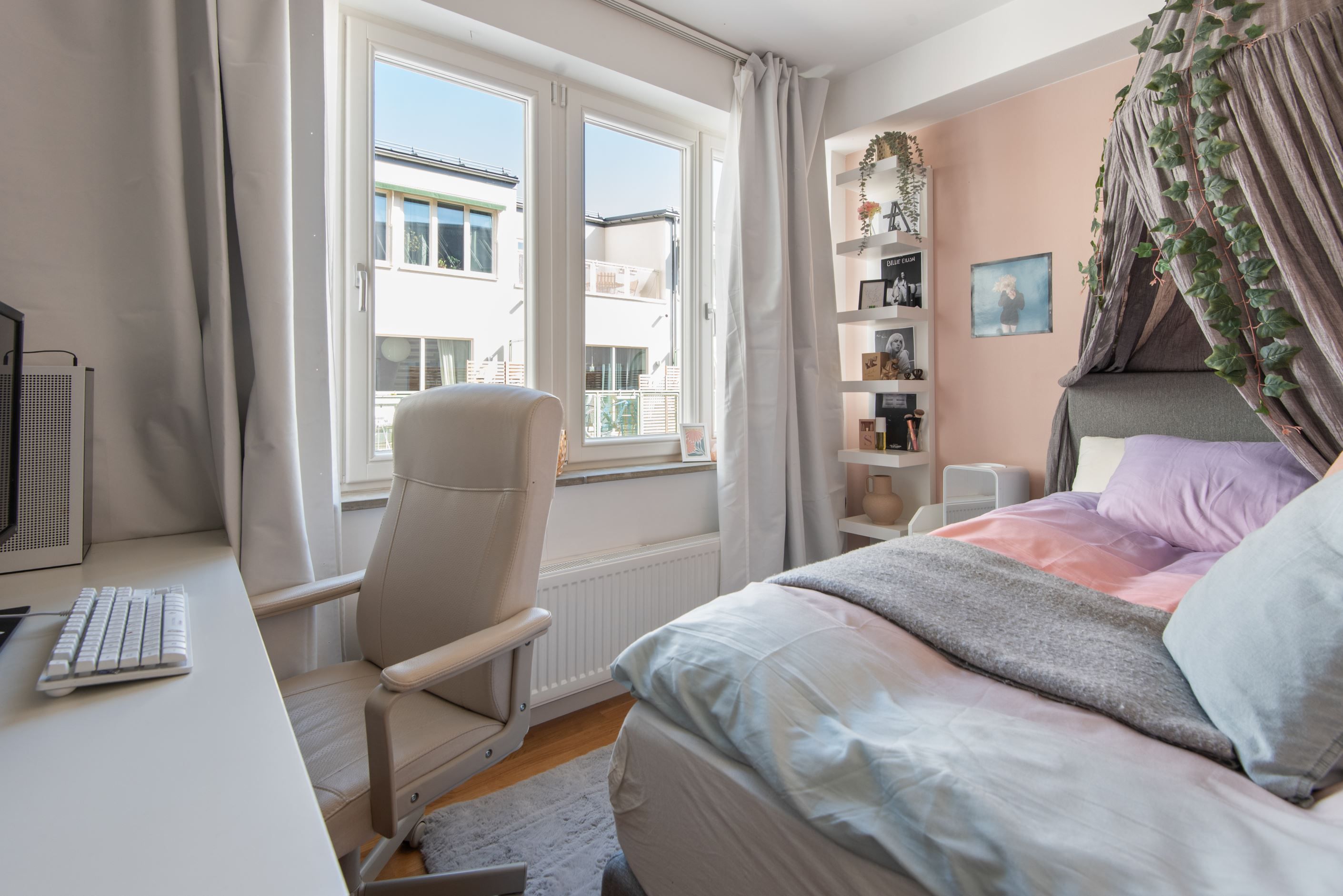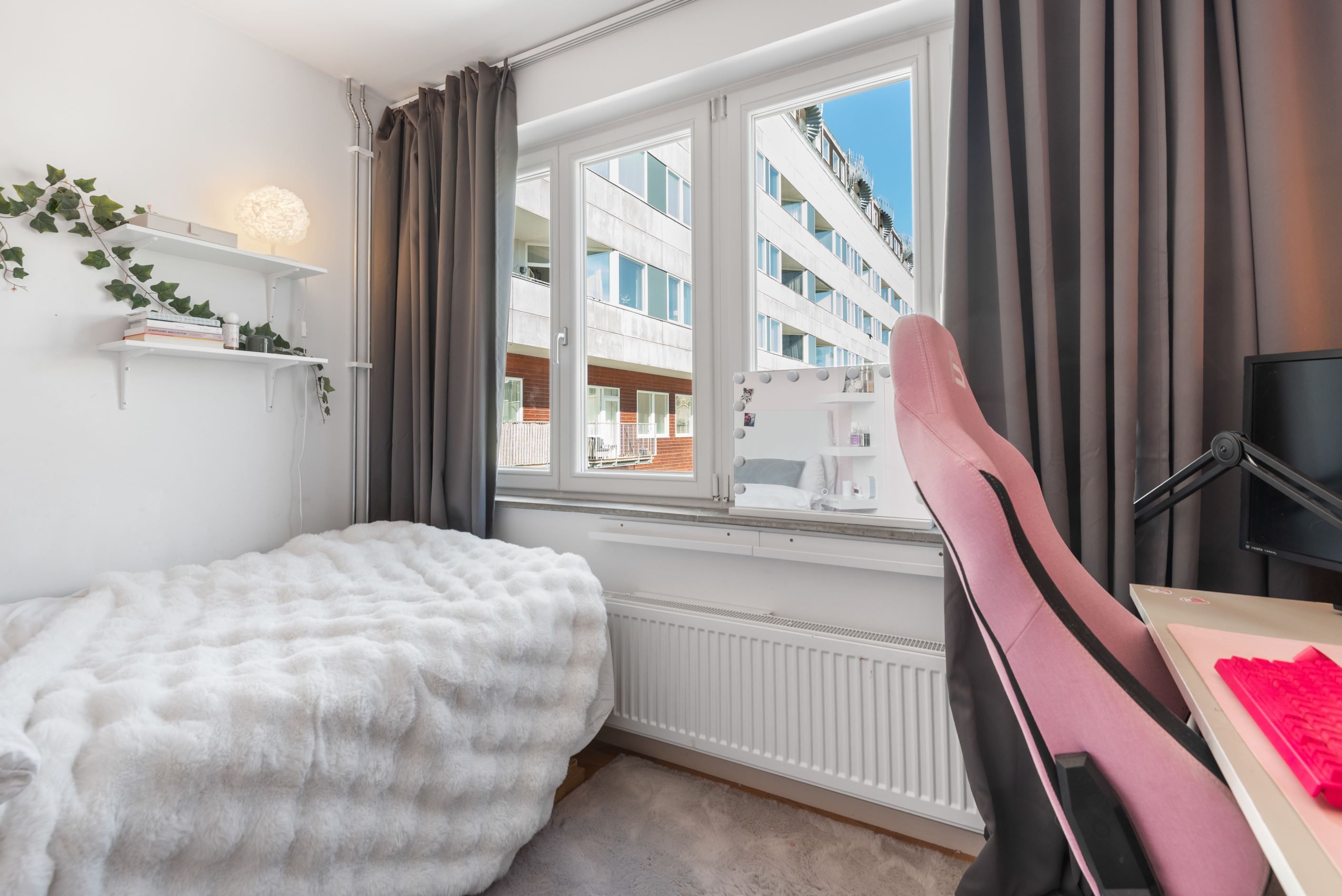 Bostaden erbjuder en öppen och luftig planlösning med genomtänkta materialval och stilrena detaljer inklusive industriella inslag. Direkt vid entrén möts du av ett inbjudande kök med bardisk som skapar en naturlig samlingspunkt. Lägenheten rymmer tre sovrum på entréplan, där två av dem nås via en gemensam ingång, vilket ger en flexibel och praktisk planlösning. Badrummet är praktiskt placerat och utrustat med bekvämligheter som golvvärme, tvättmöjligheter och dusch.