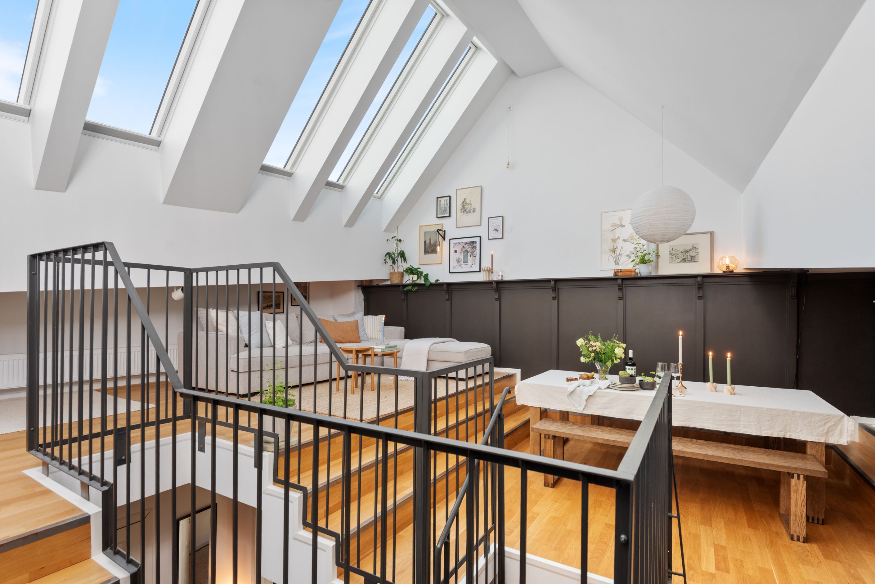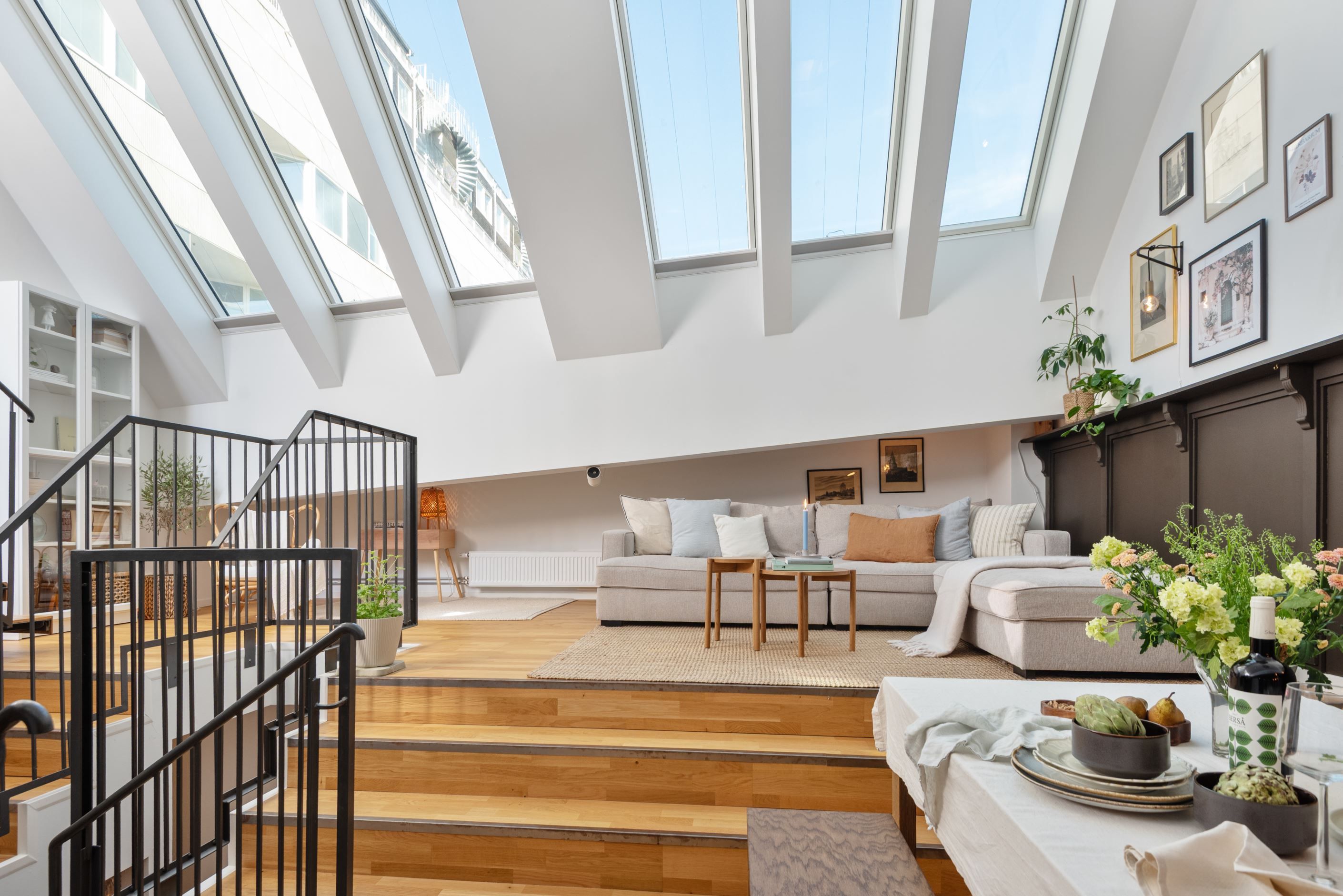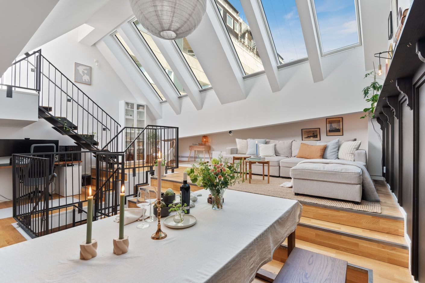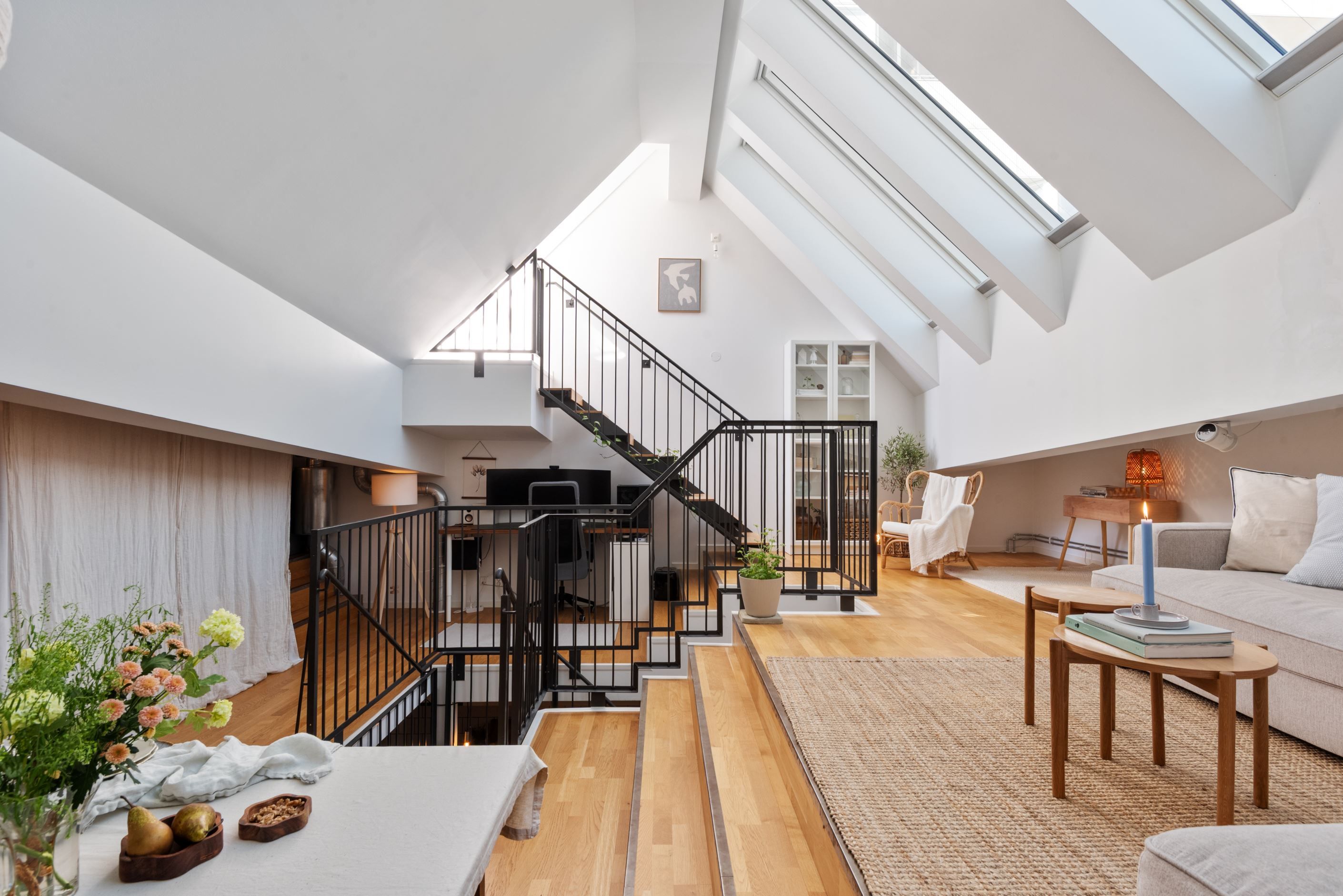 En våning upp väntar en fantastisk rymd med imponerande takhöjd på över fem meter och synliga takbjälkar som ger bostaden en unik karaktär. Här finns gott om plats för ett stort middagsbord samt sociala ytor för umgänge och även hemma kontors möjlighet. På övervåningen finns även en del som har fungerat som en sovalkov, med plats för en dubbelsäng. Från detta plan når du även den privata takterrassen – en perfekt plats för soliga dagar, middagar utomhus och lugna kvällar.