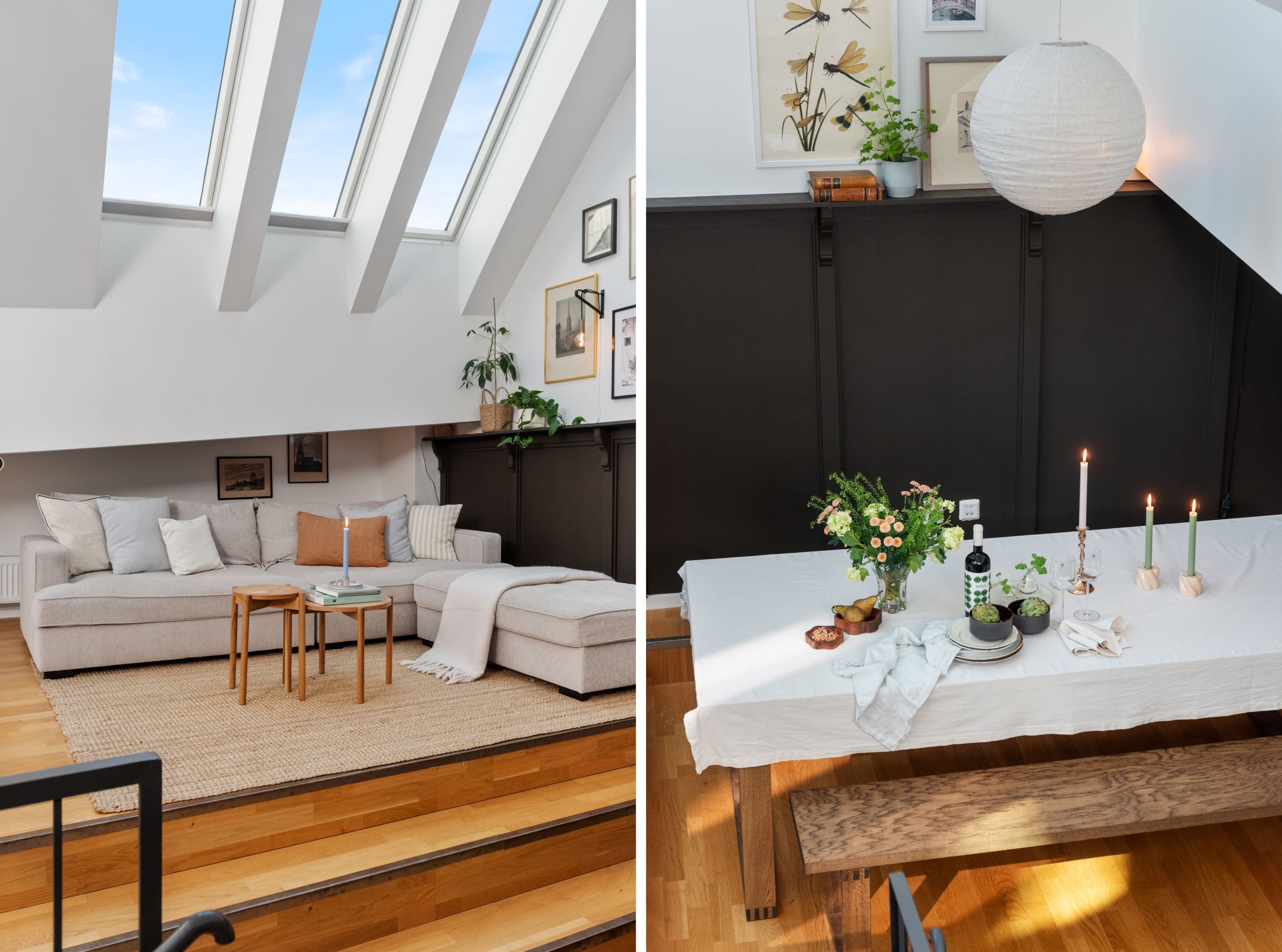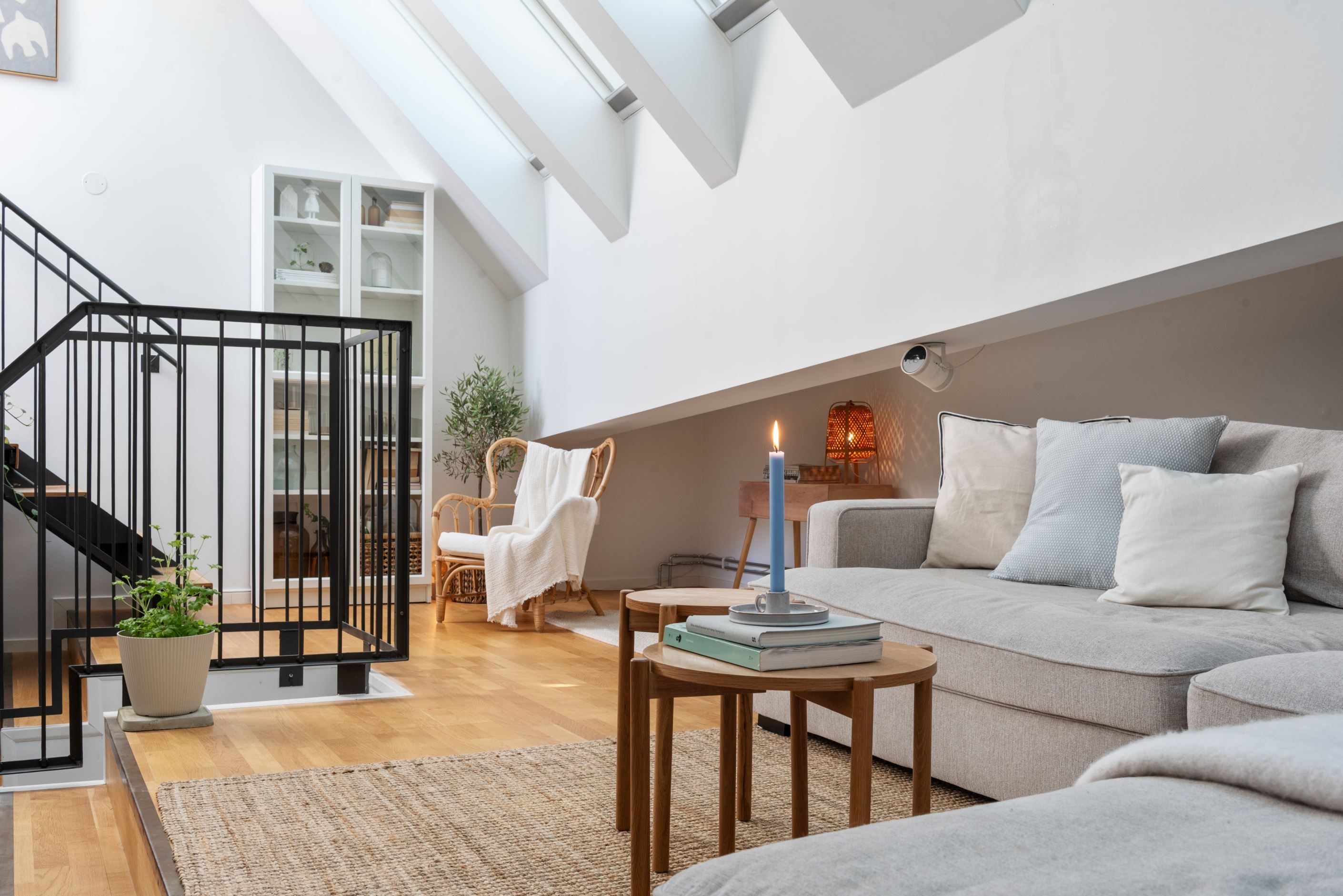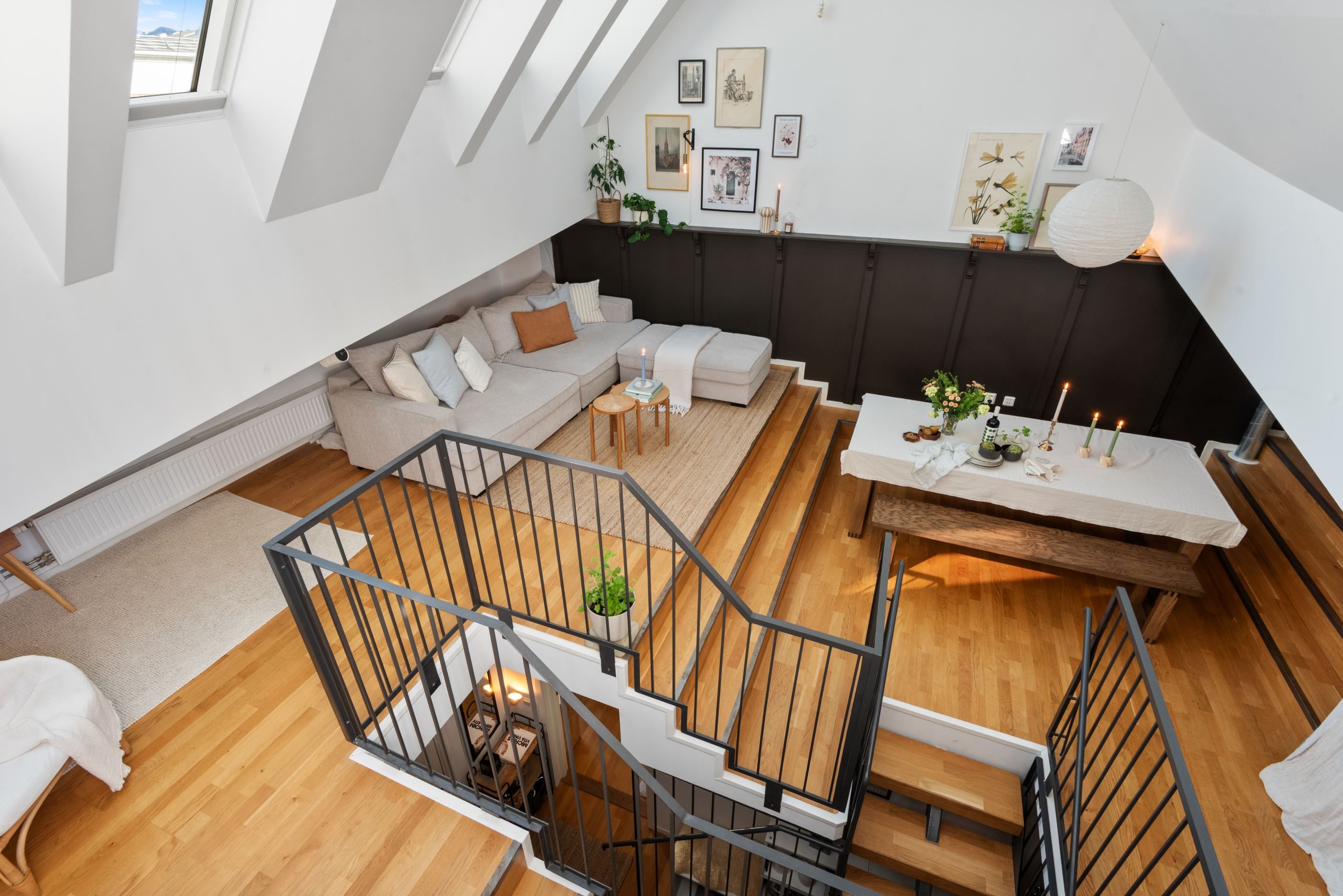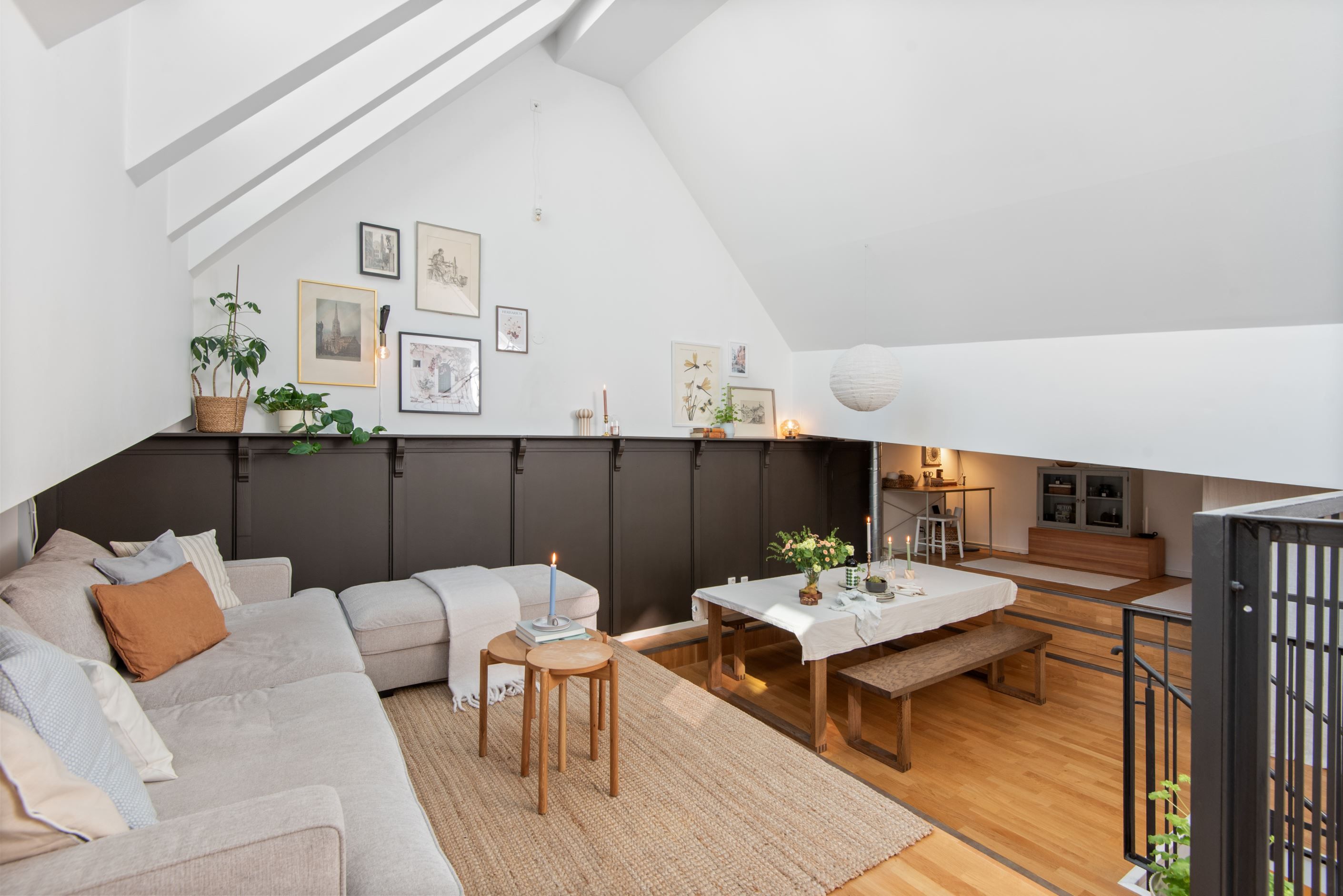 En våning upp väntar en fantastisk rymd med imponerande takhöjd på över fem meter och synliga takbjälkar som ger bostaden en unik karaktär. Här finns gott om plats för ett stort middagsbord samt sociala ytor för umgänge och även hemma kontors möjlighet. På övervåningen finns även en del som har fungerat som en sovalkov, med plats för en dubbelsäng. Från detta plan når du även den privata takterrassen – en perfekt plats för soliga dagar, middagar utomhus och lugna kvällar.