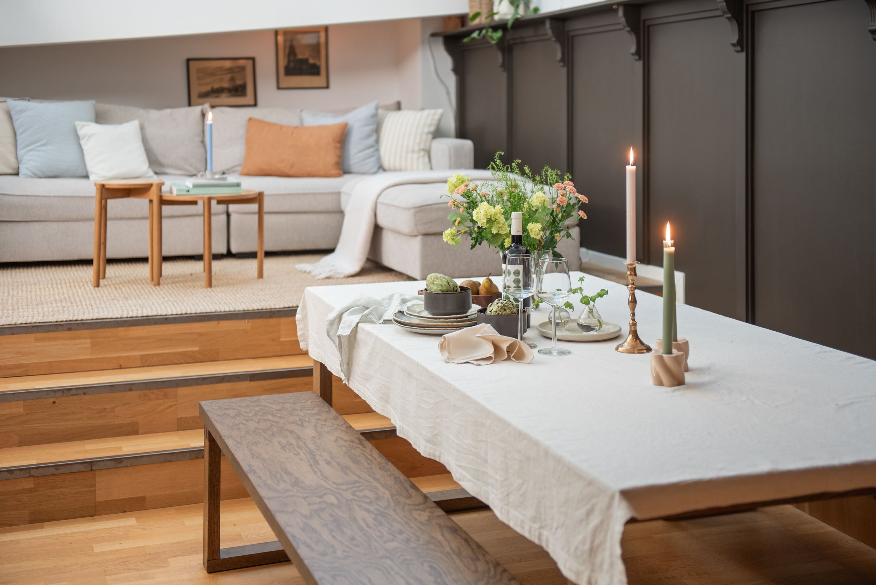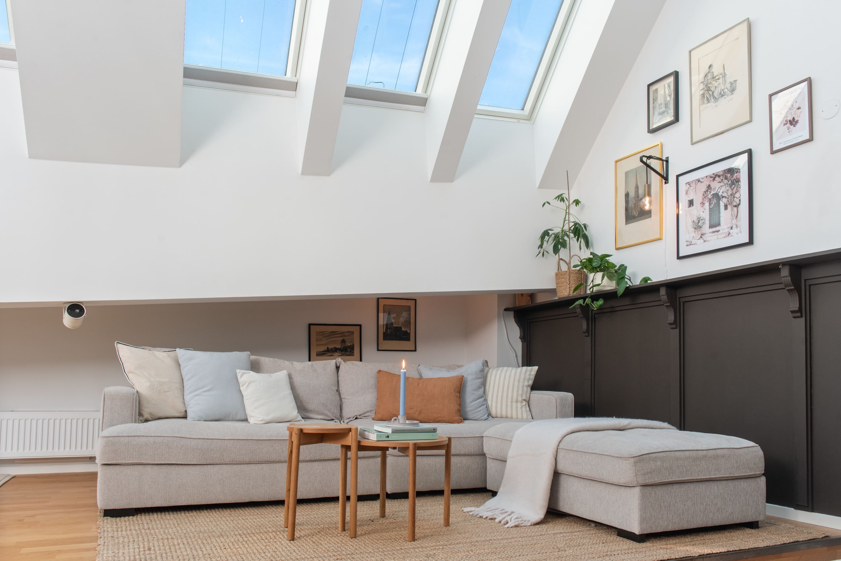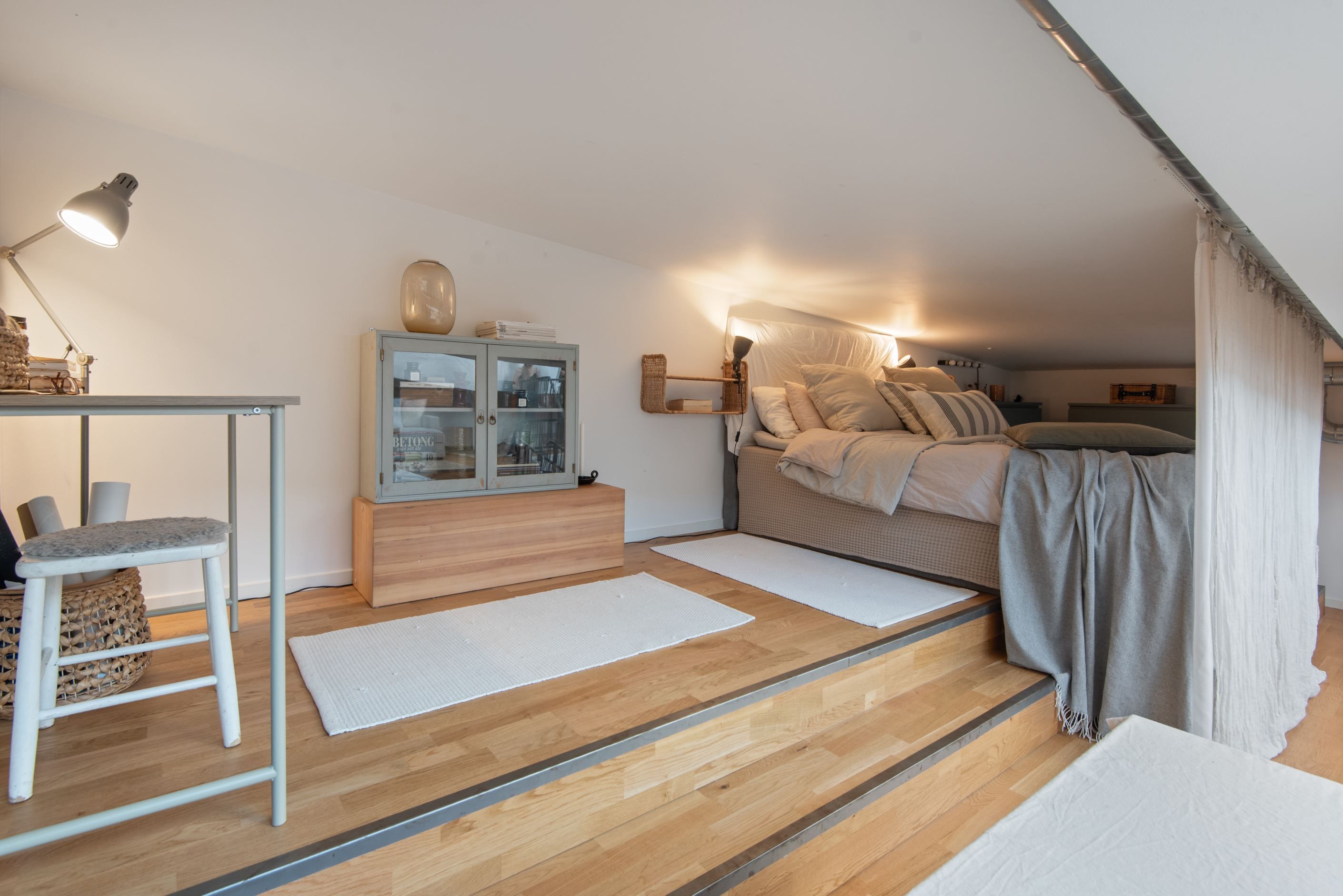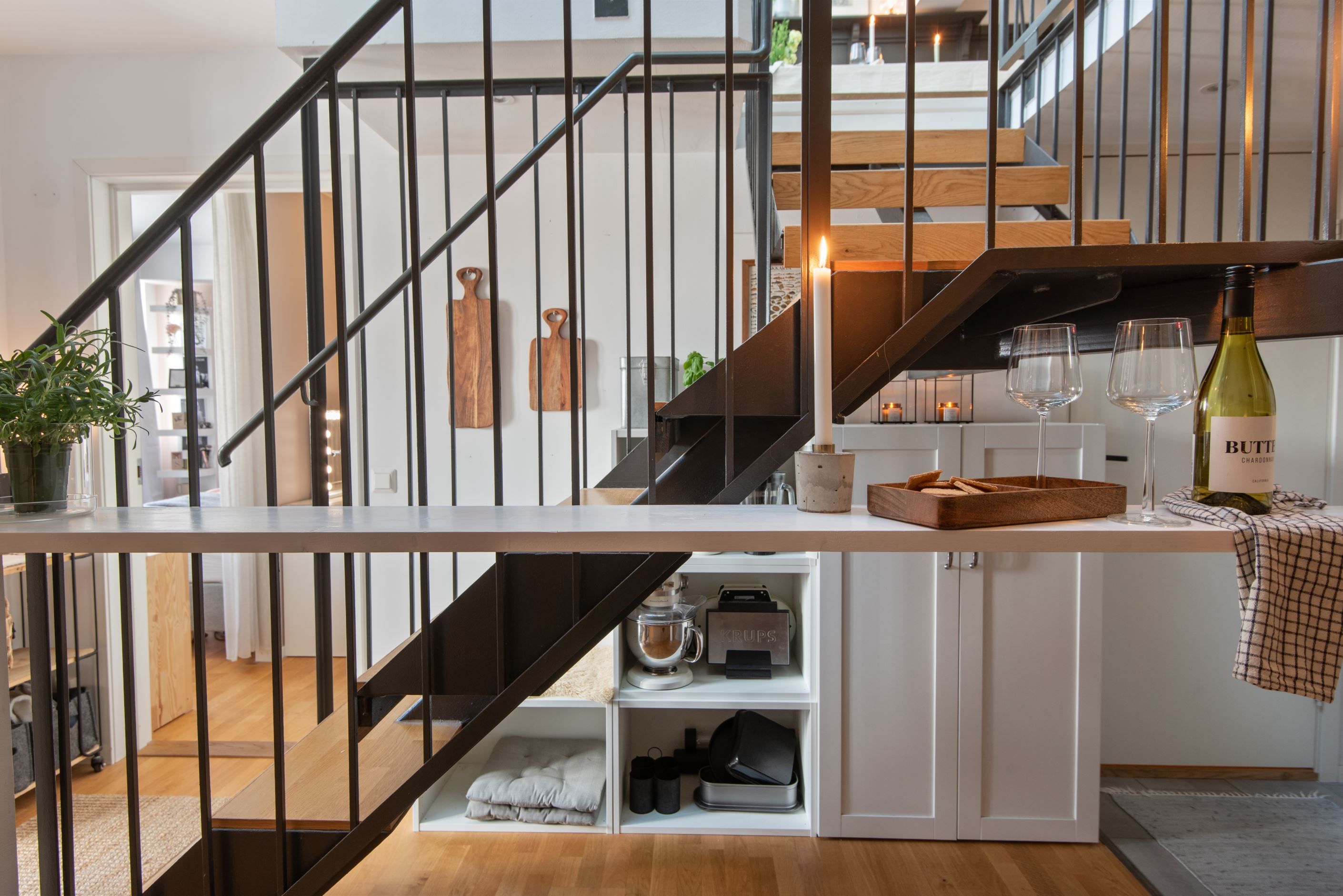 En våning upp väntar en fantastisk rymd med imponerande takhöjd på över fem meter och synliga takbjälkar som ger bostaden en unik karaktär. Här finns gott om plats för ett stort middagsbord samt sociala ytor för umgänge och även hemma kontors möjlighet. På övervåningen finns även en del som har fungerat som en sovalkov, med plats för en dubbelsäng. Från detta plan når du även den privata takterrassen – en perfekt plats för soliga dagar, middagar utomhus och lugna kvällar.