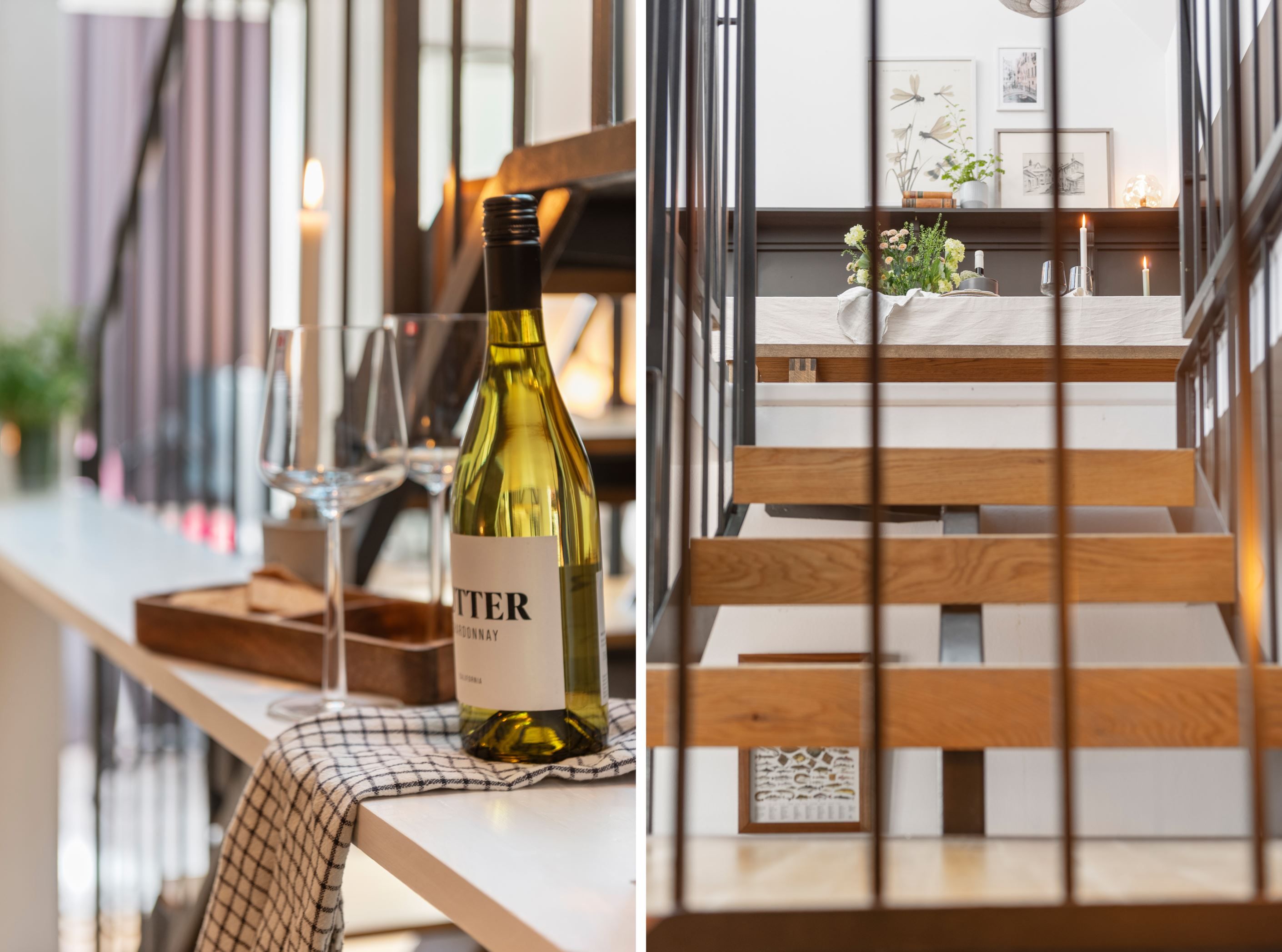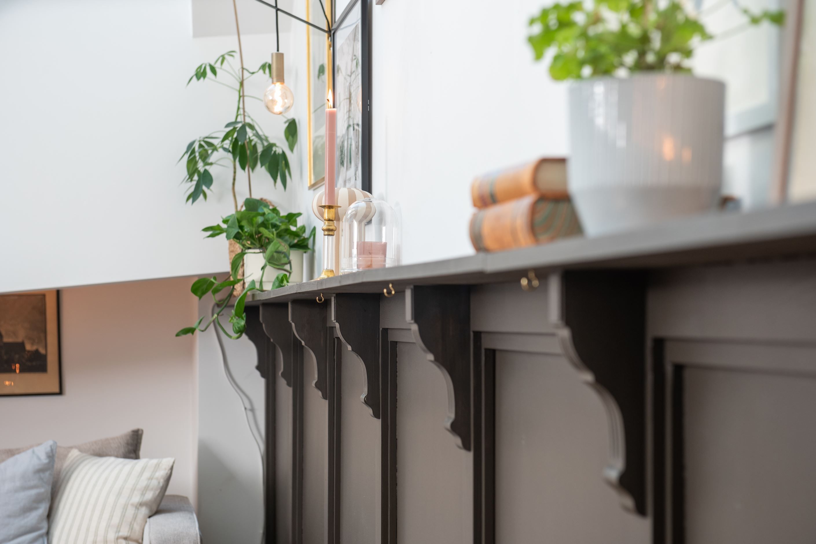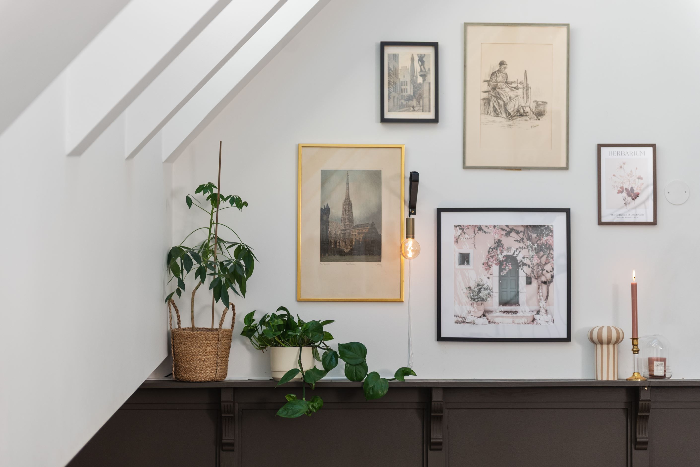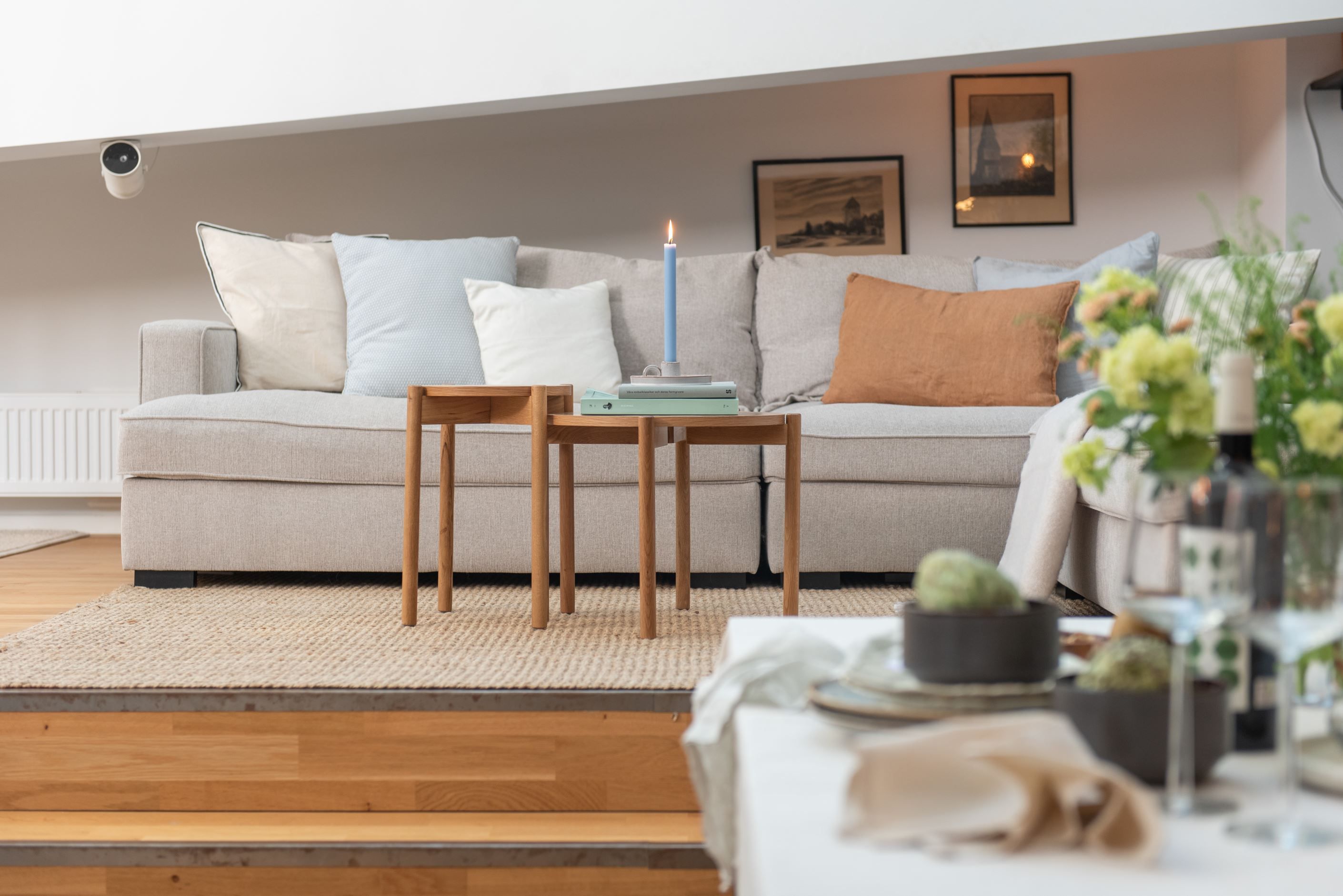 En våning upp väntar en fantastisk rymd med imponerande takhöjd på över fem meter och synliga takbjälkar som ger bostaden en unik karaktär. Här finns gott om plats för ett stort middagsbord samt sociala ytor för umgänge och även hemma kontors möjlighet. På övervåningen finns även en del som har fungerat som en sovalkov, med plats för en dubbelsäng. Från detta plan når du även den privata takterrassen – en perfekt plats för soliga dagar, middagar utomhus och lugna kvällar.