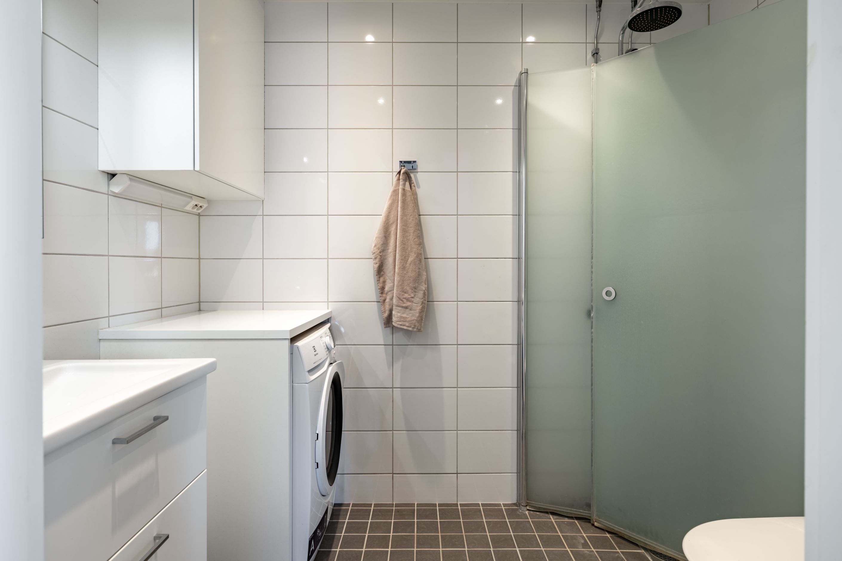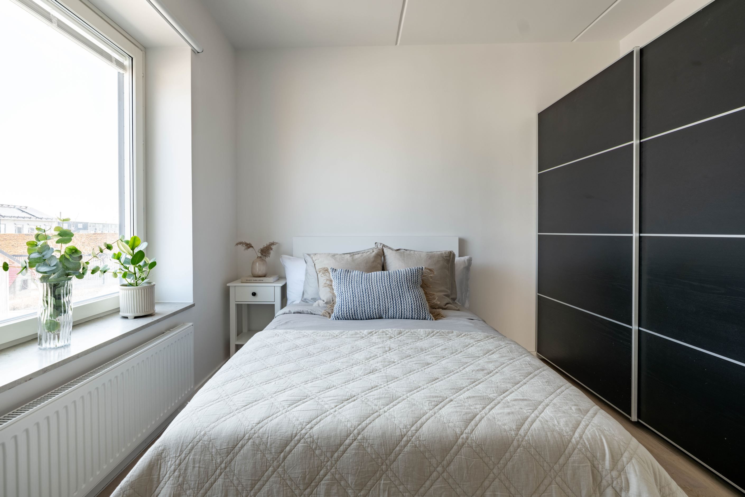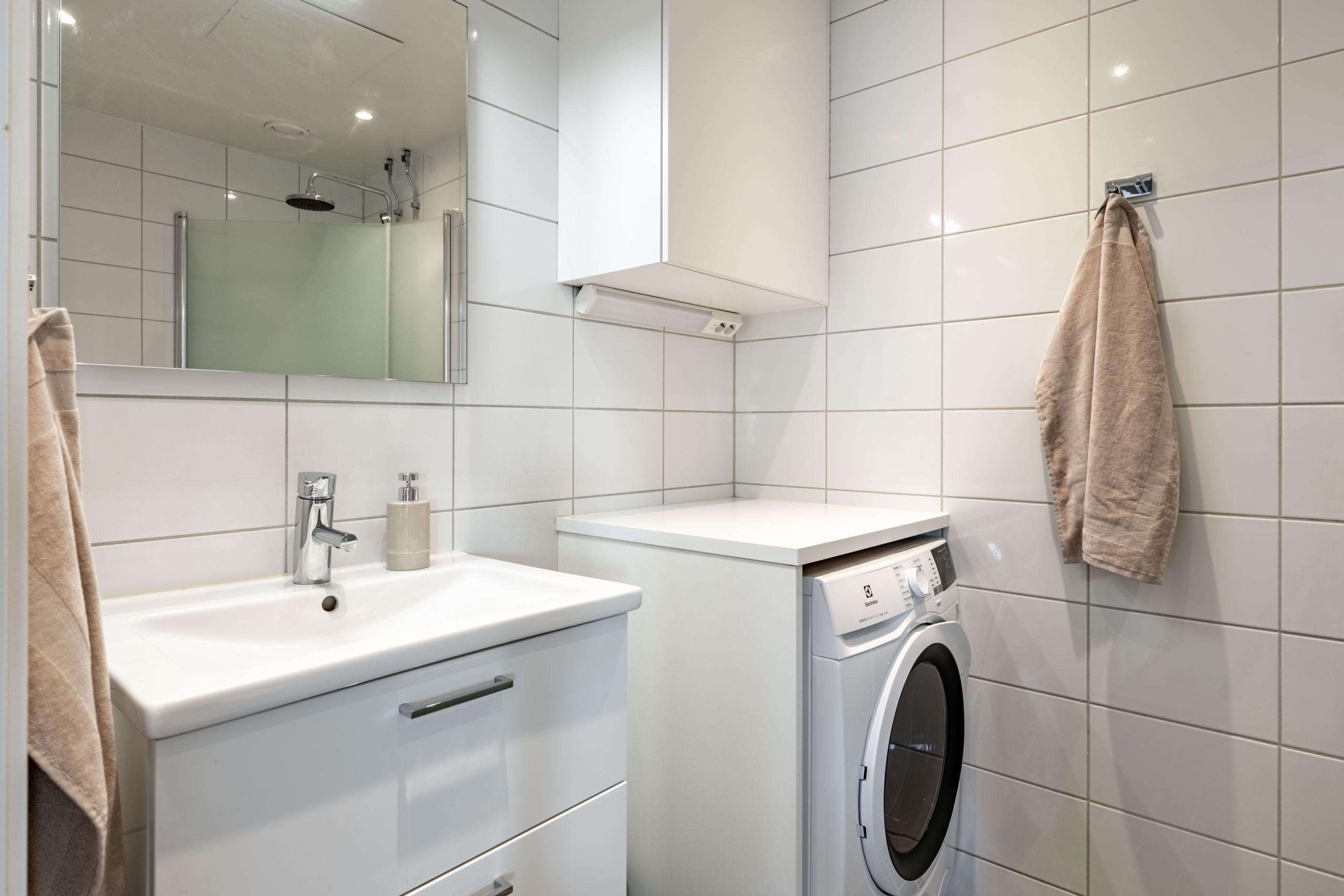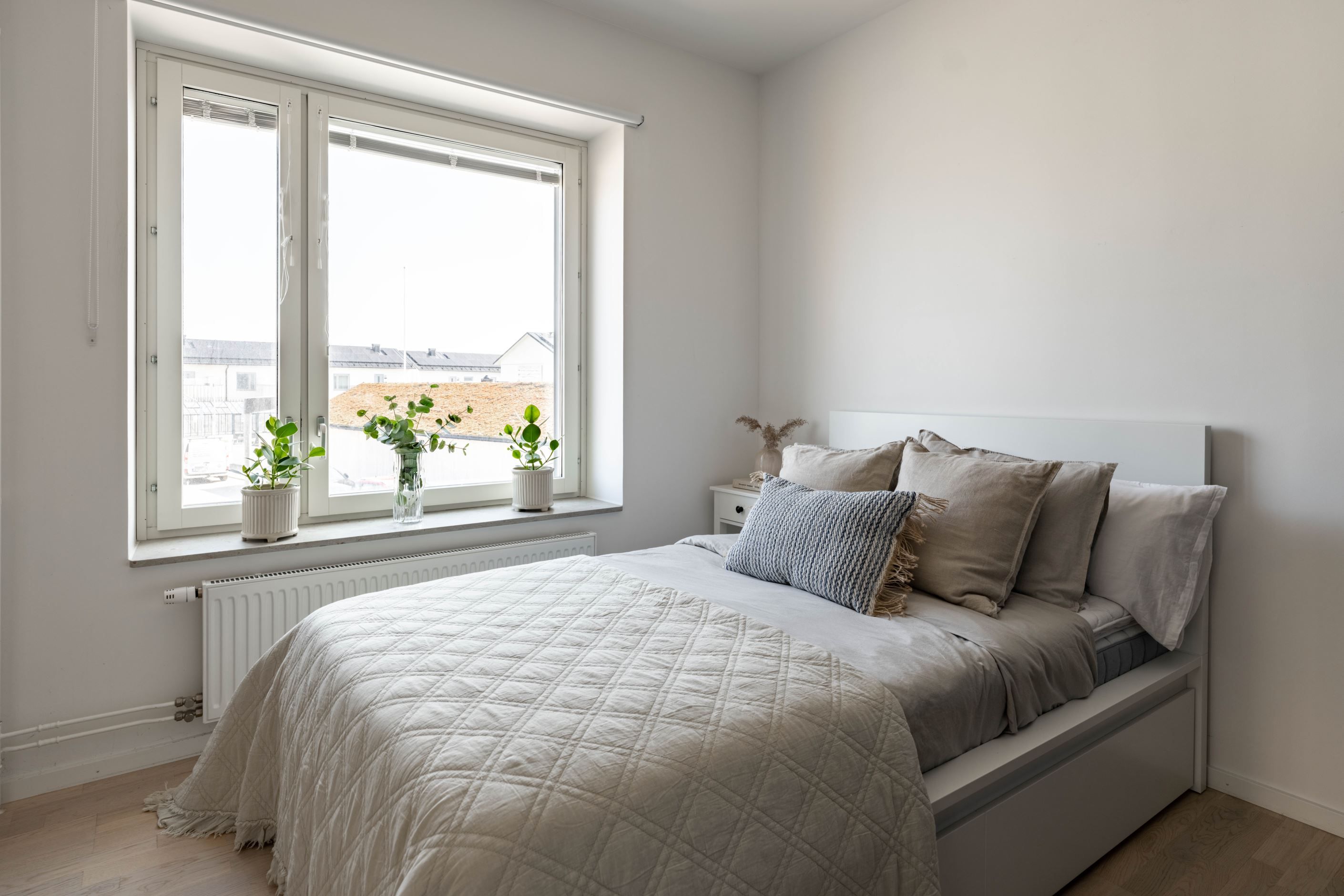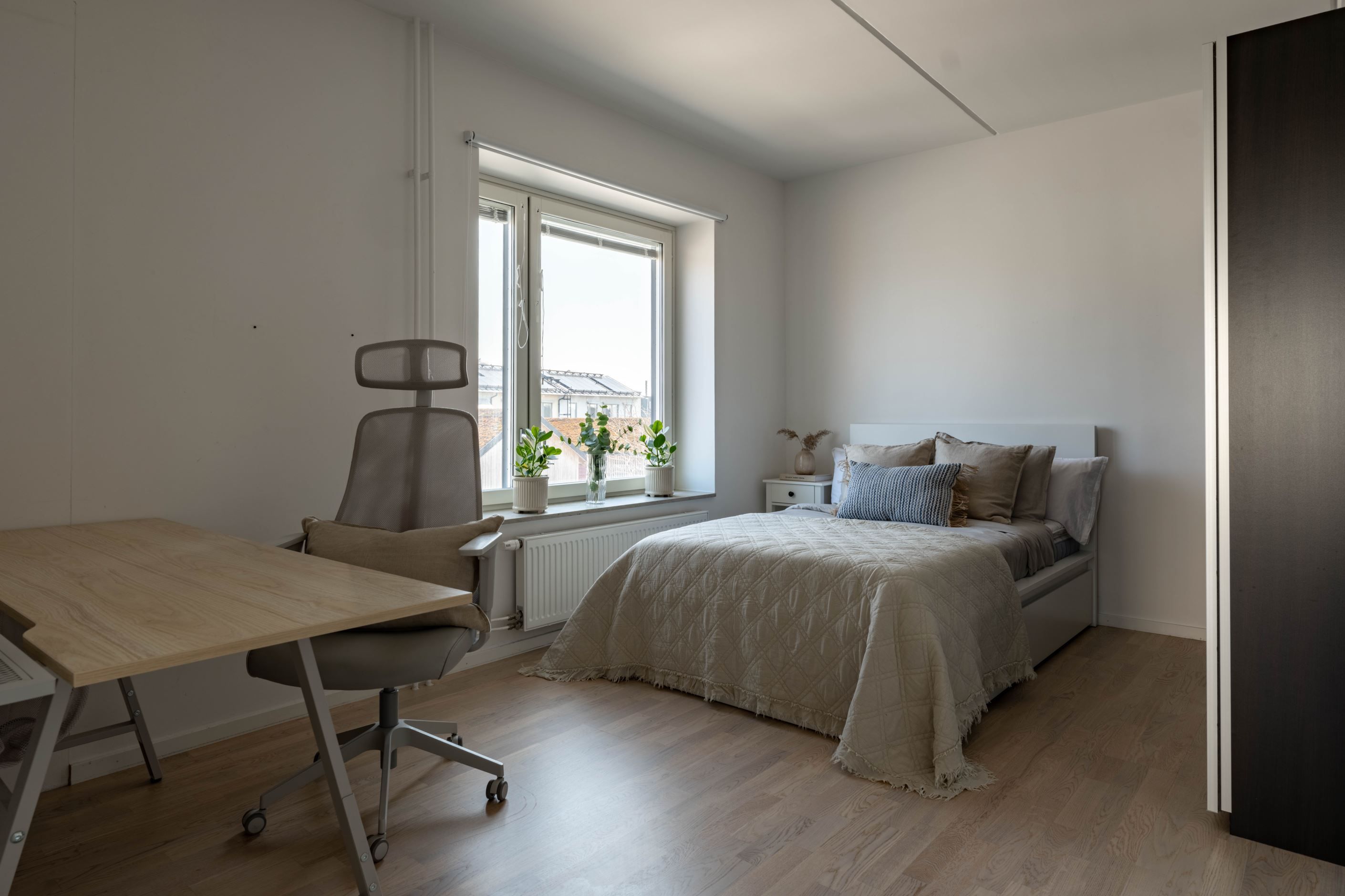 Det stora sovrummet ligger lugnt och avskilt, med bra förvaring som håller vardagen i schack. Badrummet är helkaklat och utrustat med egen tvättmaskin och torktumlare – en sådan där detalj som snabbt går från lyx till självklarhet. Köket är inte bara stilrent utan också genomtänkt, med gott om förvaring och arbetsyta.