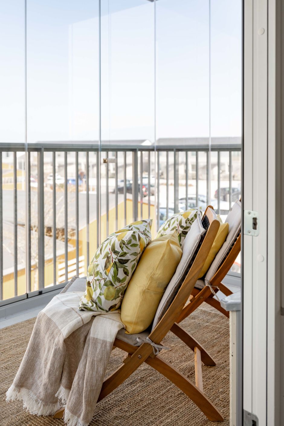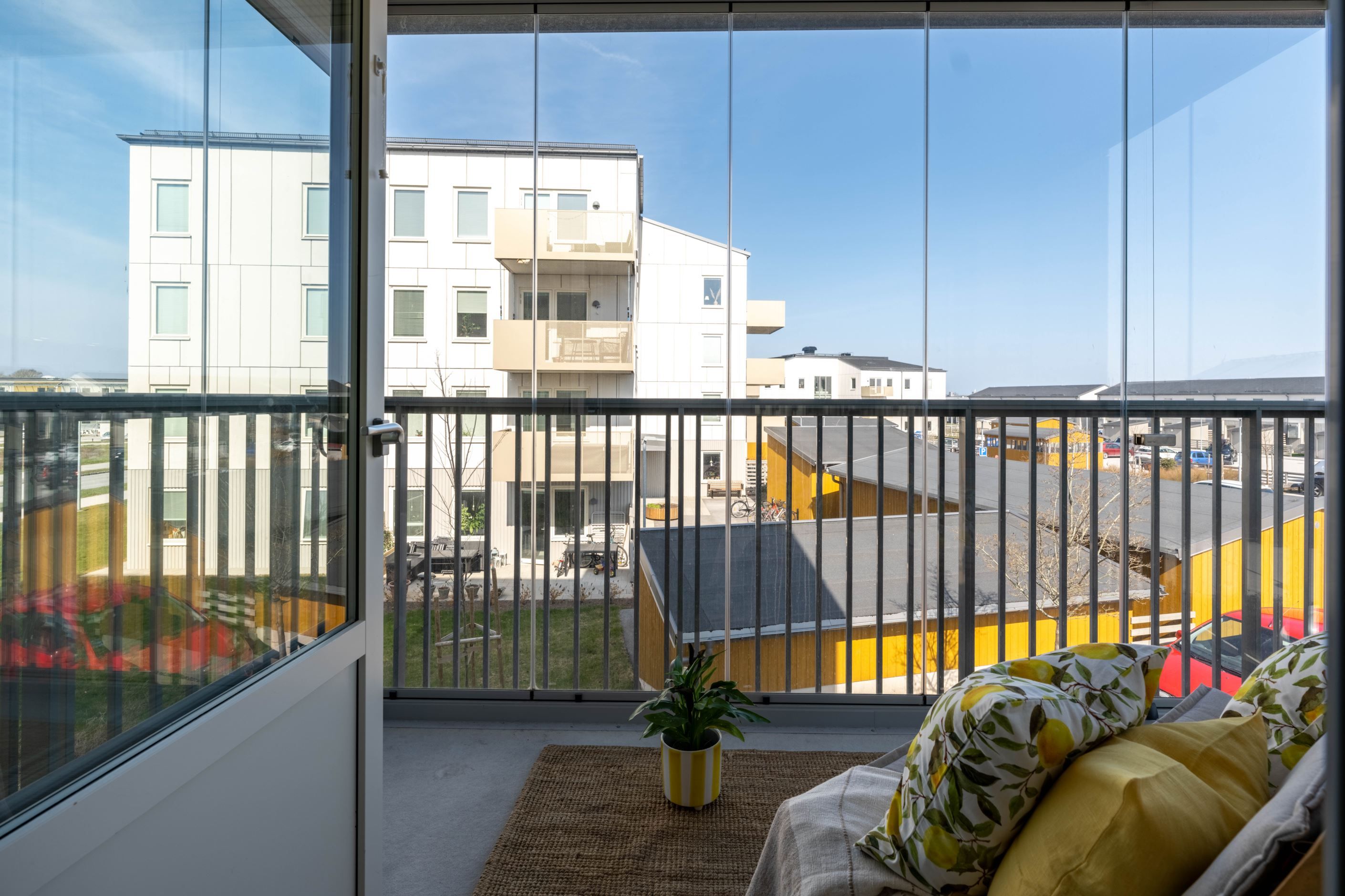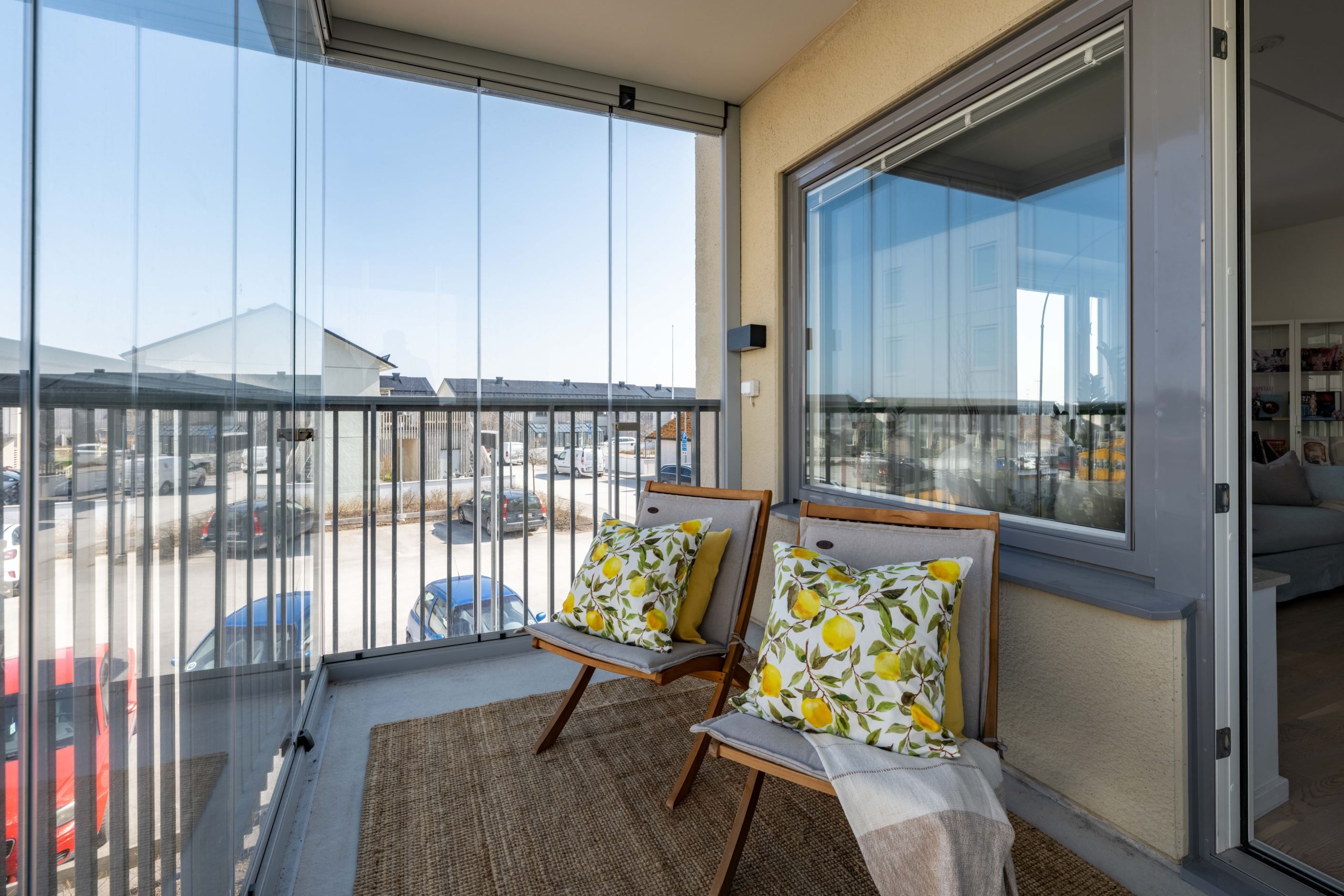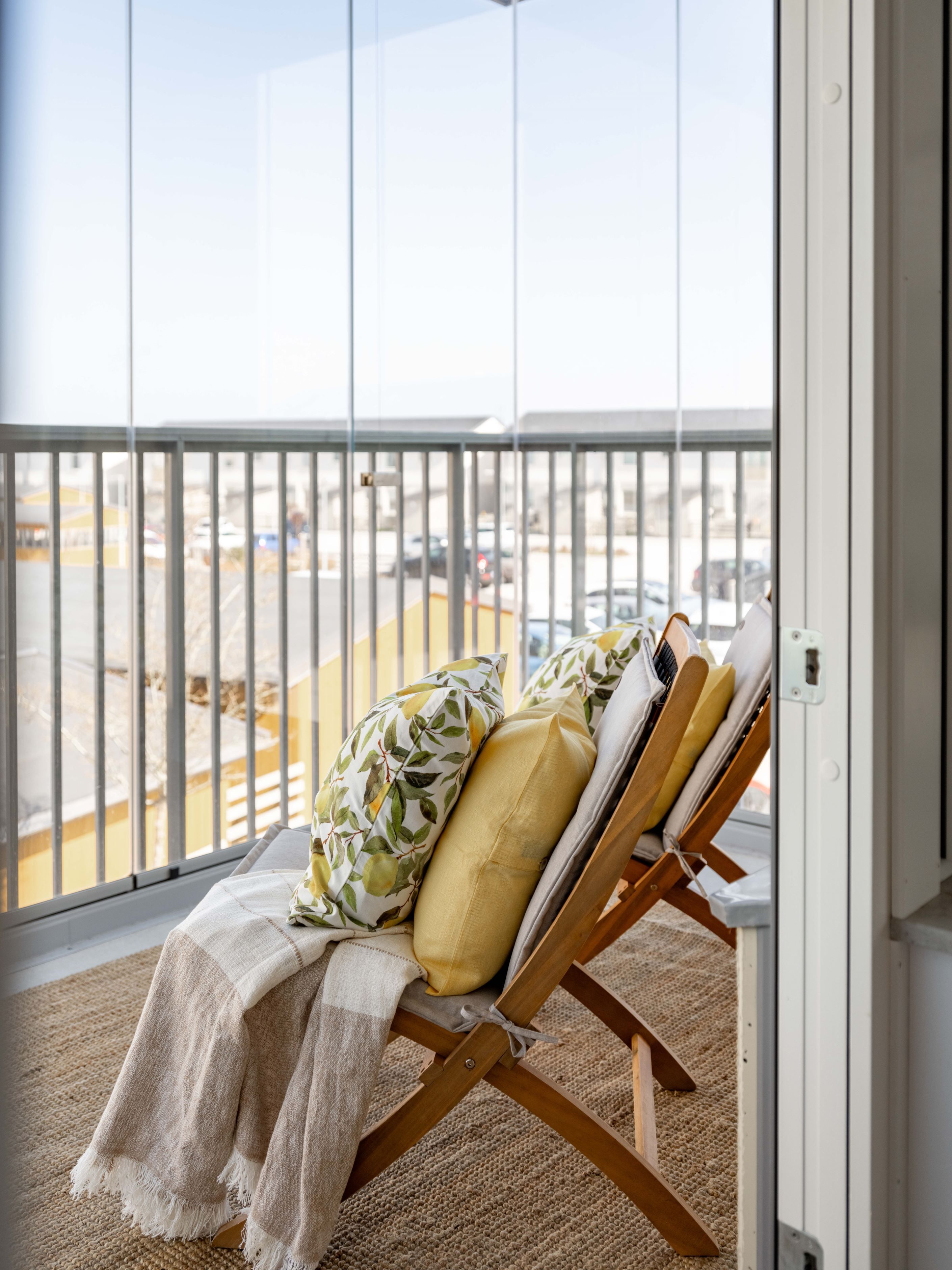 Den inglasade balkongen blir snabbt en favorit – ett extra rum där morgonkaffet får ta sin tid och där kvällsljuset dröjer sig kvar långt efter att dagen egentligen borde vara slut.