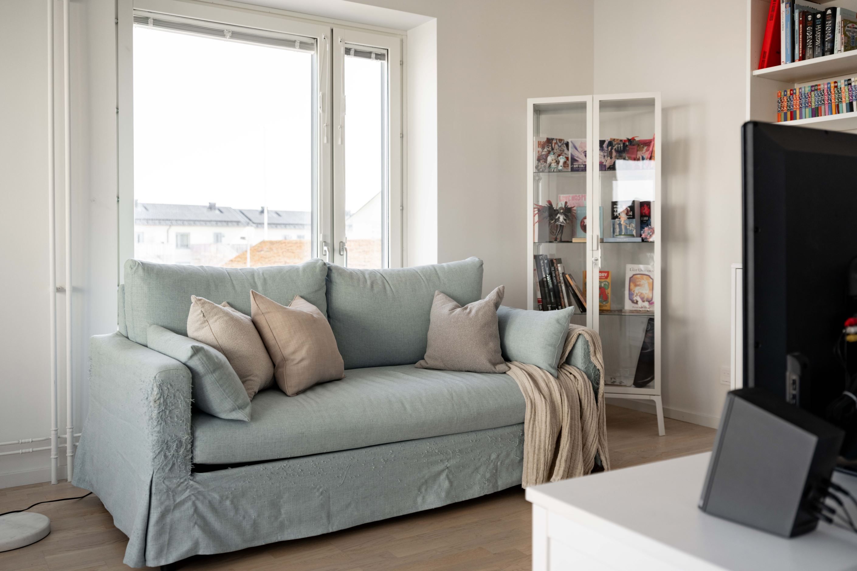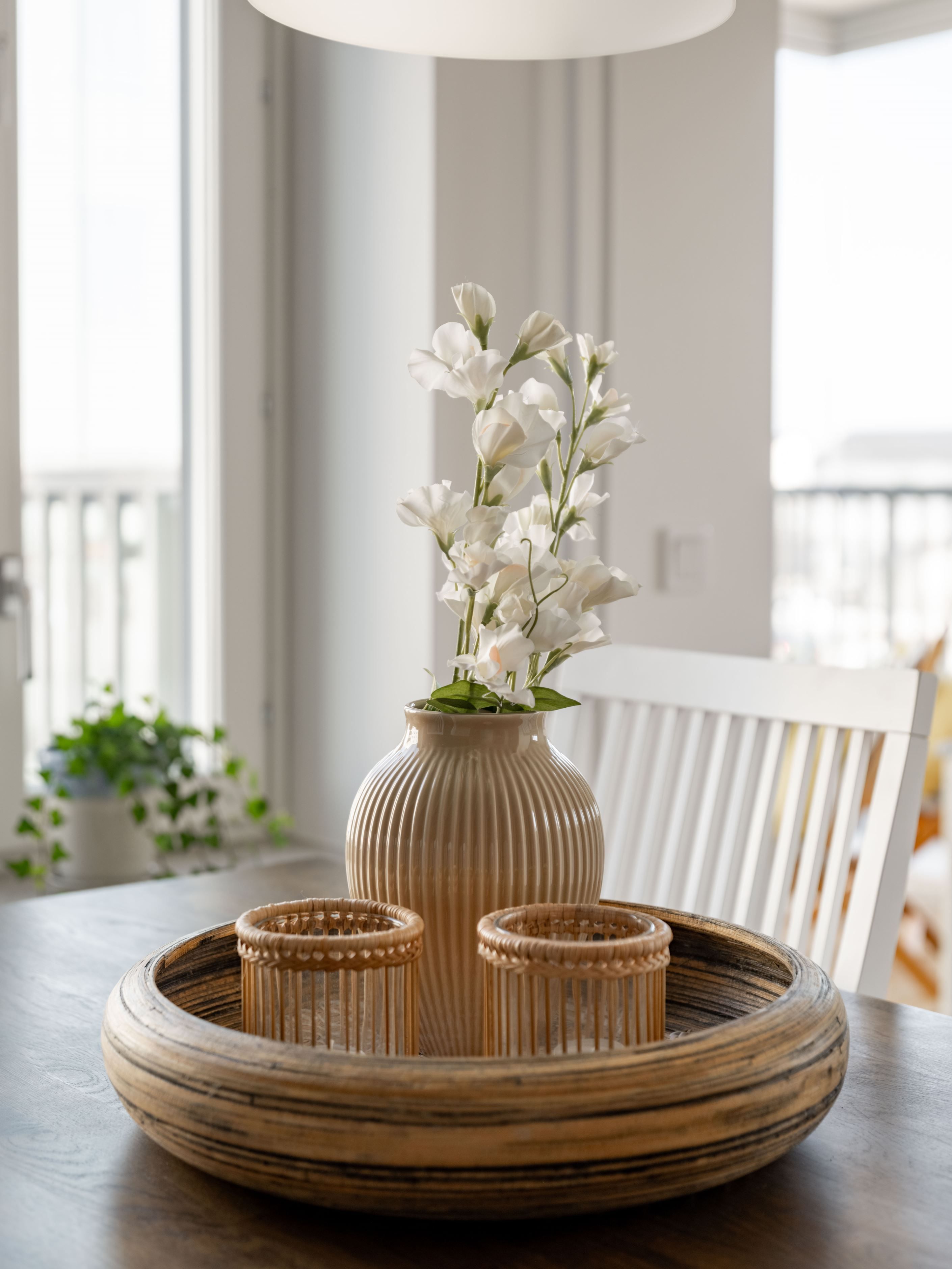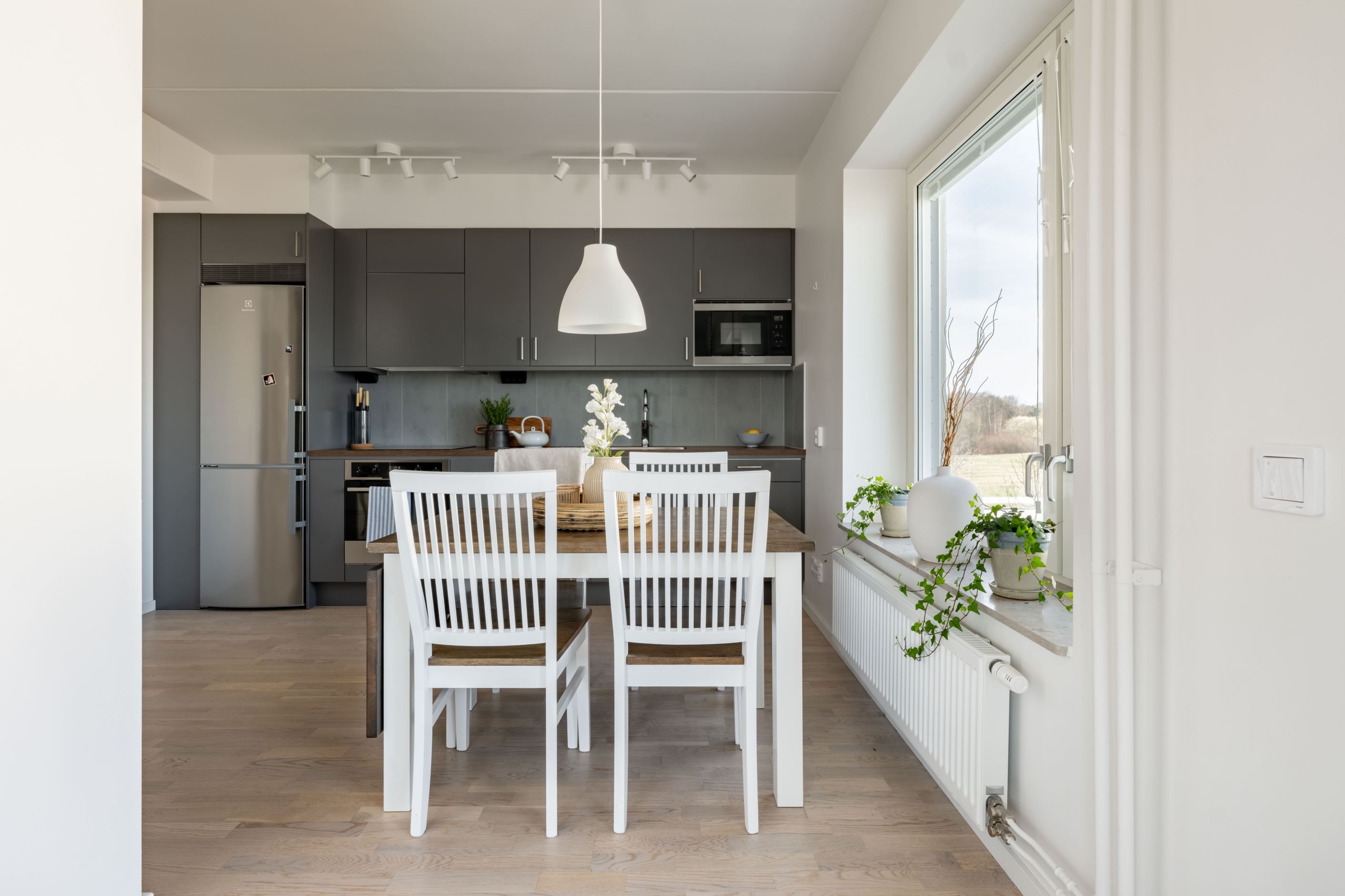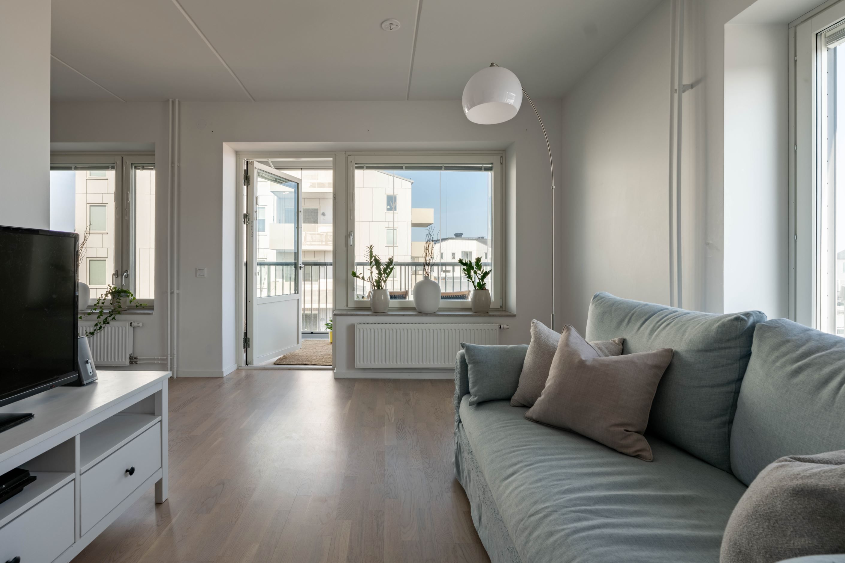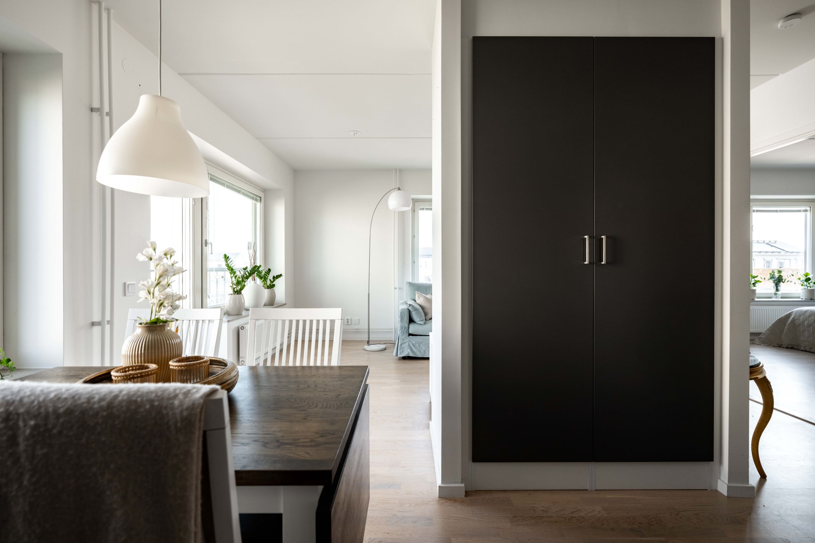Den inglasade balkongen blir snabbt en favorit – ett extra rum där morgonkaffet får ta sin tid och där kvällsljuset dröjer sig kvar långt efter att dagen egentligen borde vara slut.