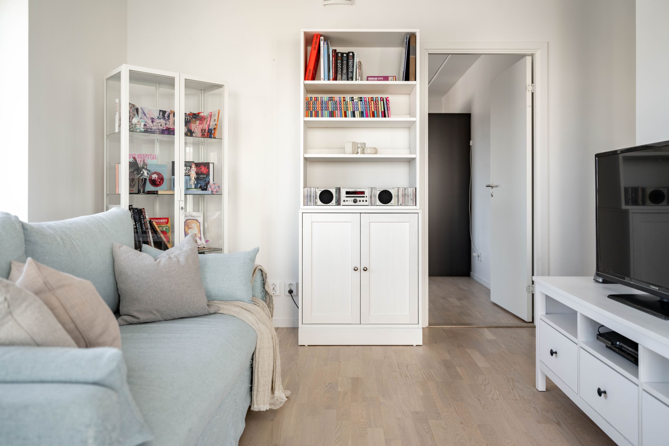En trappa upp i Visby Ängar väntar ett hem från 2019 som fortfarande känns nytt, ljust och självklart på något sätt. Planlösningen är öppen och inbjudande, där kök och vardagsrum möts i en yta som fungerar lika fint för stilla vardagskvällar som för middagar som blir kvar lite längre än planerat.