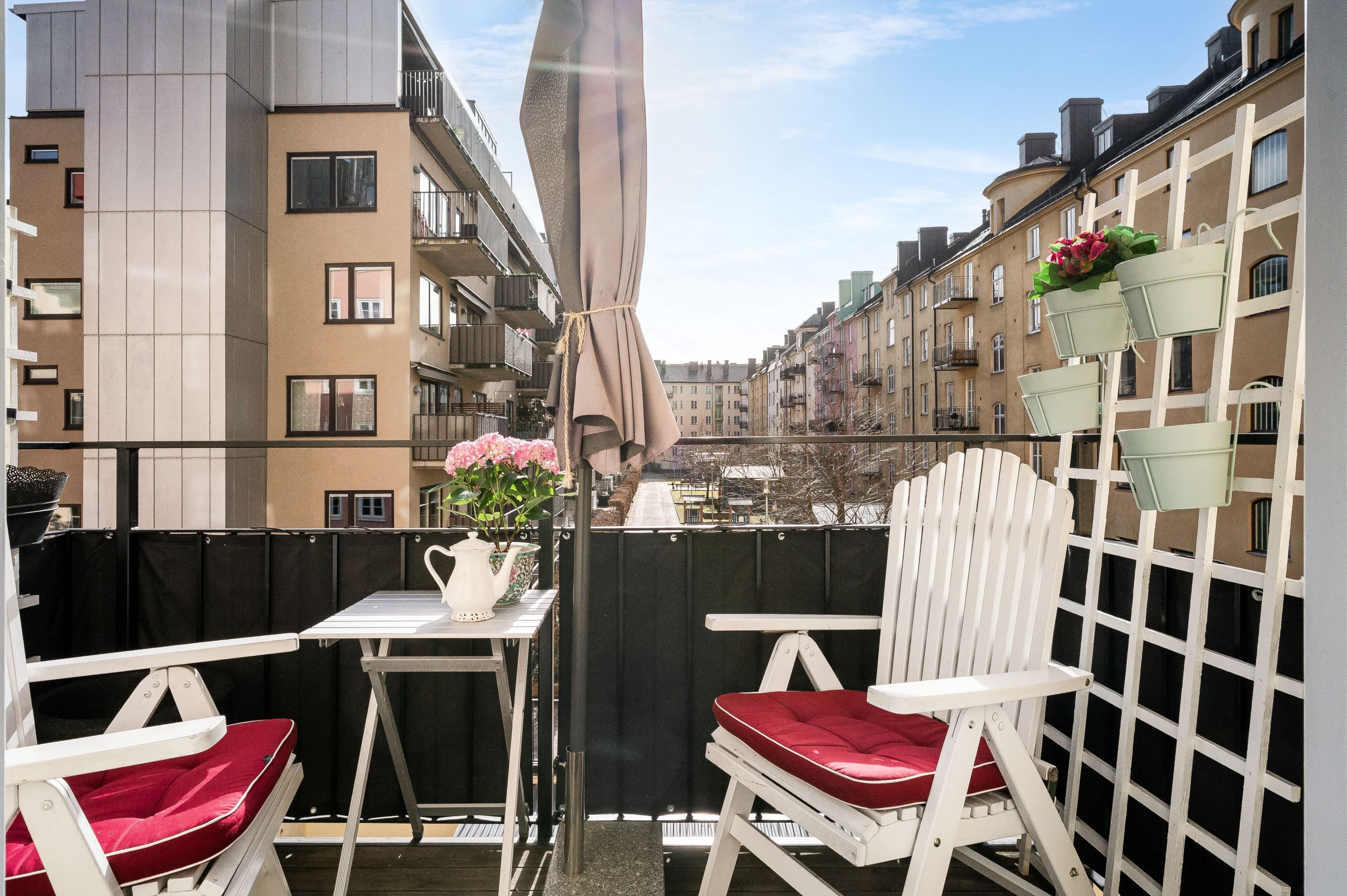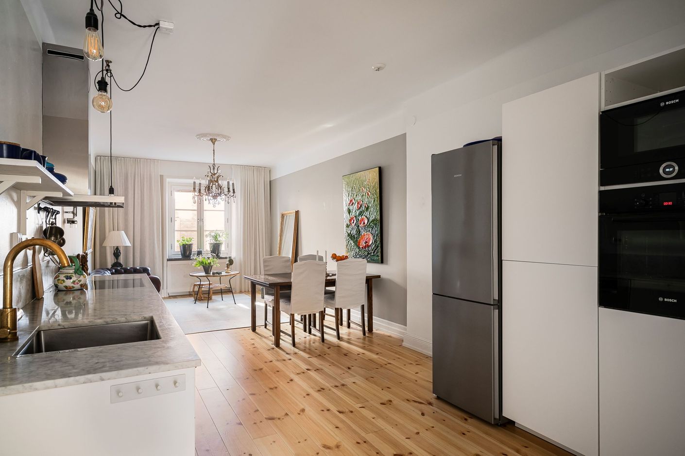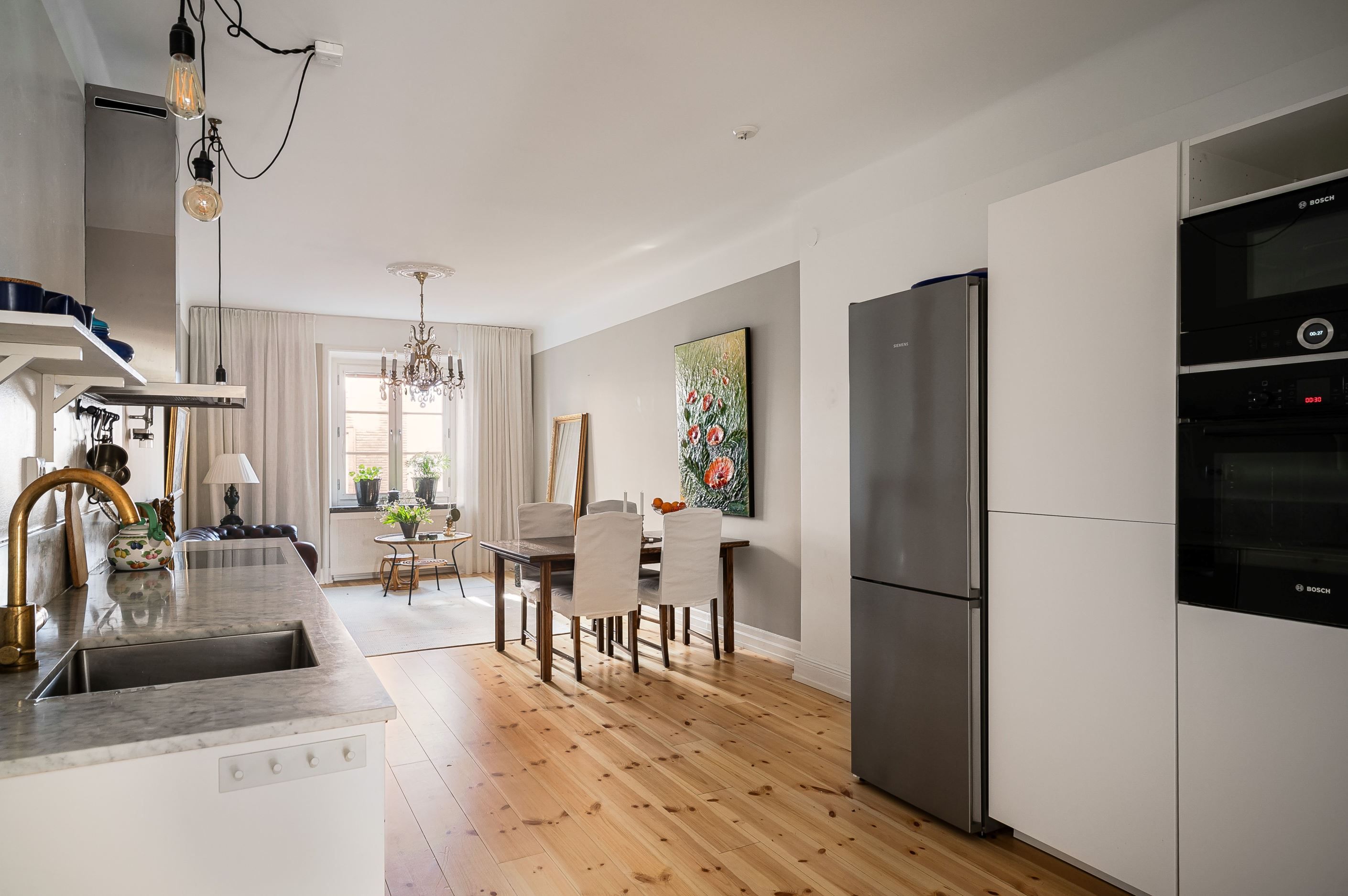 Lägenheten är belägen två trappor upp och har en härlig solig balkong som skapar en perfekt plats för avkoppling under stora delar av dagen. Här möts du av en social och öppen planlösning mellan kök och vardagsrum som ger en luftig och modern känsla, perfekt för både vardagsliv och umgänge.