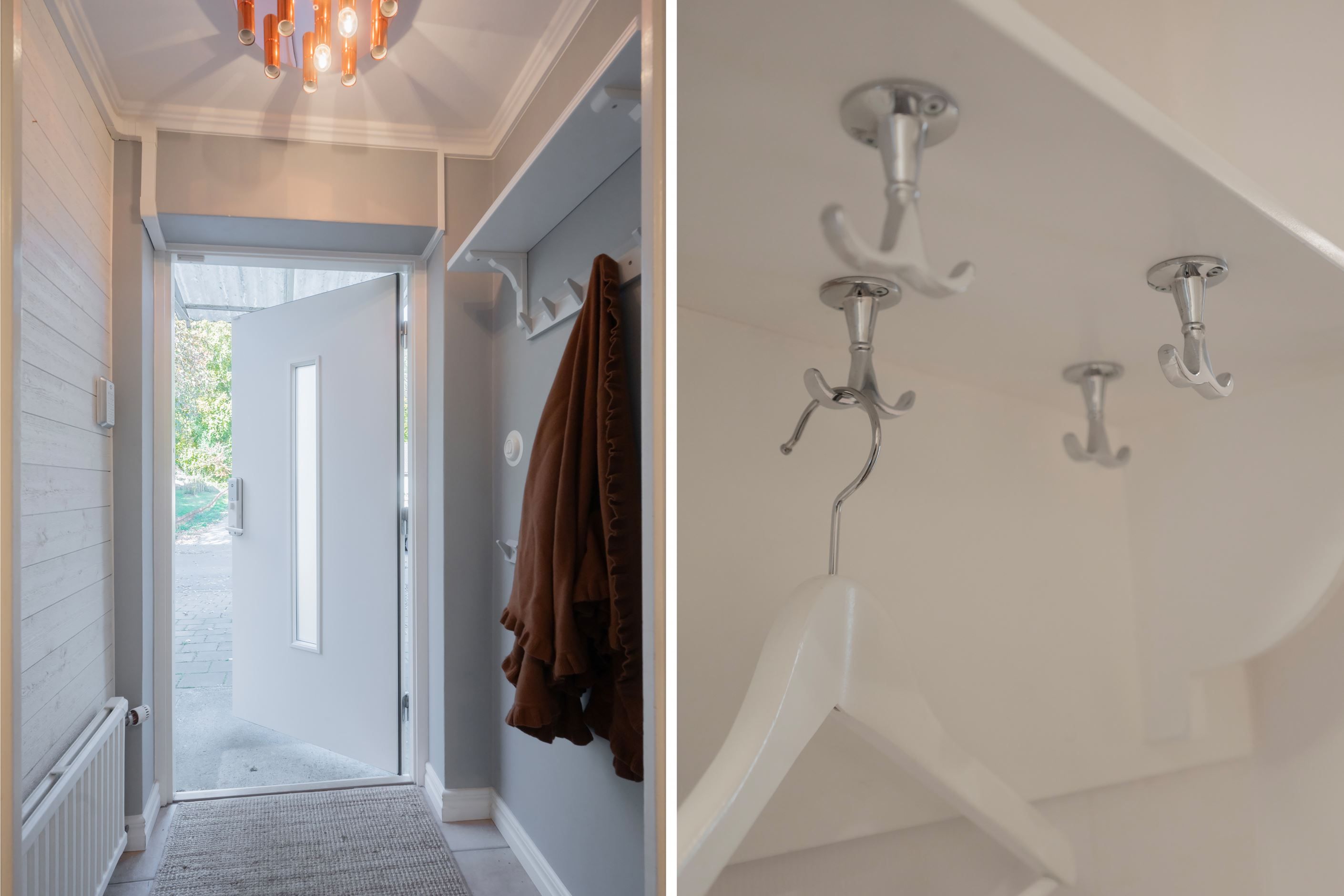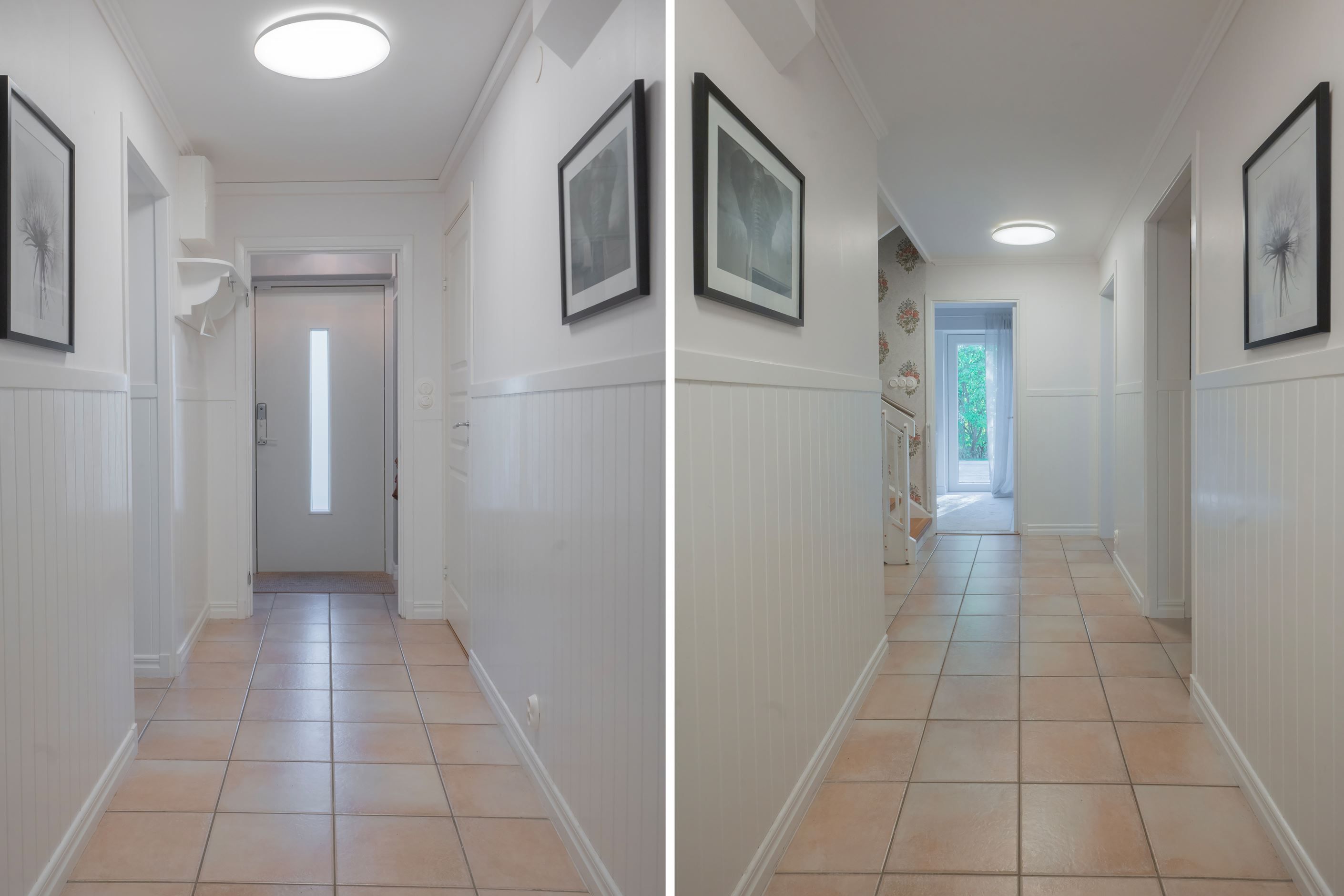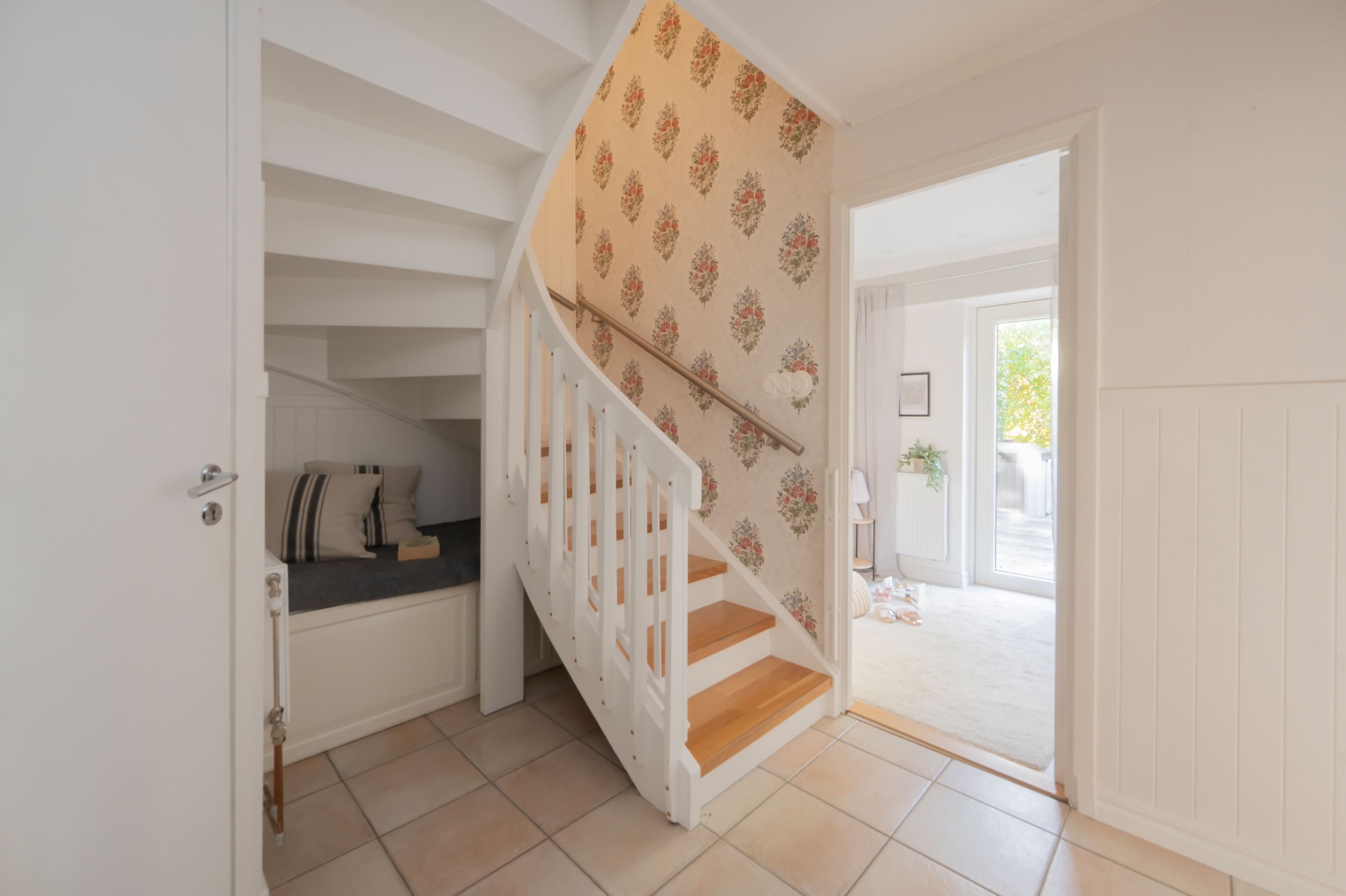 Du välkomnas av en rymlig och möblerbar hall med klinkergolv och behaglig golvvärme. Under trappan finns en mysig hörna – perfekt som läshörna eller barnens lekhörna. Här finns även ett helkaklat badrum utrustat med dusch, wc, handfat samt tvättmaskin och torktumlare. I anslutning finns ett pannrum med elpanna och ett rymligt förråd – delvis inrett som snickeri för den händige.