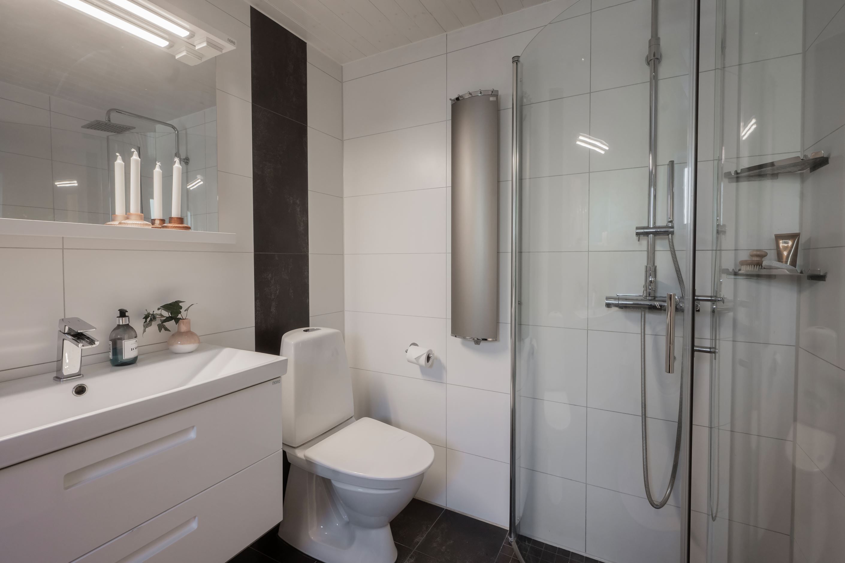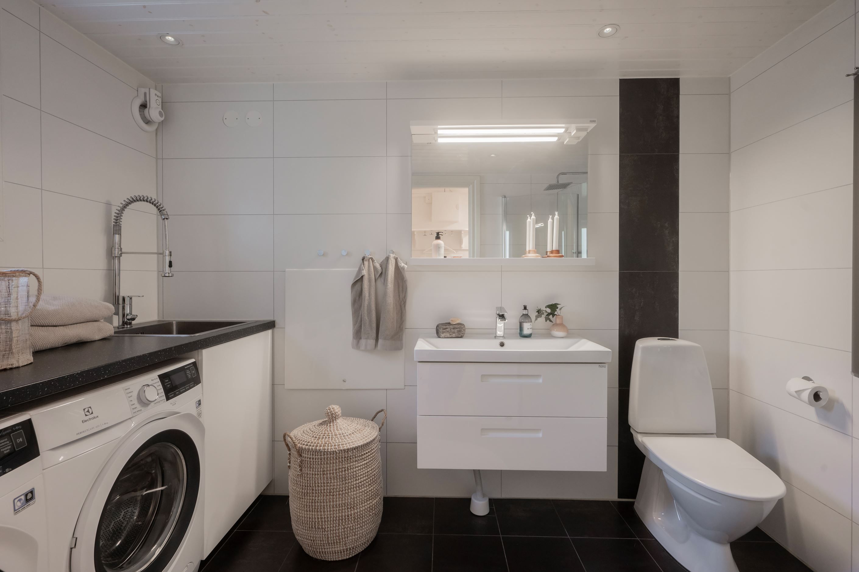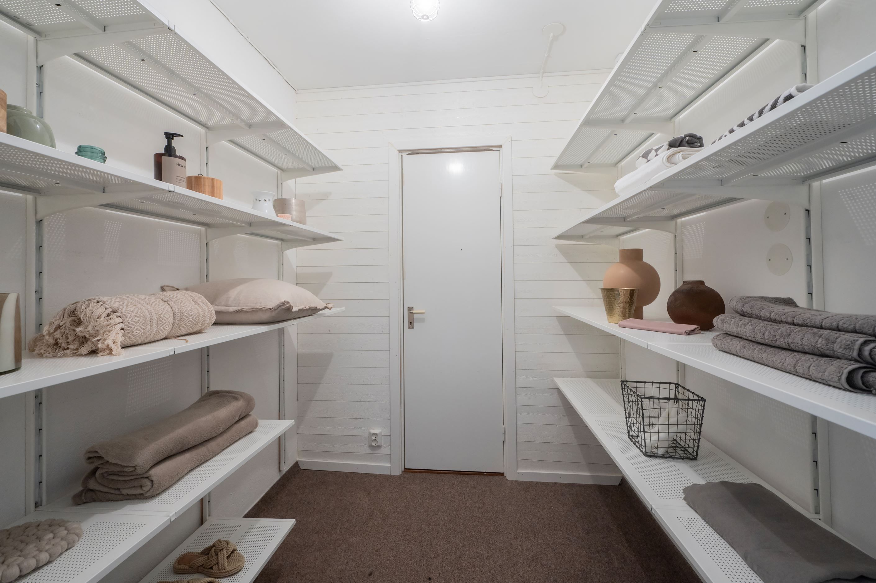 Du välkomnas av en rymlig och möblerbar hall med klinkergolv och behaglig golvvärme. Under trappan finns en mysig hörna – perfekt som läshörna eller barnens lekhörna. Här finns även ett helkaklat badrum utrustat med dusch, wc, handfat samt tvättmaskin och torktumlare. I anslutning finns ett pannrum med elpanna och ett rymligt förråd – delvis inrett som snickeri för den händige.
