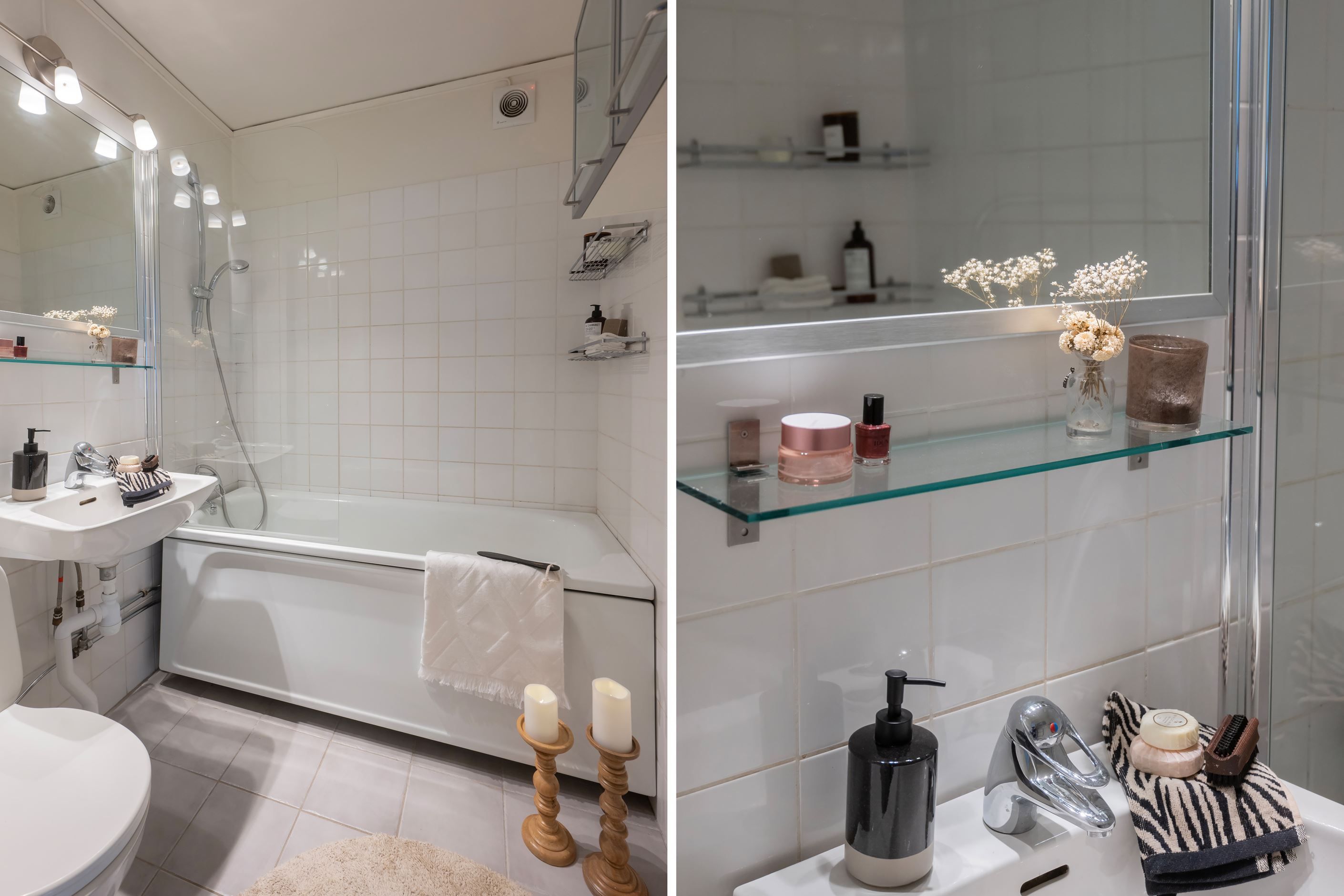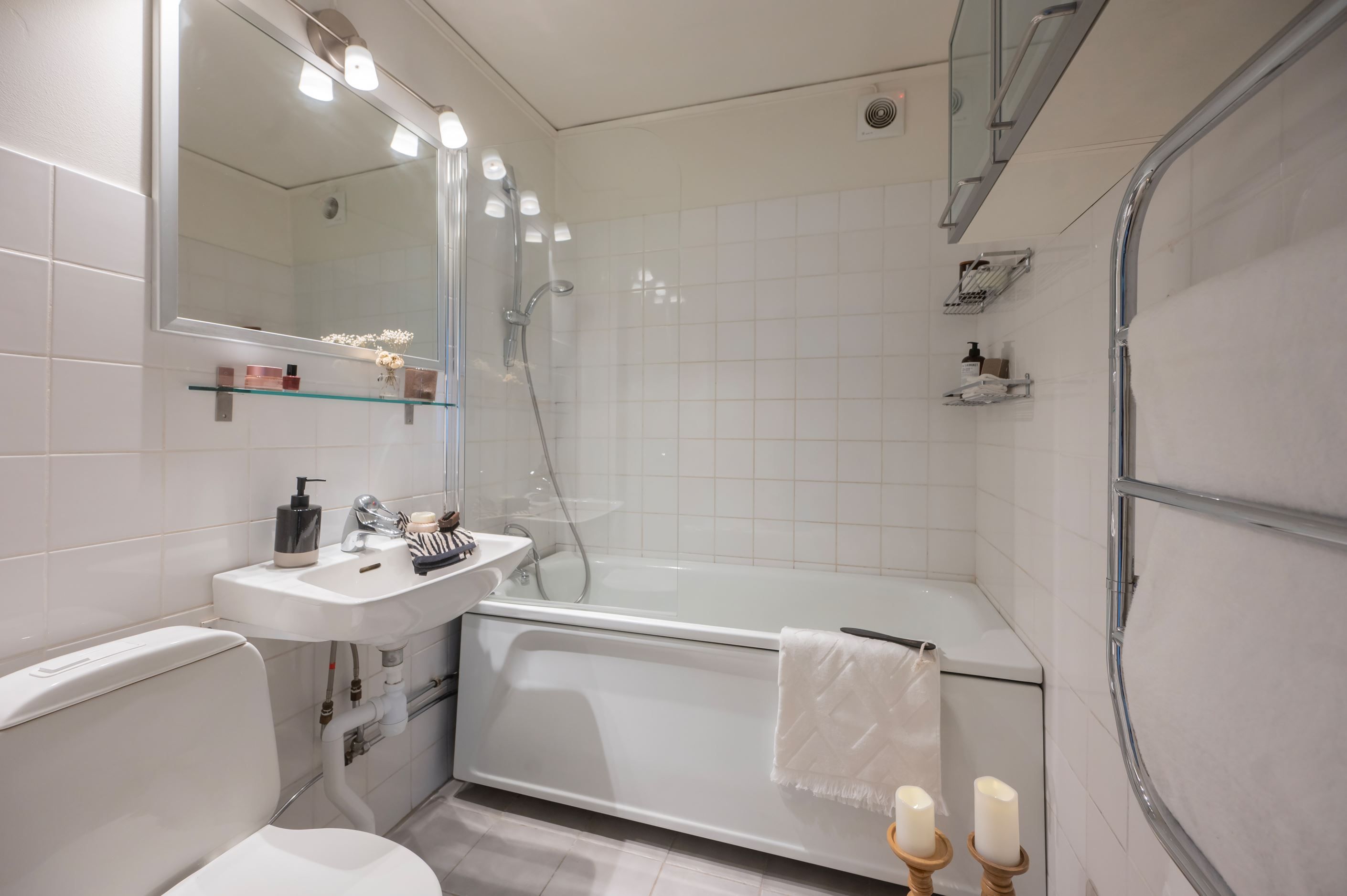På detta plan finns även ett helkaklat badrum med badkar, perfekt för kvällsbad eller barnens lekstunder, samt ett extra sovrum med garderober och laminatgolv.