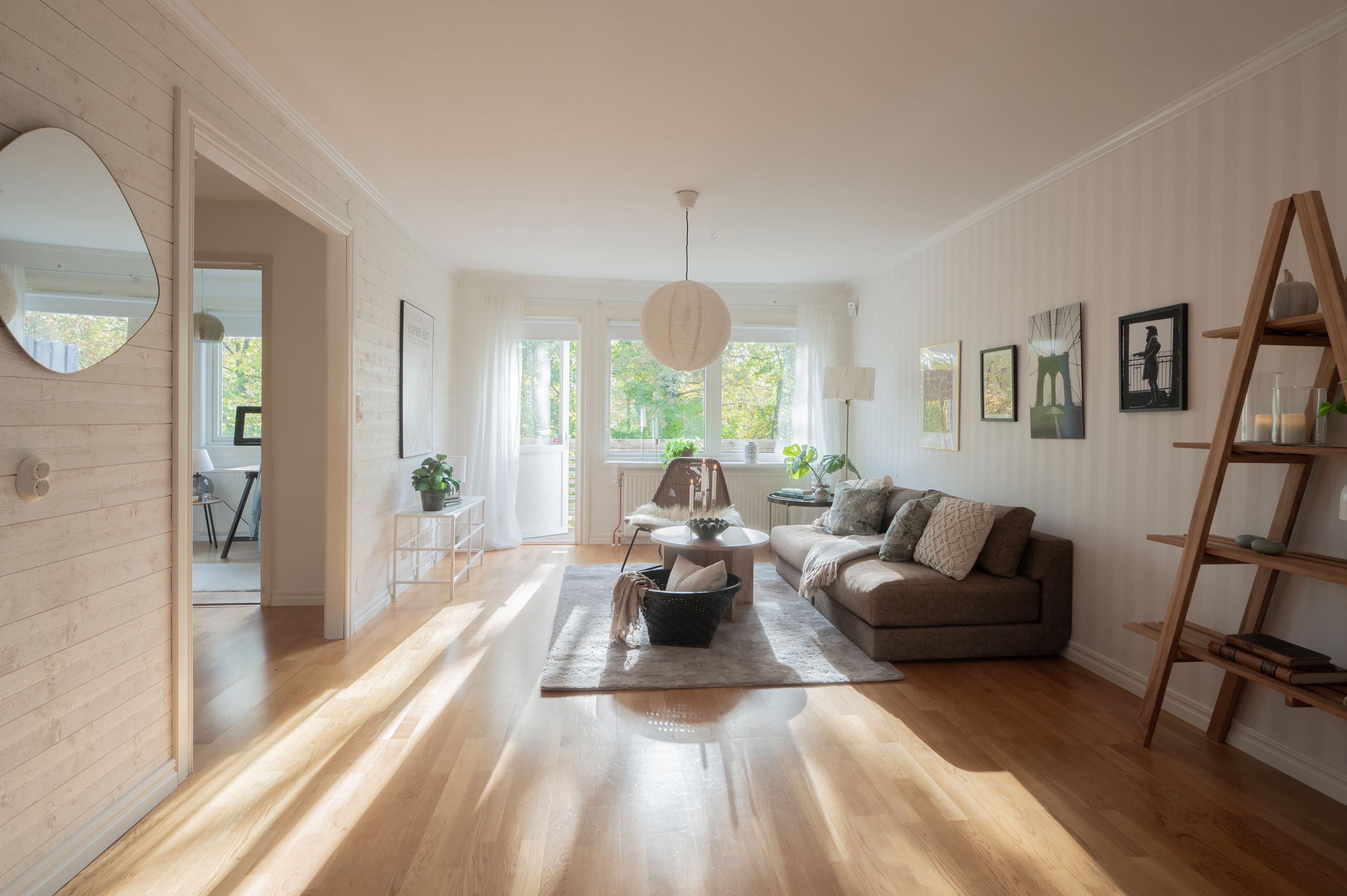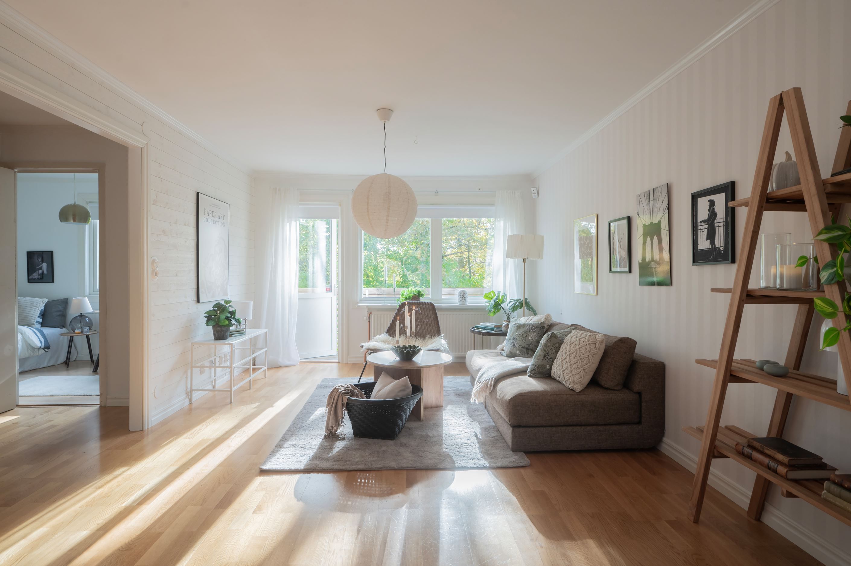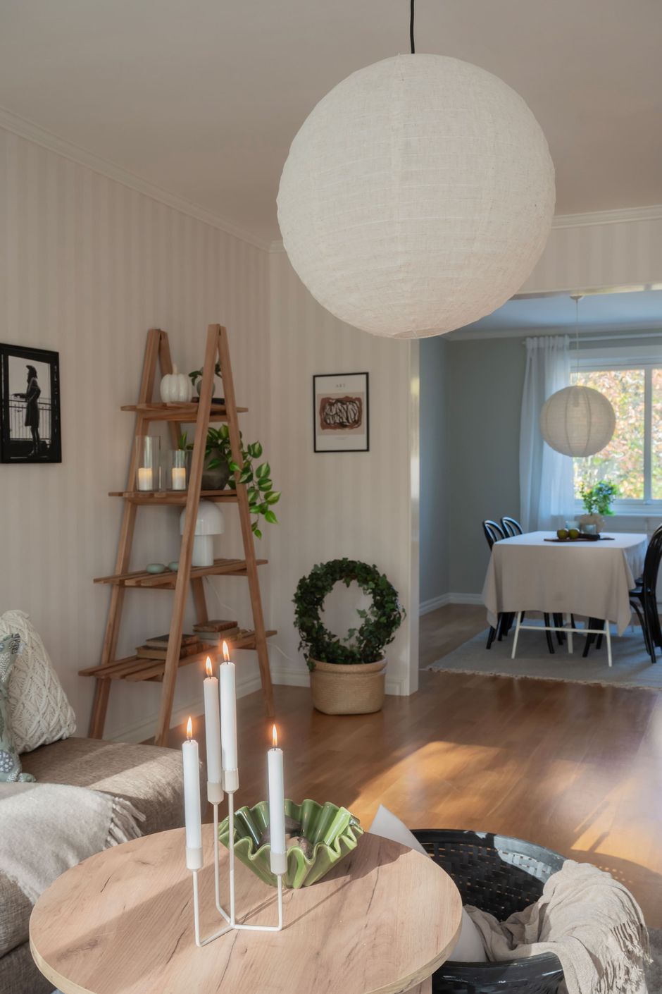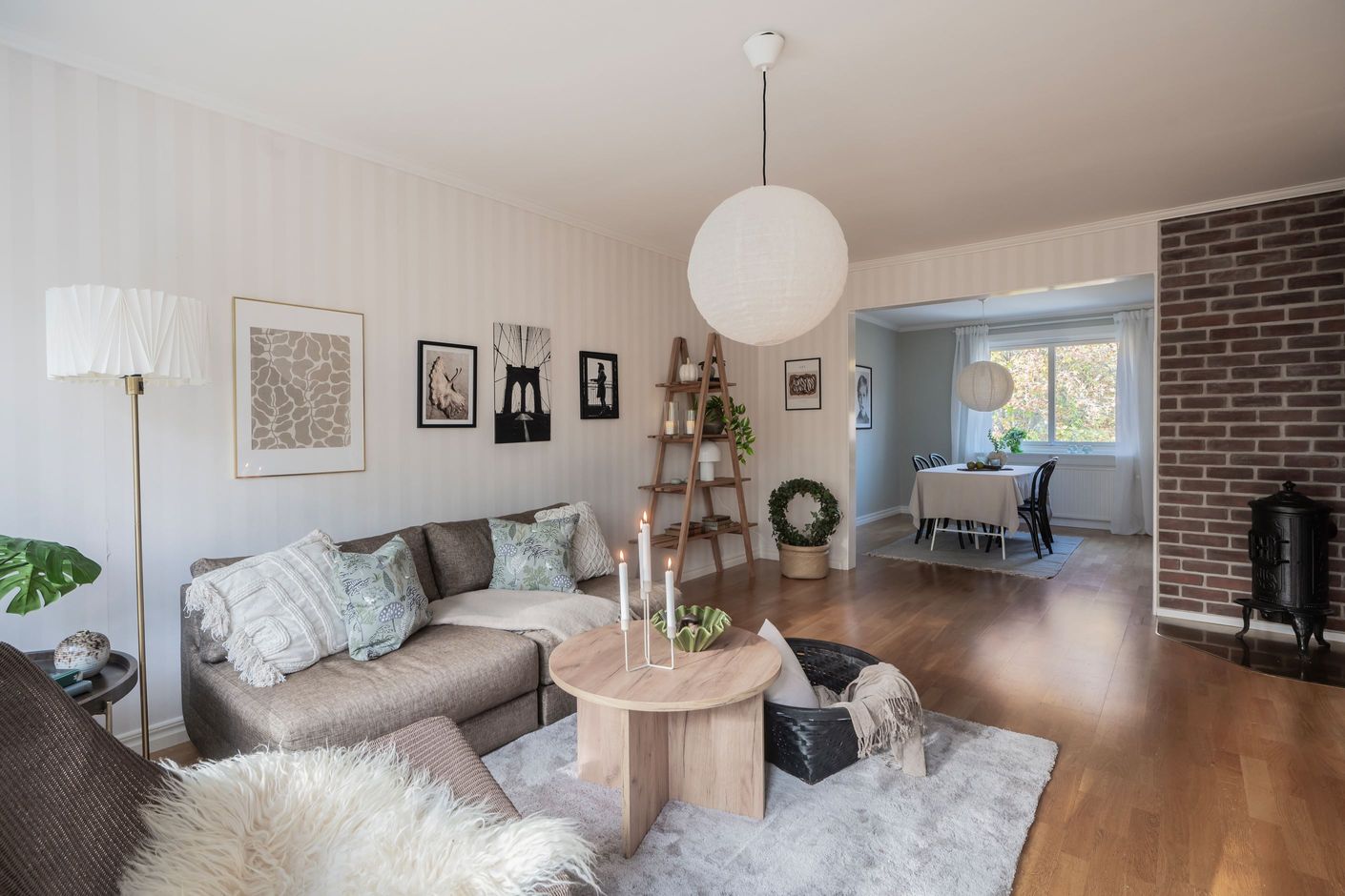 -Ljust vardagsrum i öppen planlösning med matsal