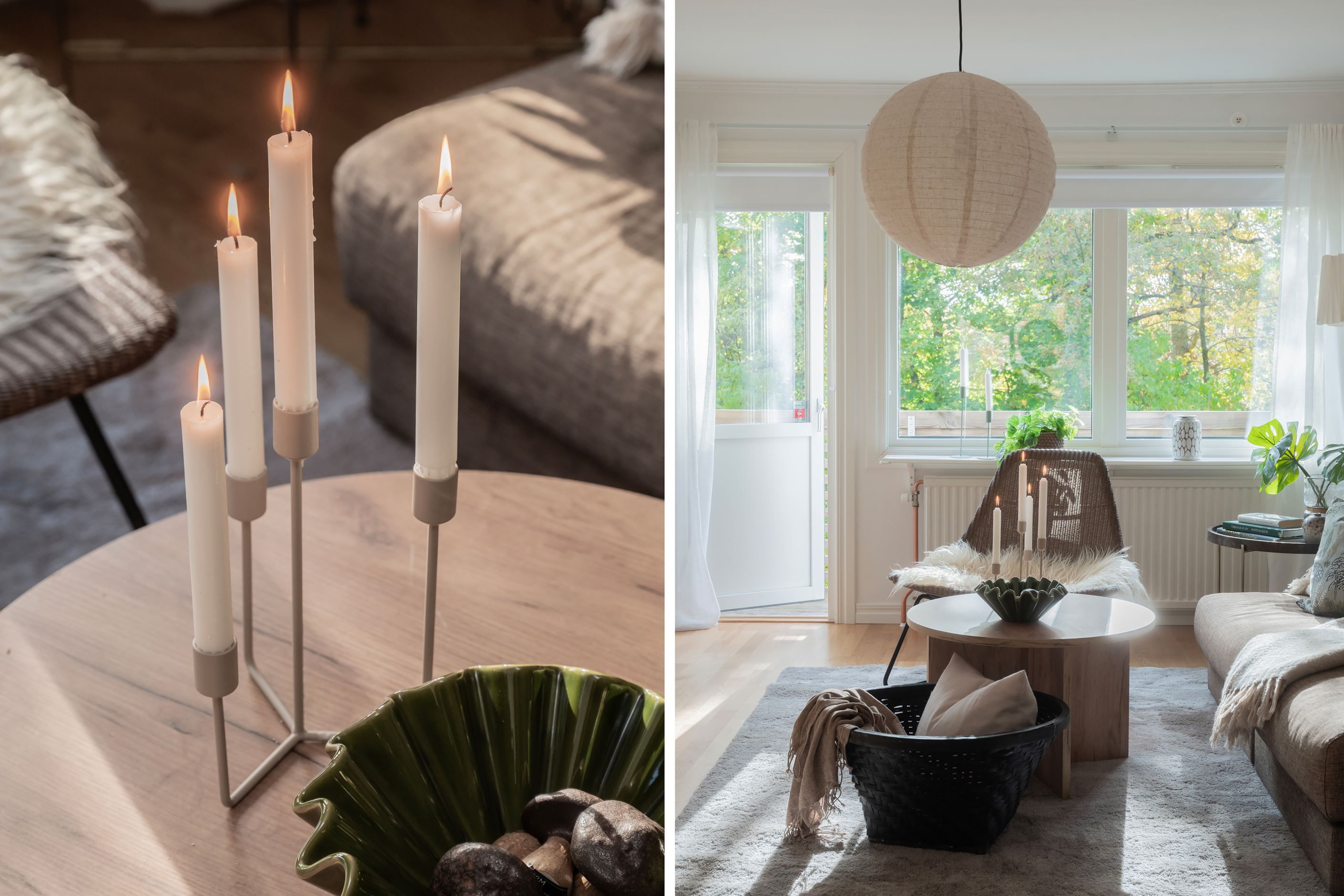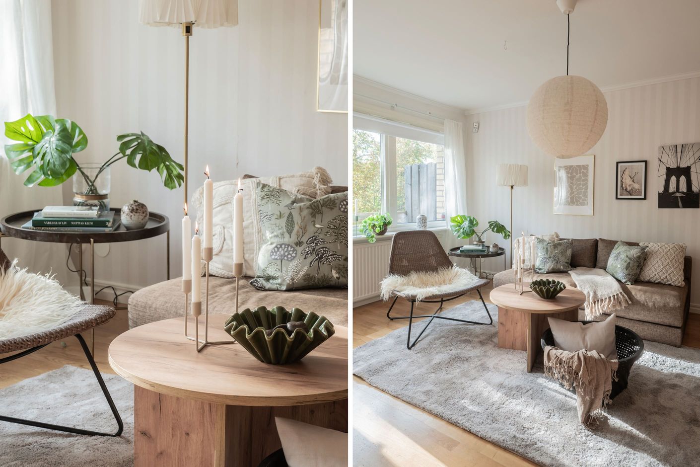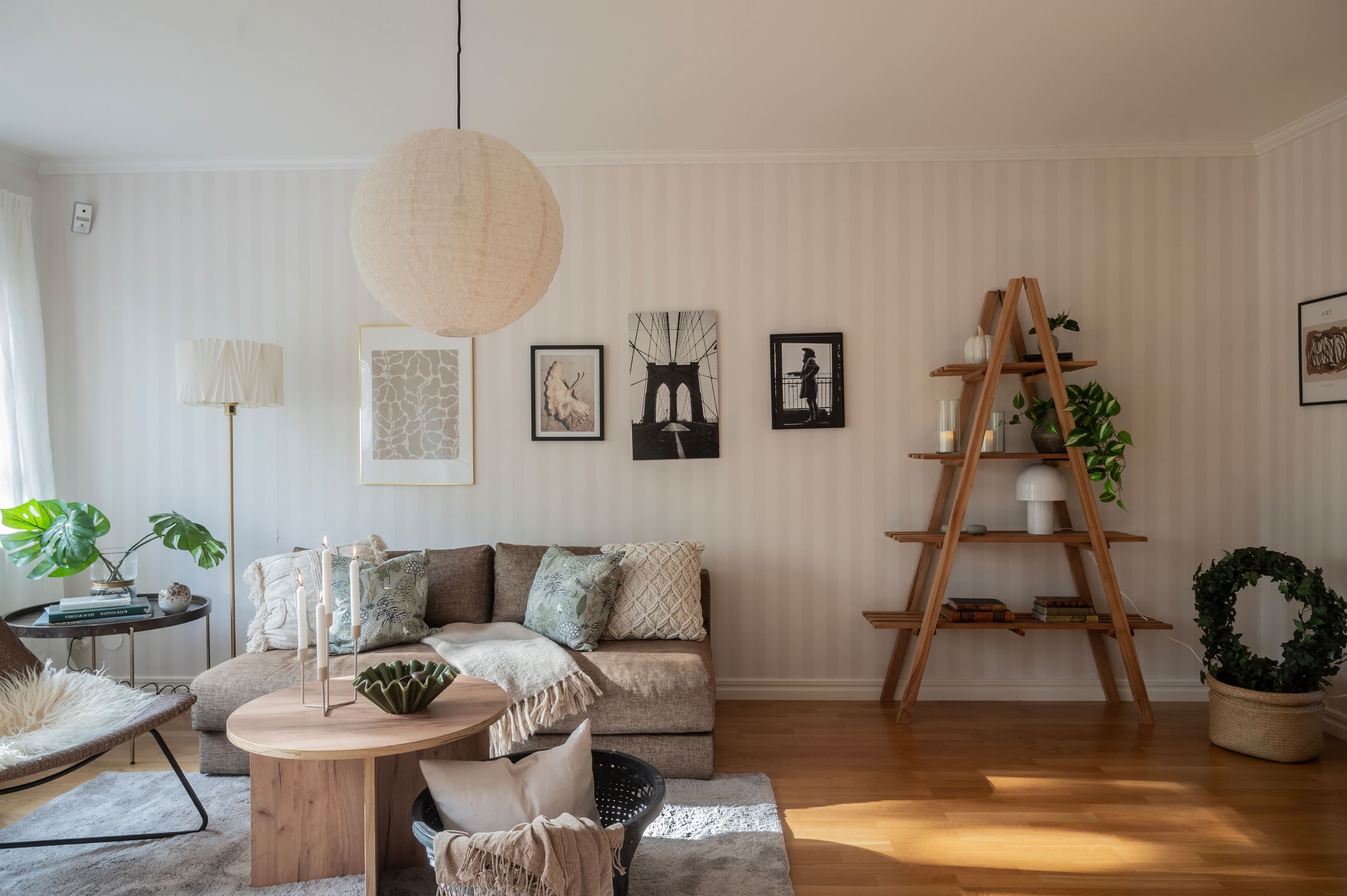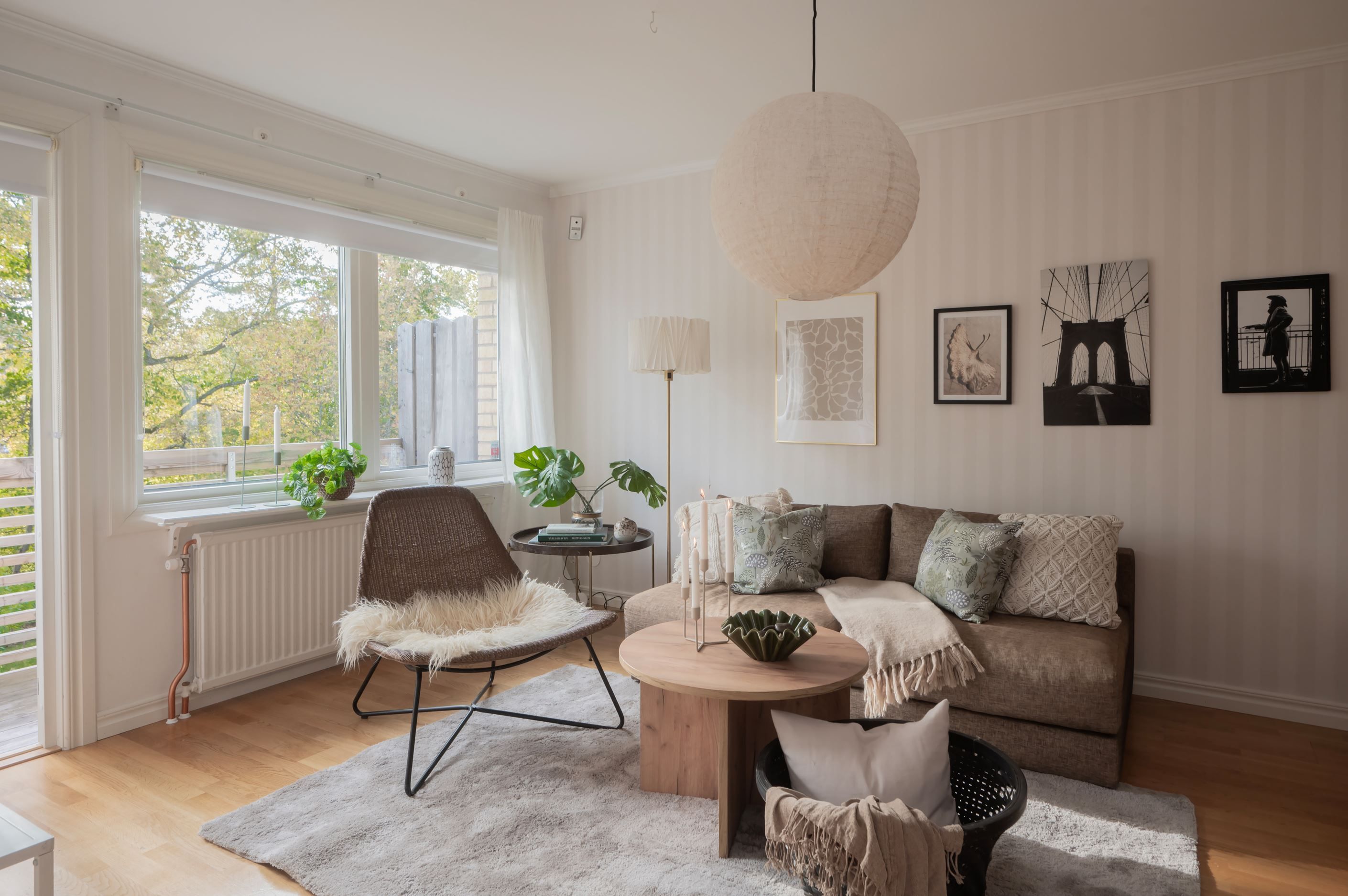 -Ljust vardagsrum i öppen planlösning med matsal
