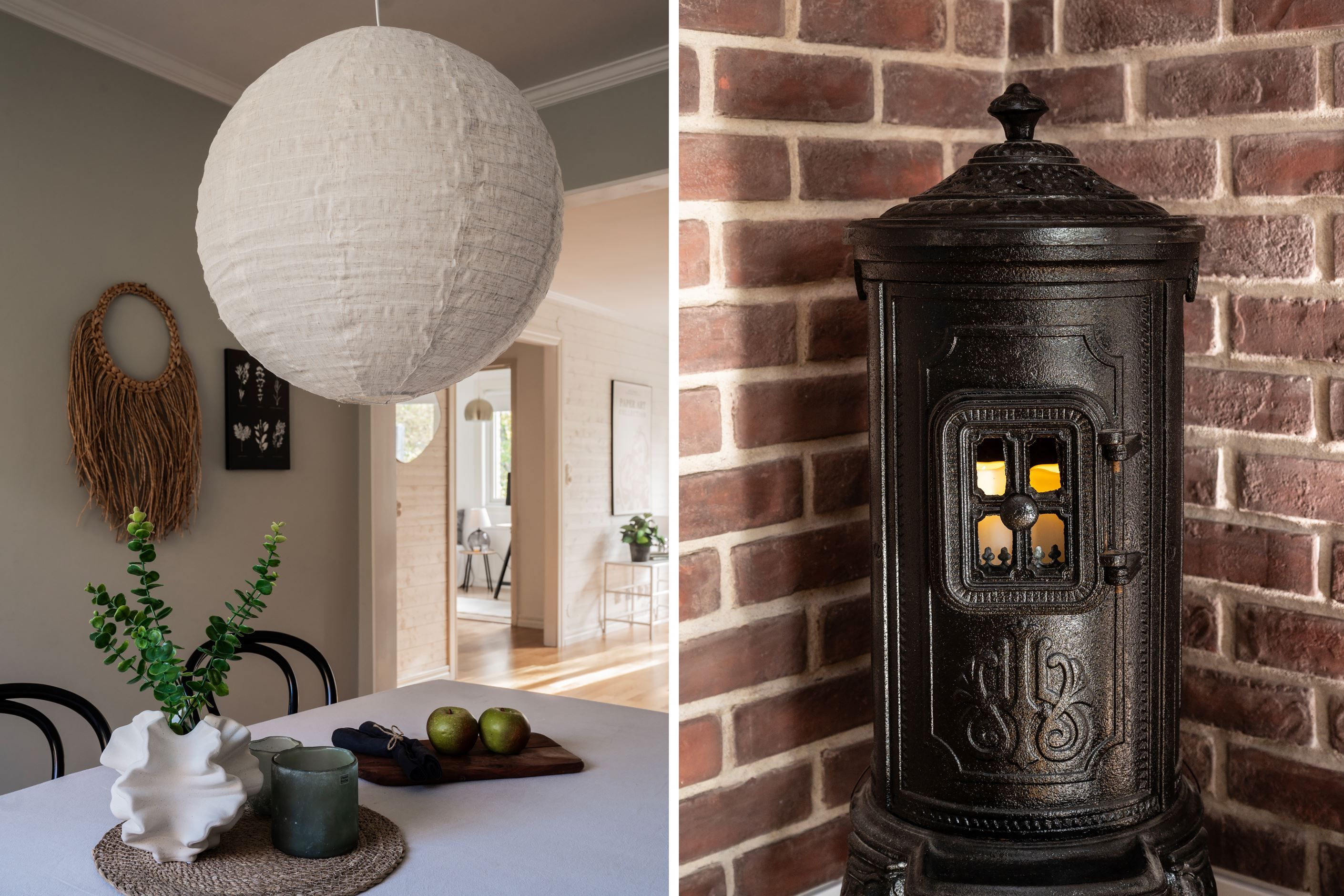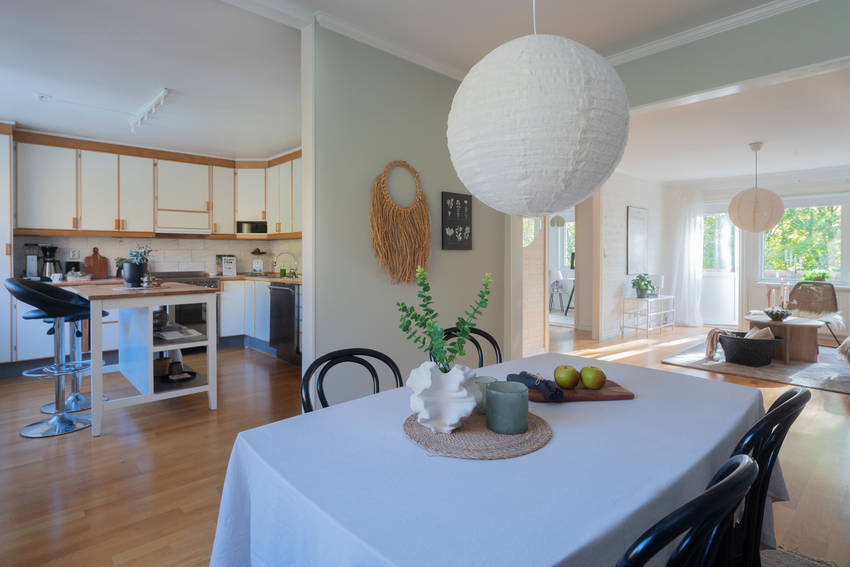På övre plan öppnar bostaden upp sig i ett luftigt vardagsrum i öppen planlösning med matsal – ett rum som flödar av ljus tack vare stora fönsterpartier och utgång till en solig balkong med utsikt över den grönskande tomten. Här finns plats för både avkoppling och umgänge. Ursprungligen var matsalen ett separat rum, vilket enkelt kan återställas vid behov.