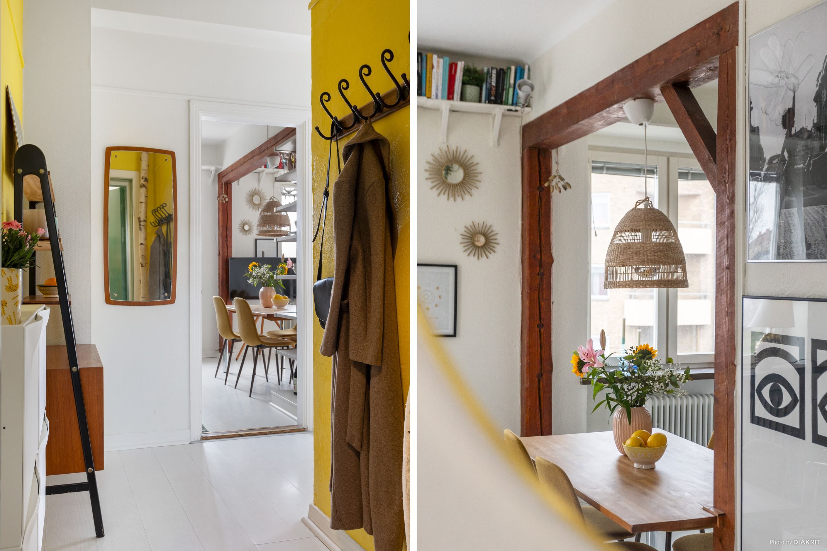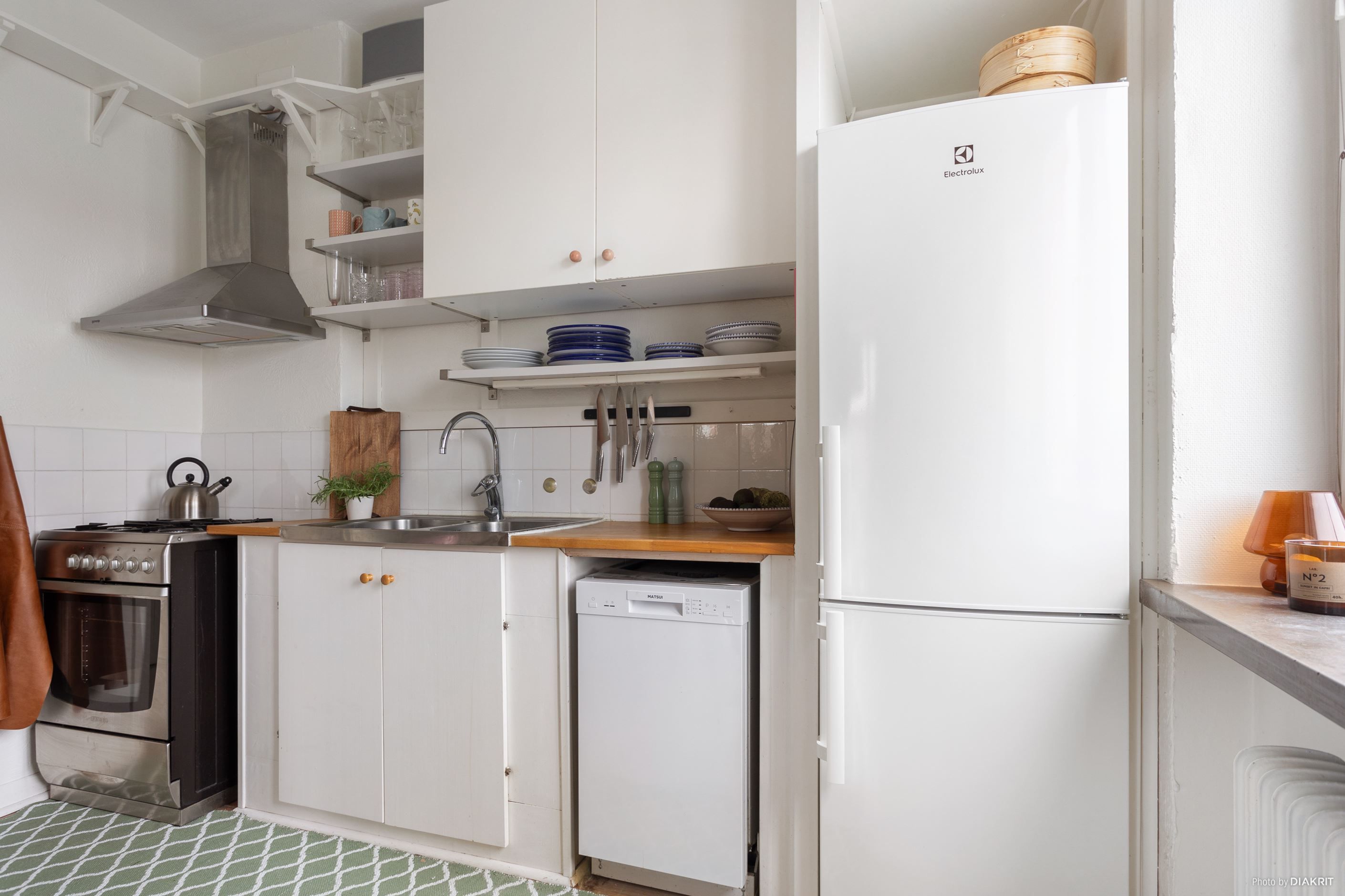 Köket är enkel och funktionellt med vita skåp, spis, fläkt, diskmaskin, kyl/frys, träbänkskiva och bra förvaring. Här finns plats för en liten matplats och fönstret intill ger fint ljus under både vardagsmiddagar och helgfrukostar. Vardagsrummet är lättmöblerat och rymmer både soffa, bord och arbetsplats, och den franska balkongen släpper in rikligt med dagsljus.
