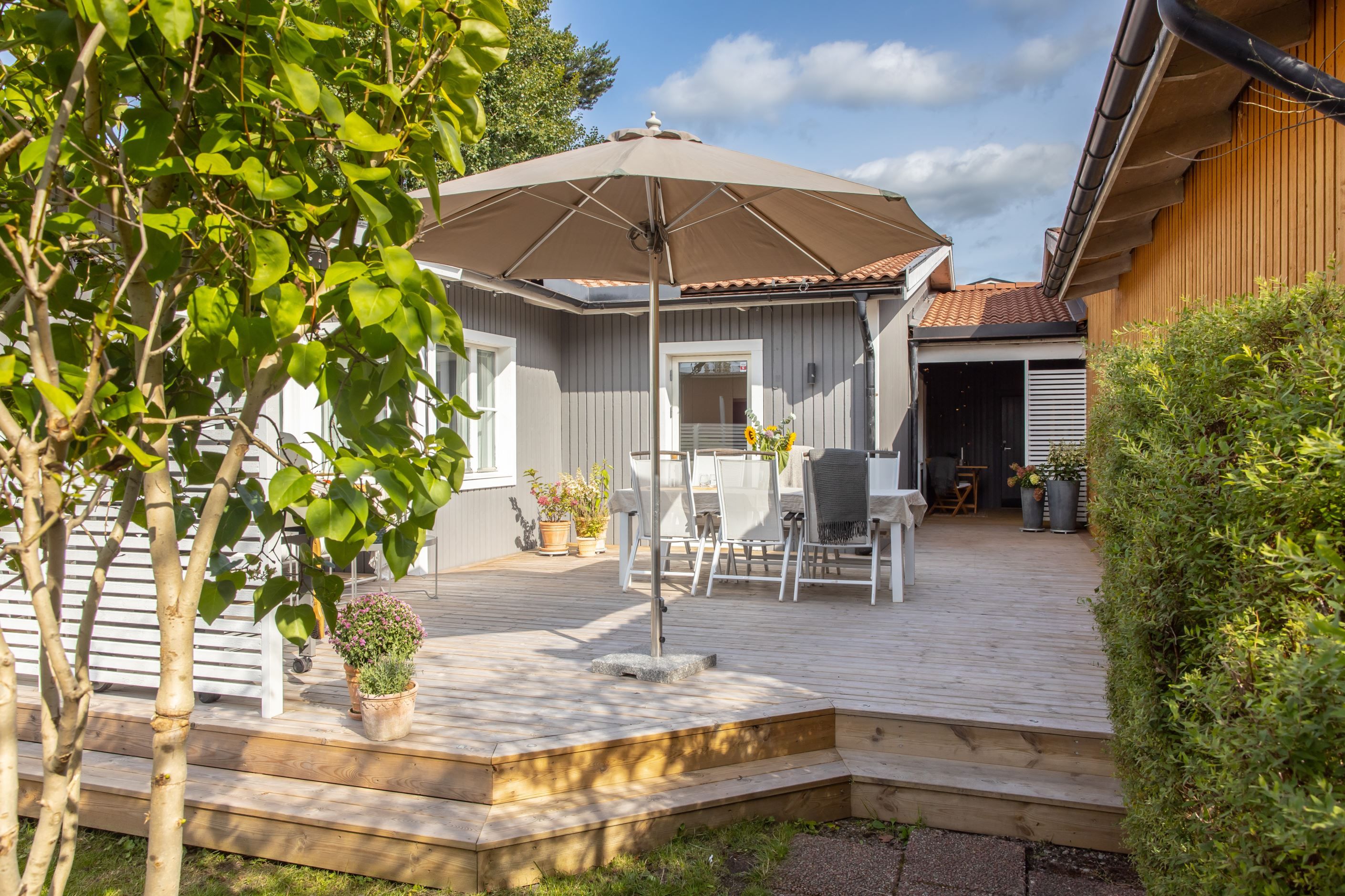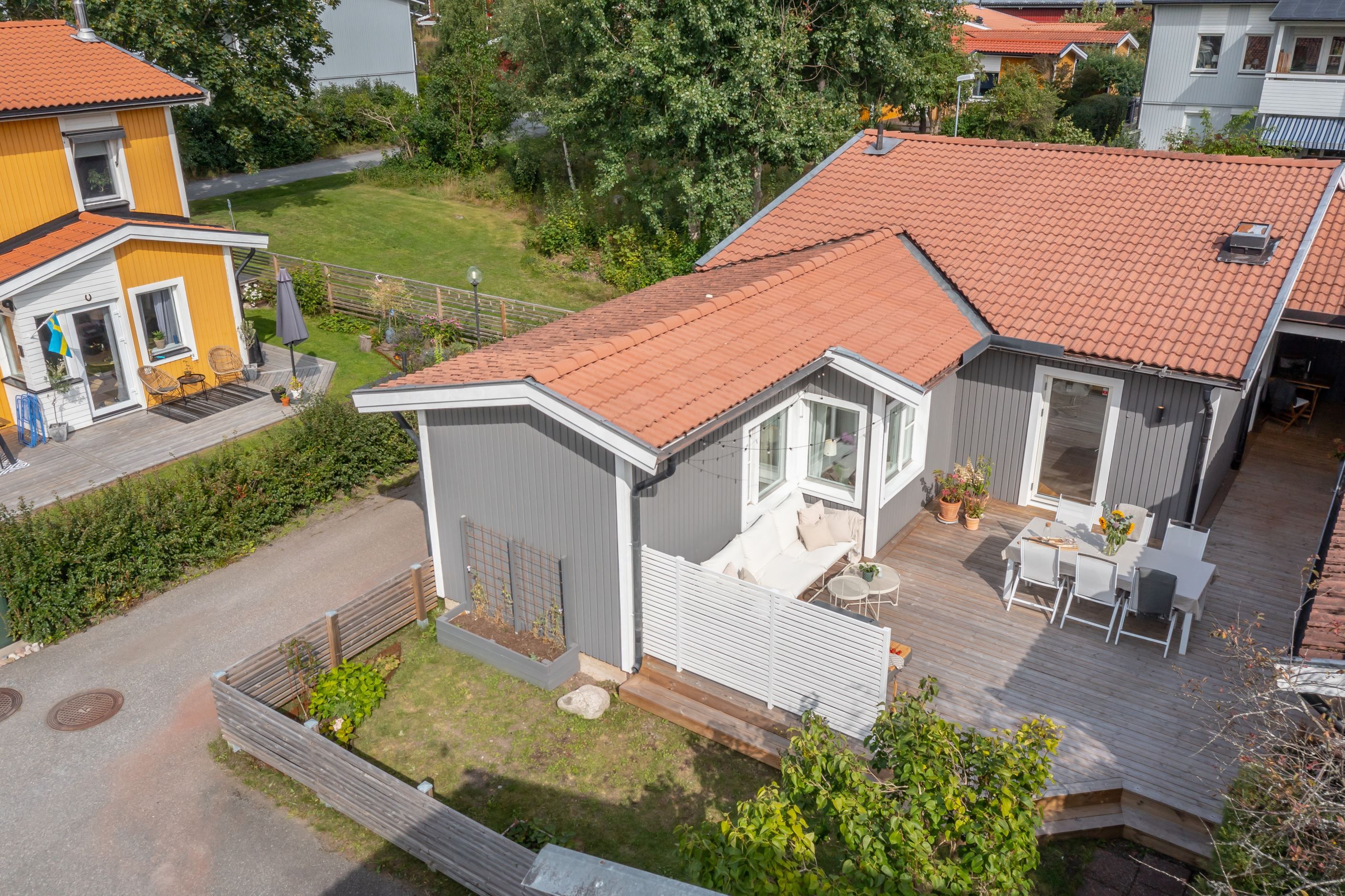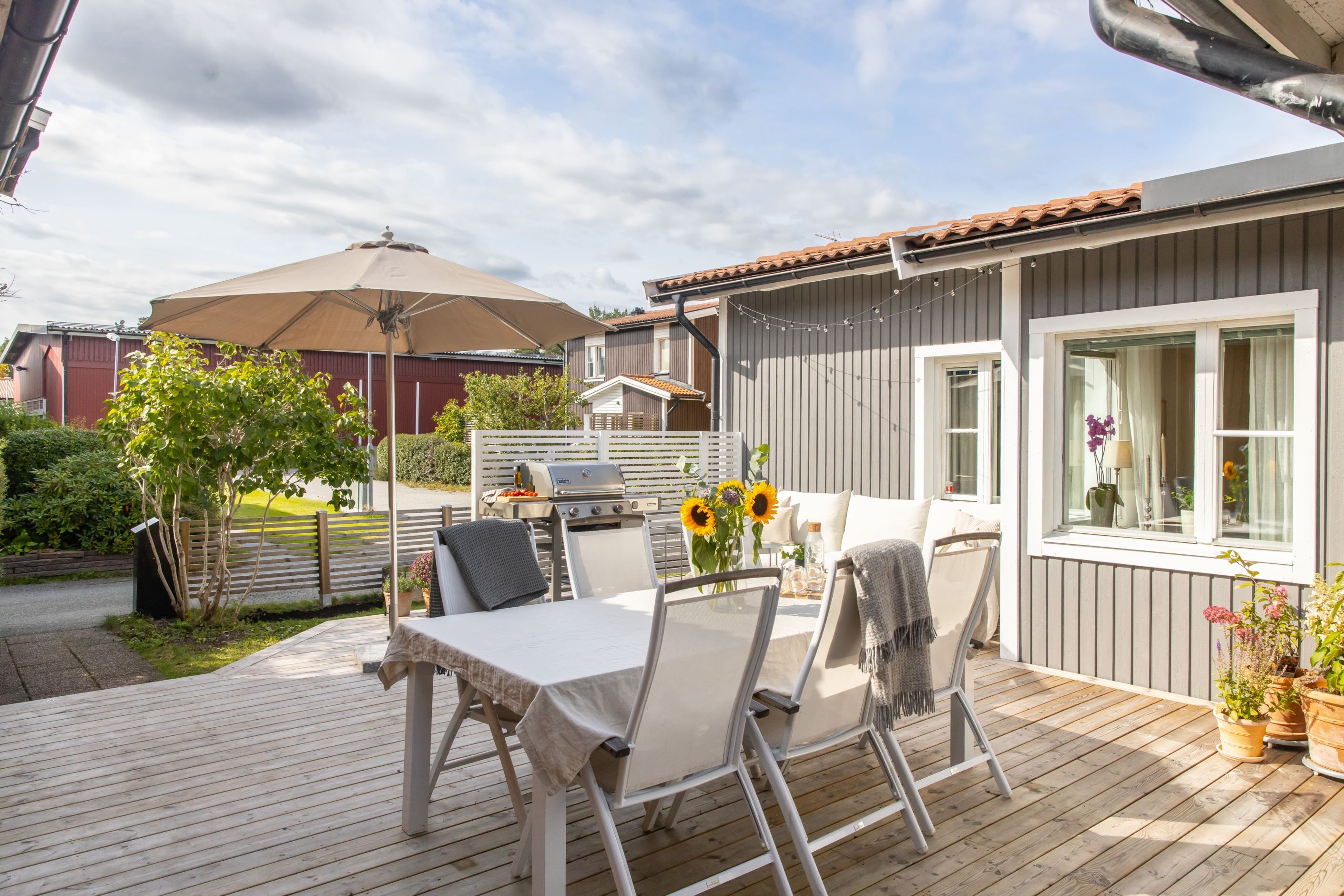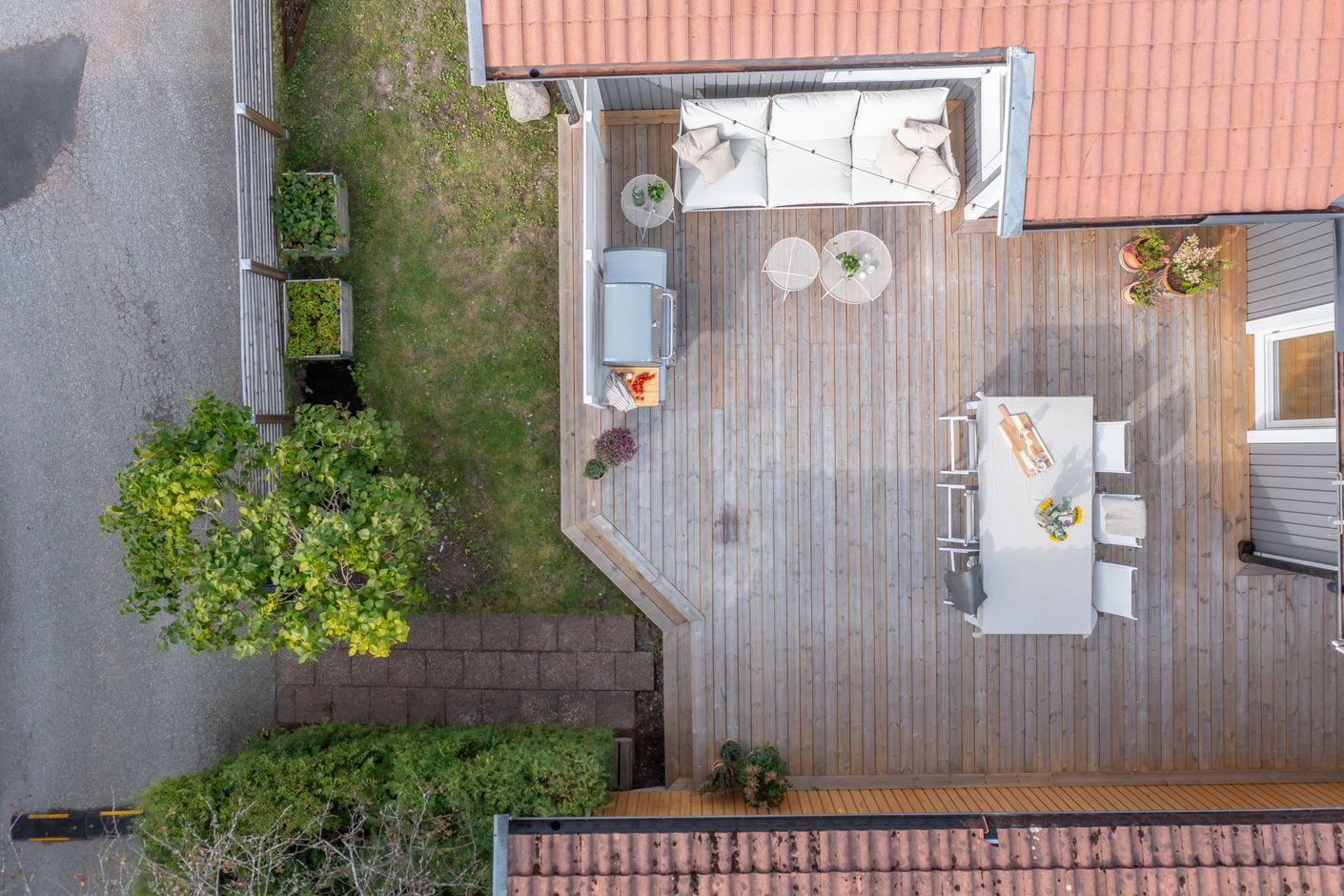 Huset är synnerligen trivsamt planerat med social öppen planlösning mellan kök, matplats och vardagsrum. Från köket ansluter den stora utbyggda altanen i idealiskt syd-västerläge med sol från tidig förmiddag till sen kväll.